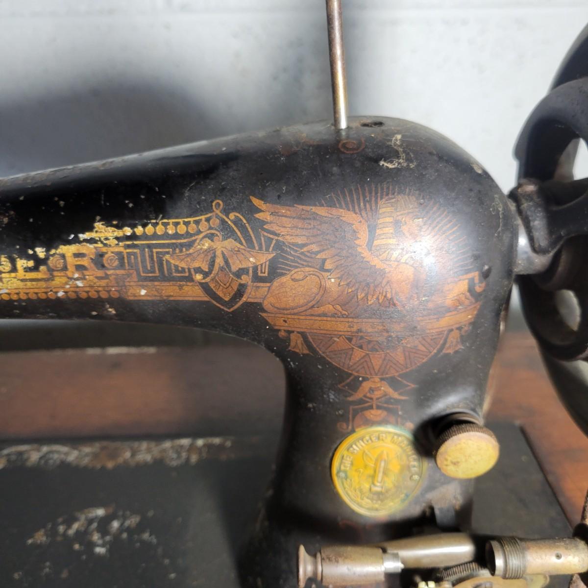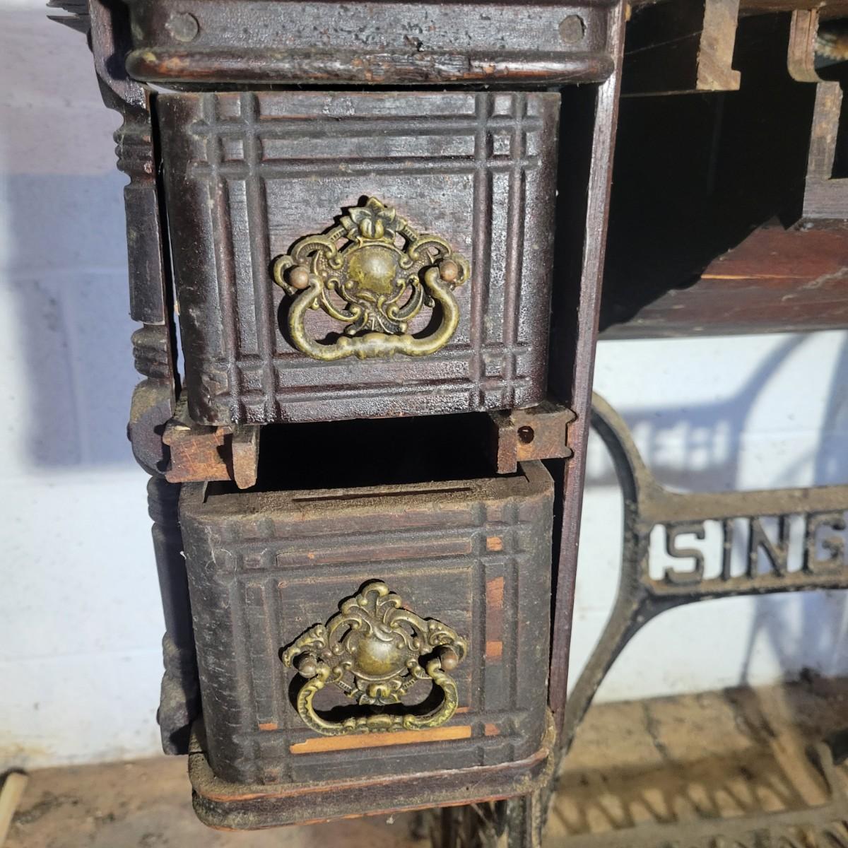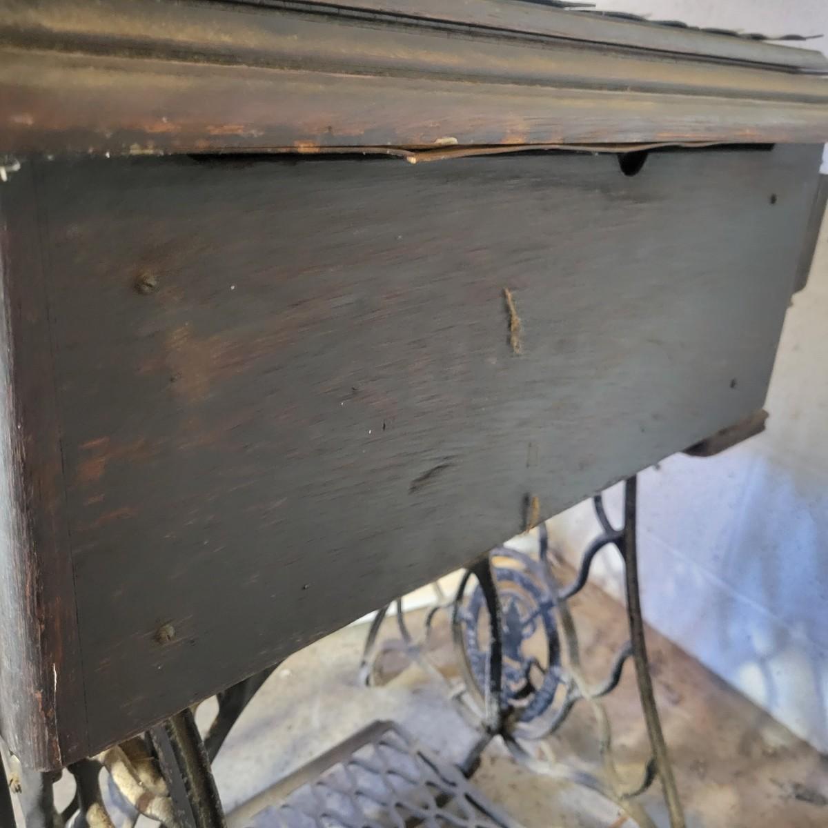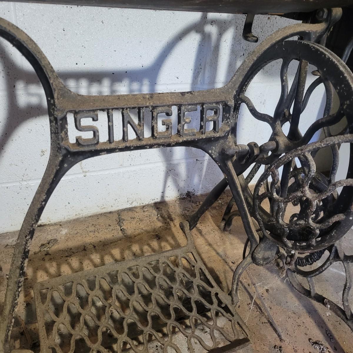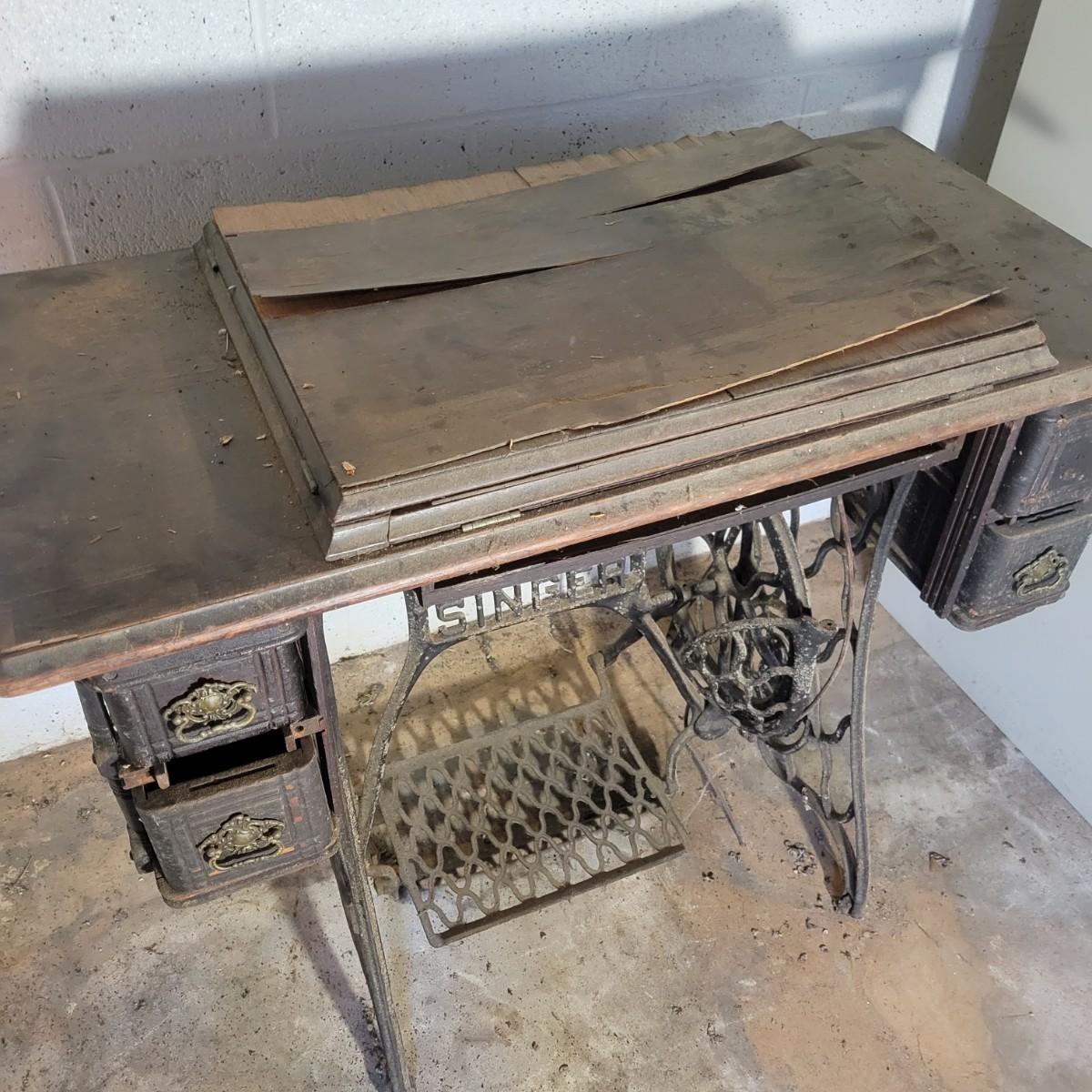 An antique Singer treadle sewing machine and table in poor condition. Unfortunately, the original table is delaminating its veneer, missing pieces and has notable scratches. The sewing machine is in fair condition and appears to still work. Has an ID # of N530487. Includes a wrought-iron treadle base that could easily be refinished. Measures approximately 36.5" x 18" x 31"Local pickup only