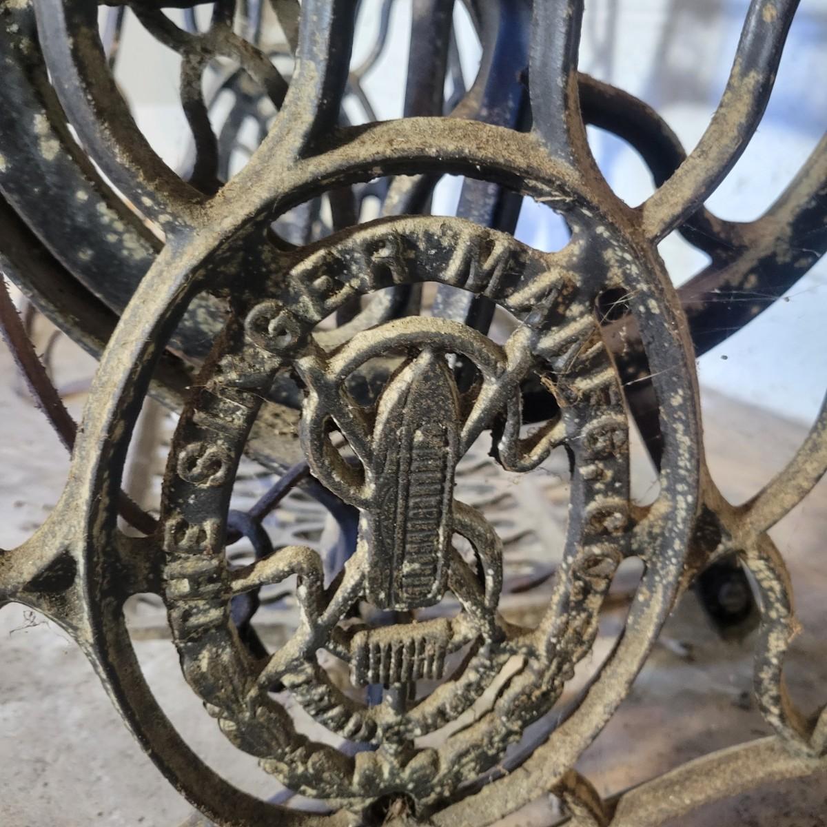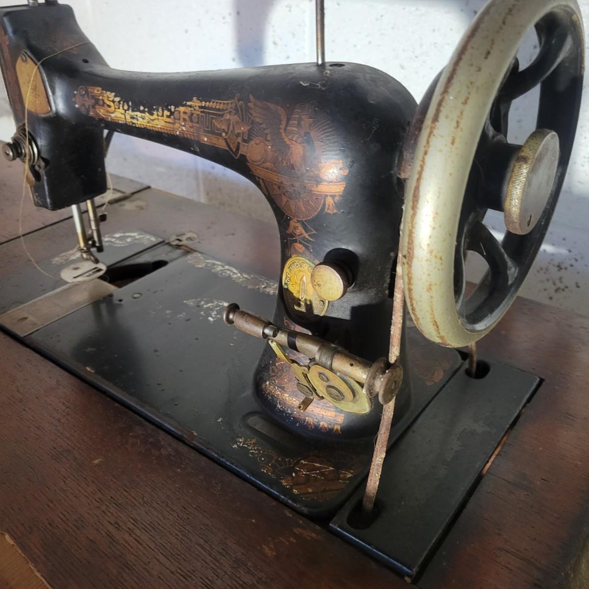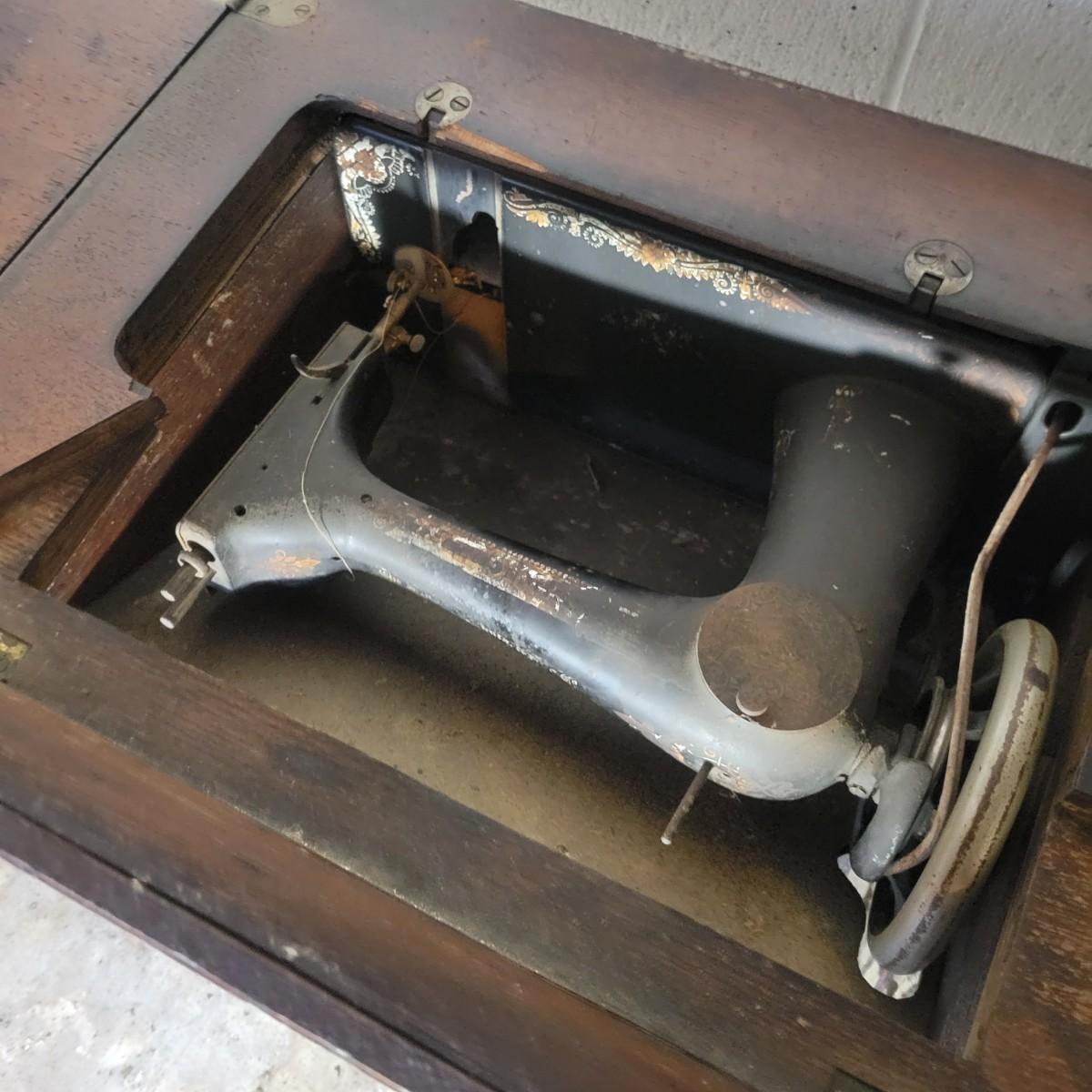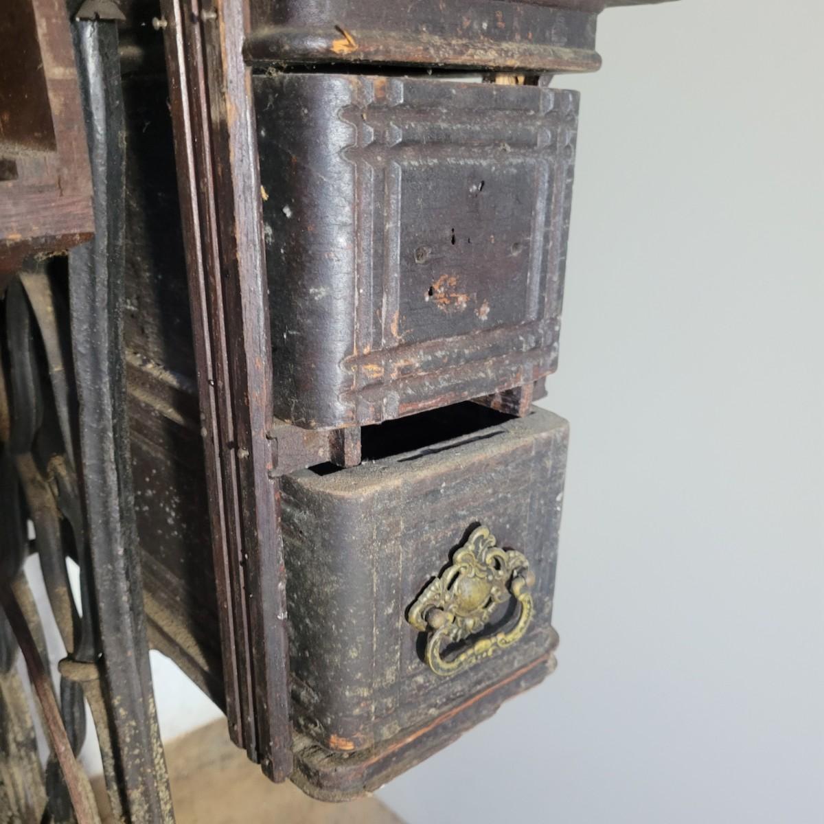 An antique Singer treadle sewing machine and table in poor condition. Unfortunately, the original table is delaminating its veneer, missing pieces and has notable scratches. The sewing machine is in fair condition and appears to still work. Has an ID # of N530487. Includes a wrought-iron treadle base that could easily be refinished. Measures approximately 36.5" x 18" x 31"Local pickup only