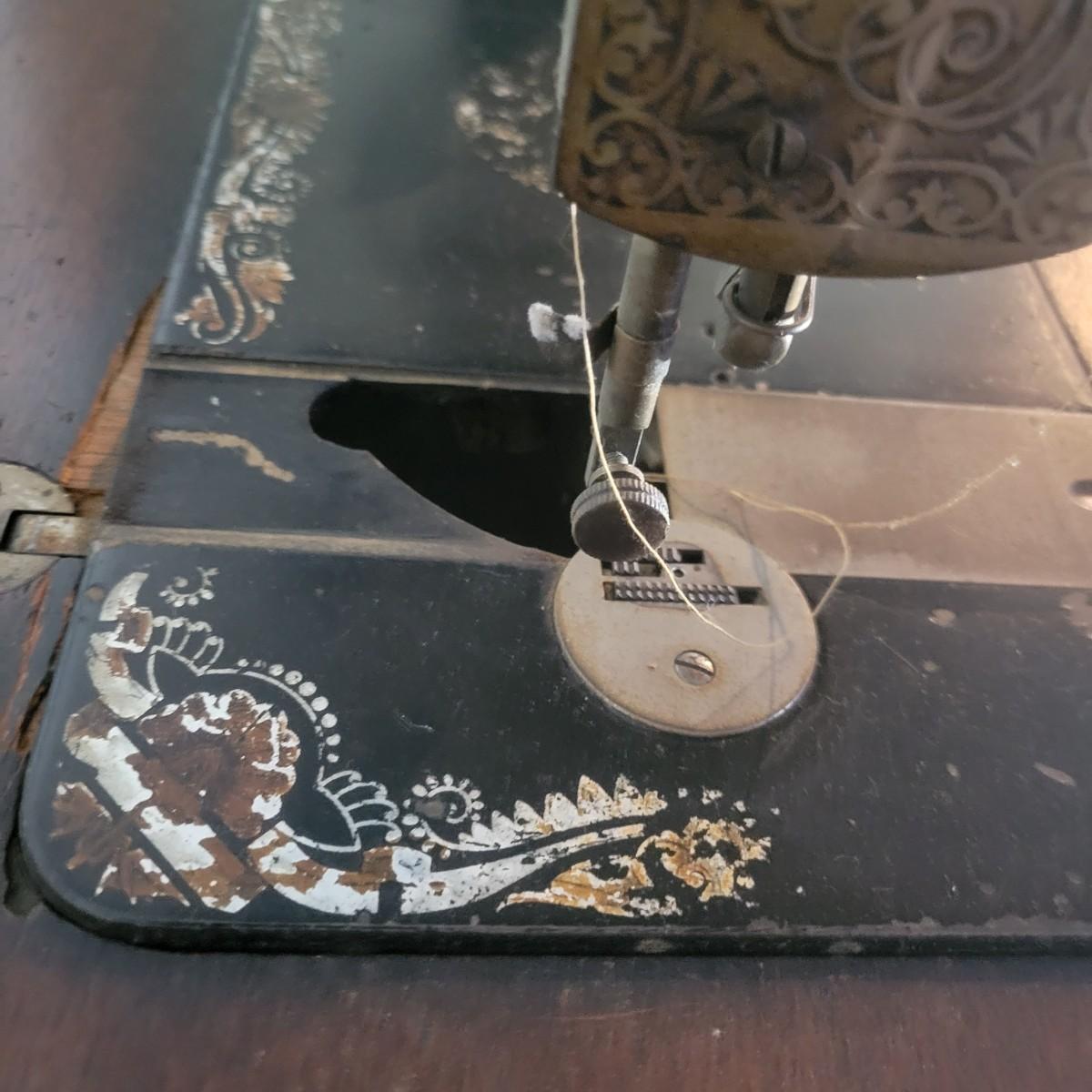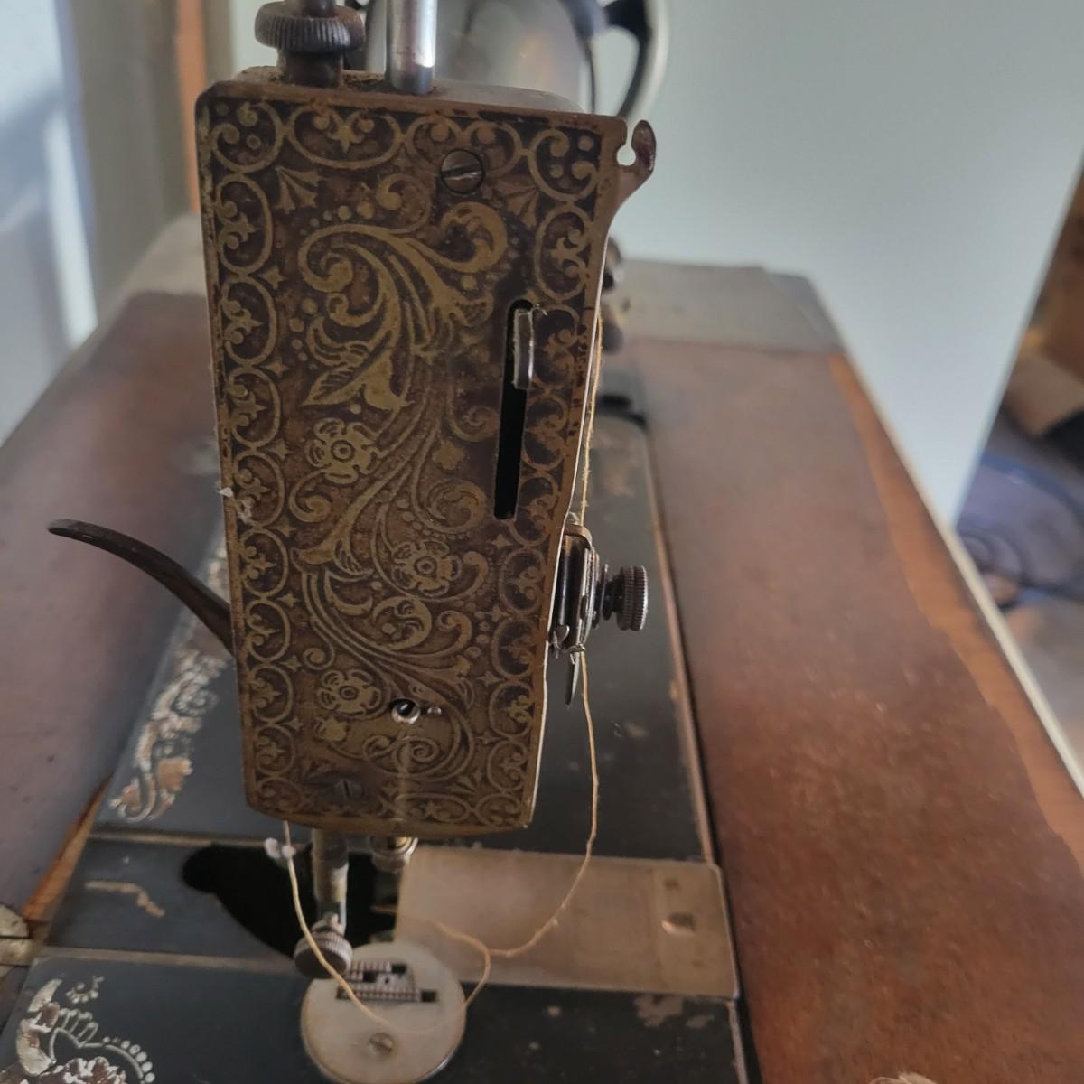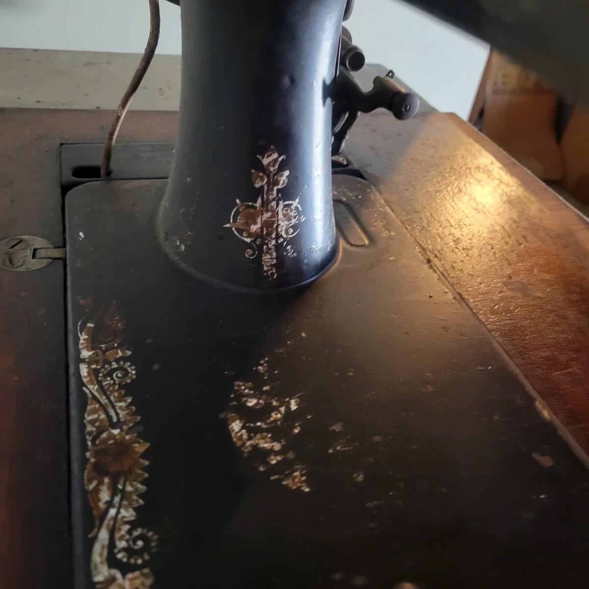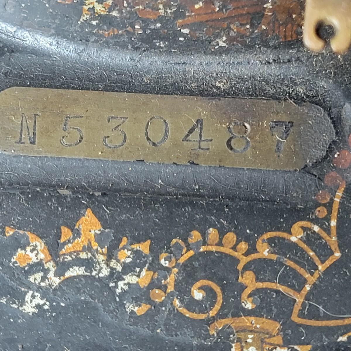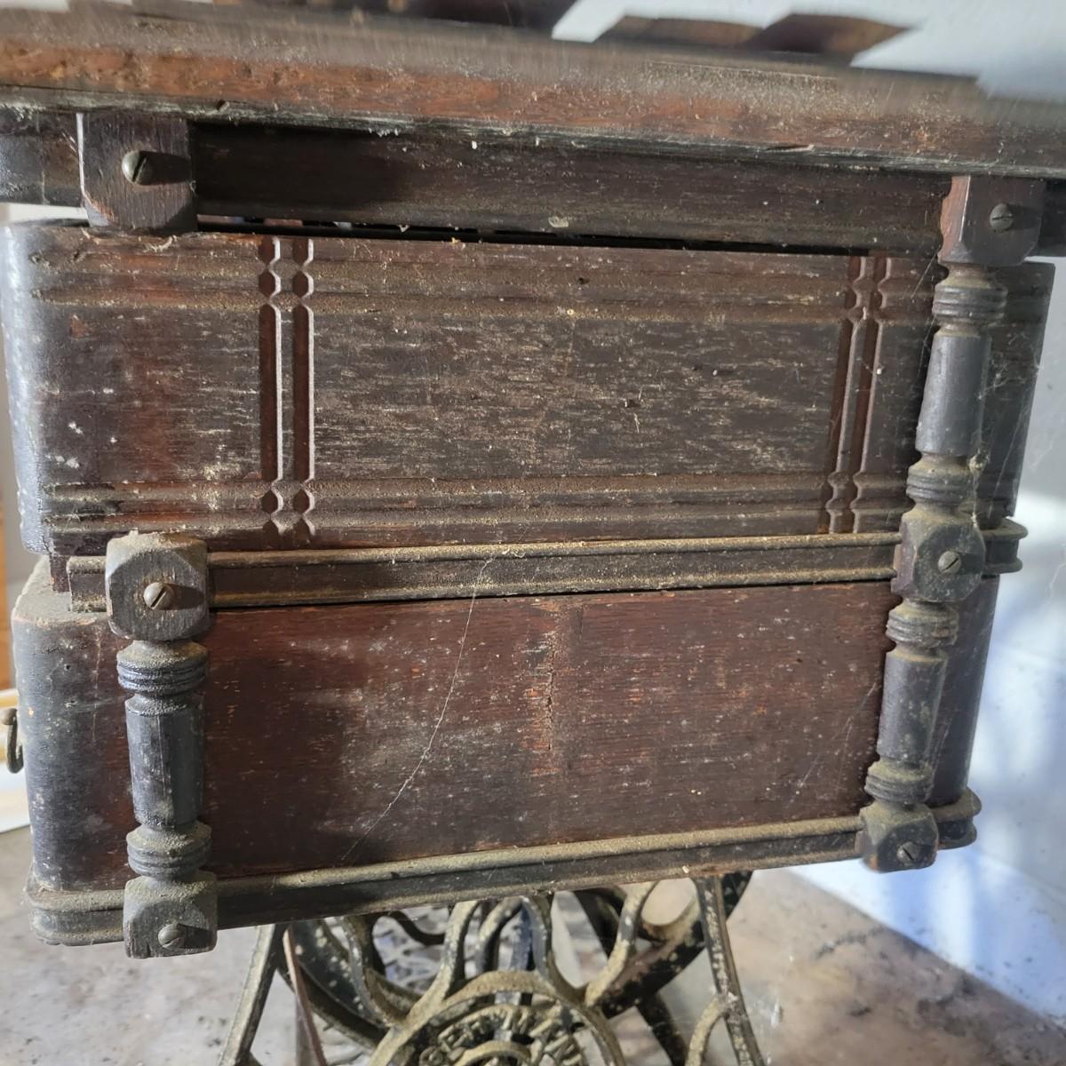 An antique Singer treadle sewing machine and table in poor condition. Unfortunately, the original table is delaminating its veneer, missing pieces and has notable scratches. The sewing machine is in fair condition and appears to still work. Has an ID # of N530487. Includes a wrought-iron treadle base that could easily be refinished. Measures approximately 36.5" x 18" x 31"Local pickup only