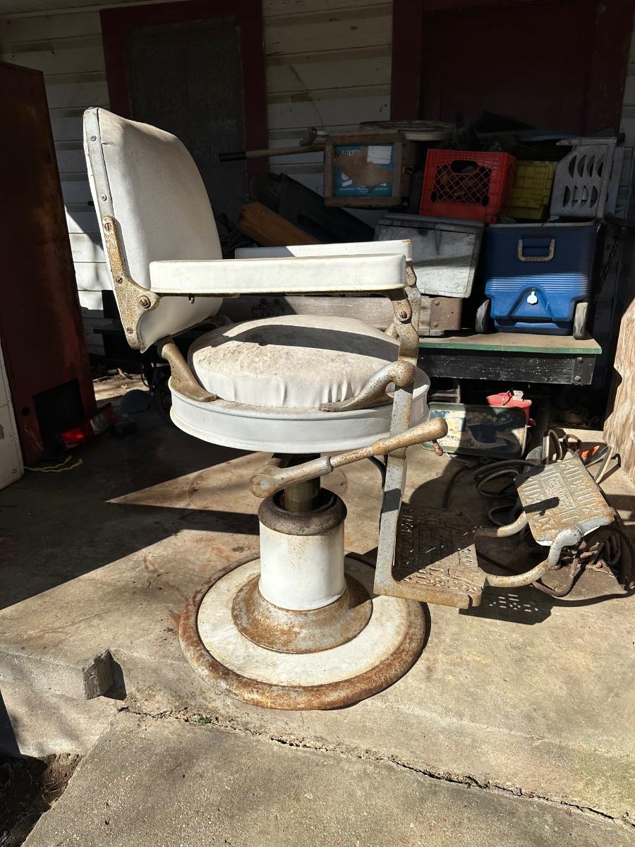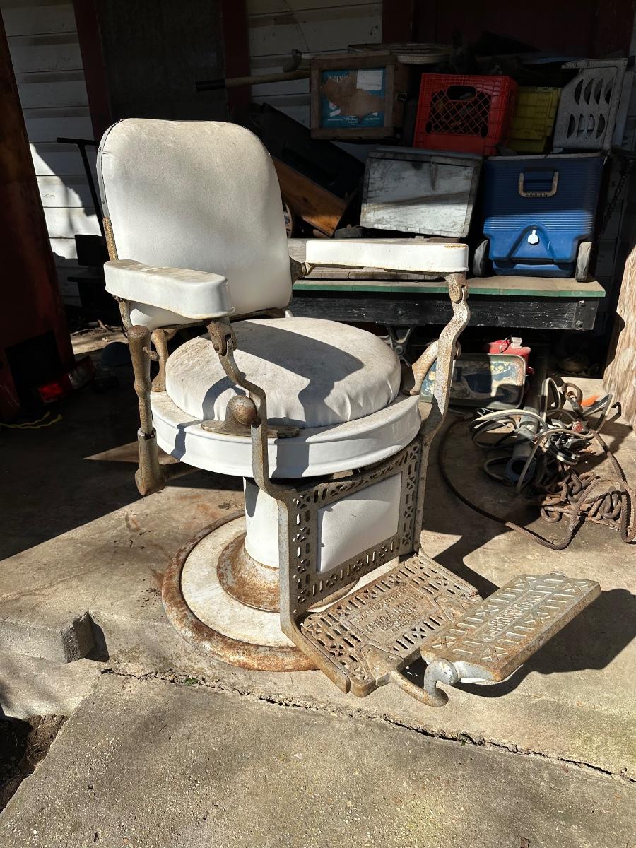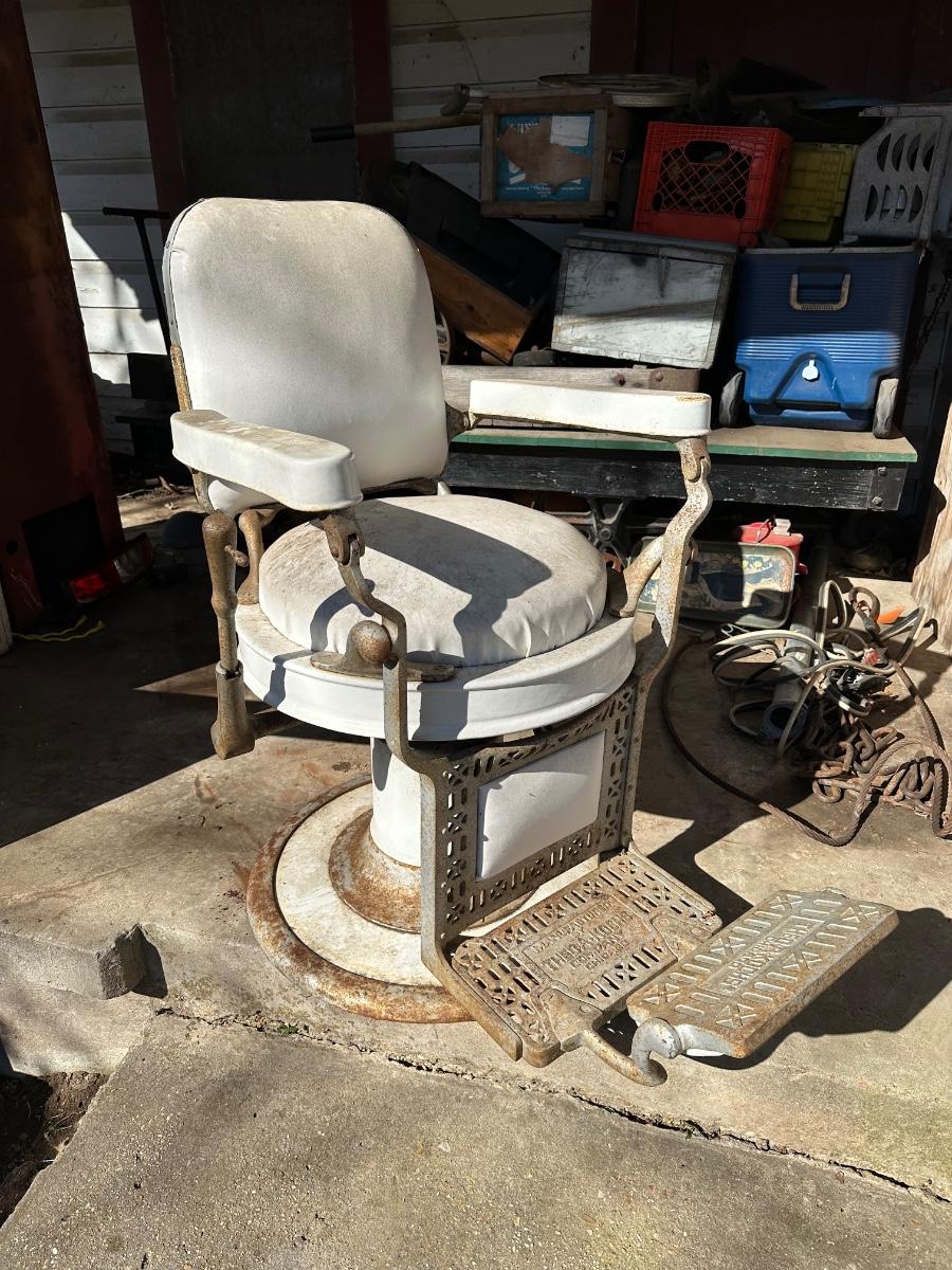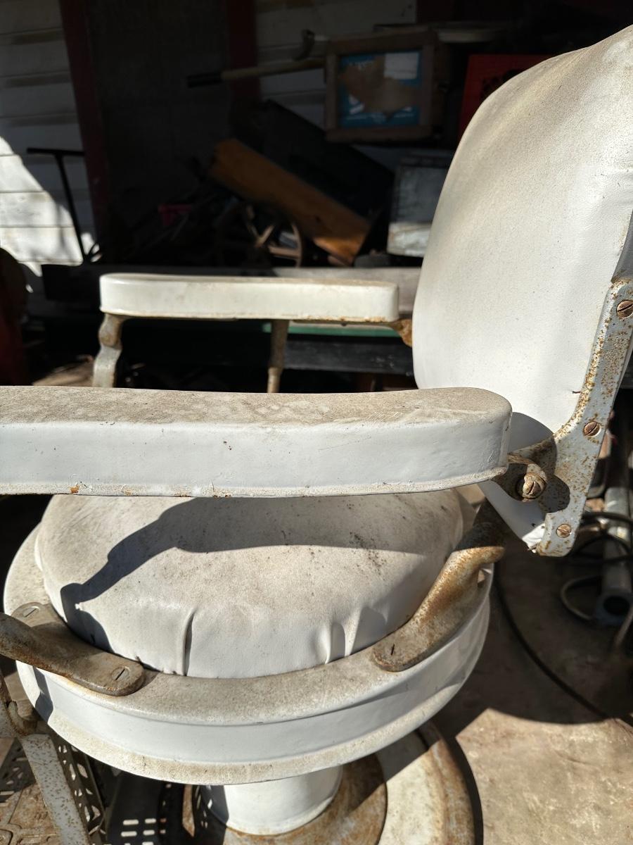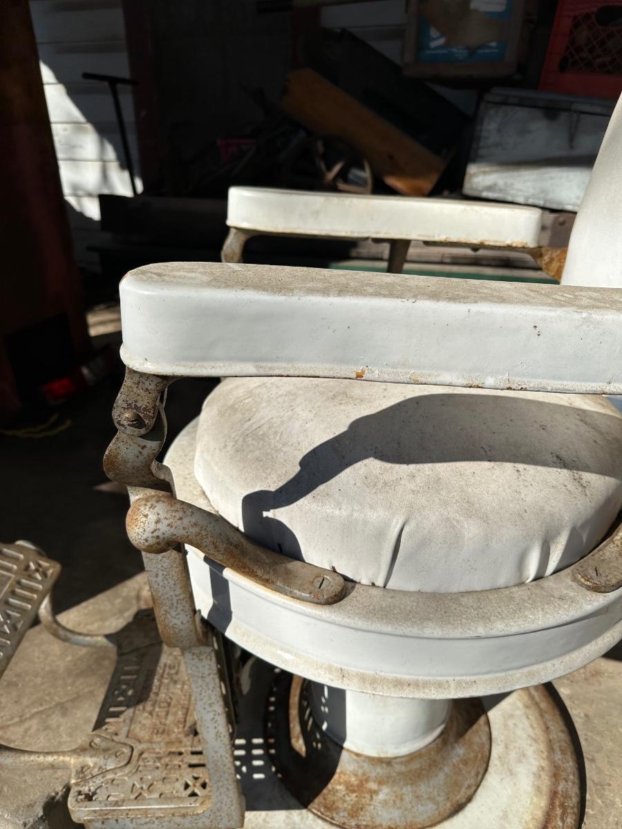 Early 1900’s Antique Cast-Iron Barber Chair w/ Footrest – The Dazey Company – Industrial Barber Shop Chair