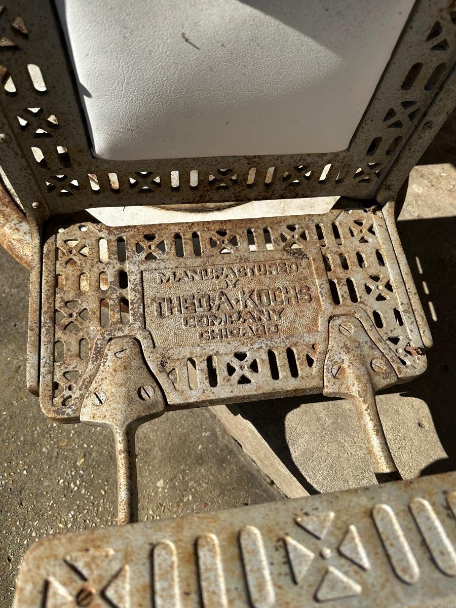 This chair retains its original cast-iron base and mechanisms with naturally aged patina. The footrest is clearly marked “Manufactured by The Dazey Company”, confirming originality. Upholstery appears to be later vinyl or replacement material, showing age, wear, and use. Chair swivels and adjusts manually; hydraulic jack works well, raises and lowers with no issues.