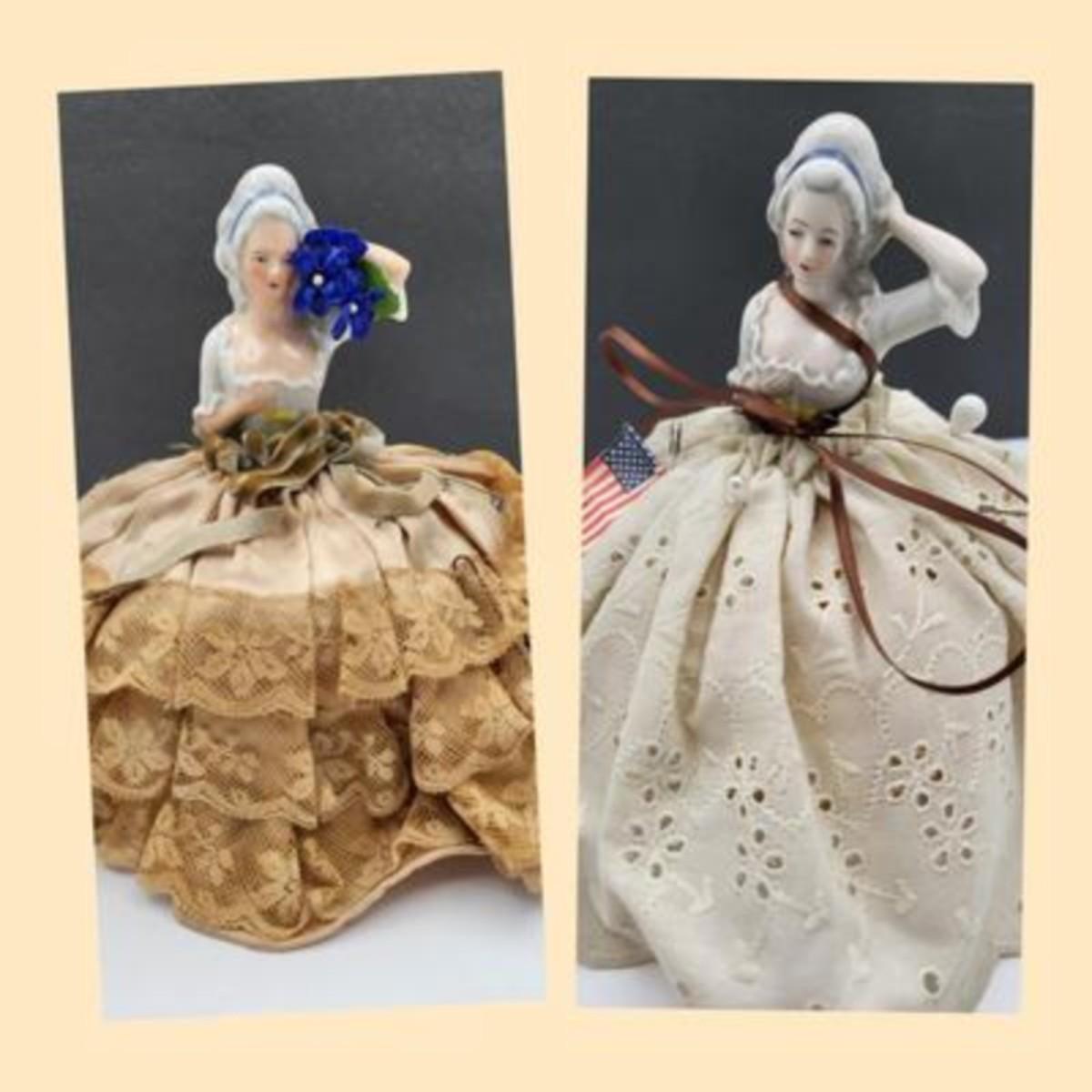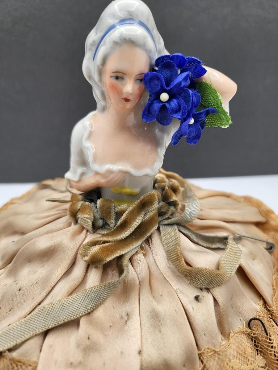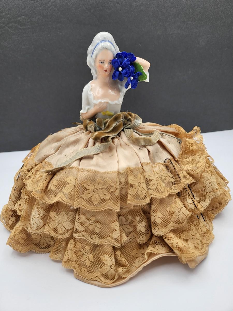Glazed porcelain woman holding blue flowers, delicate beige lace dress & velvet ribbon, pin cushion. The other with handmade linen skirt. Some straight pins & safety pins. Found as-is. Both measure measures 7" tall x 5" diameter cushion base. Porcelain is in very nice shape. Normal wear due to their age.