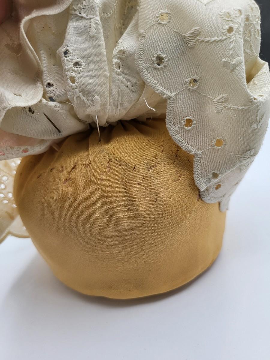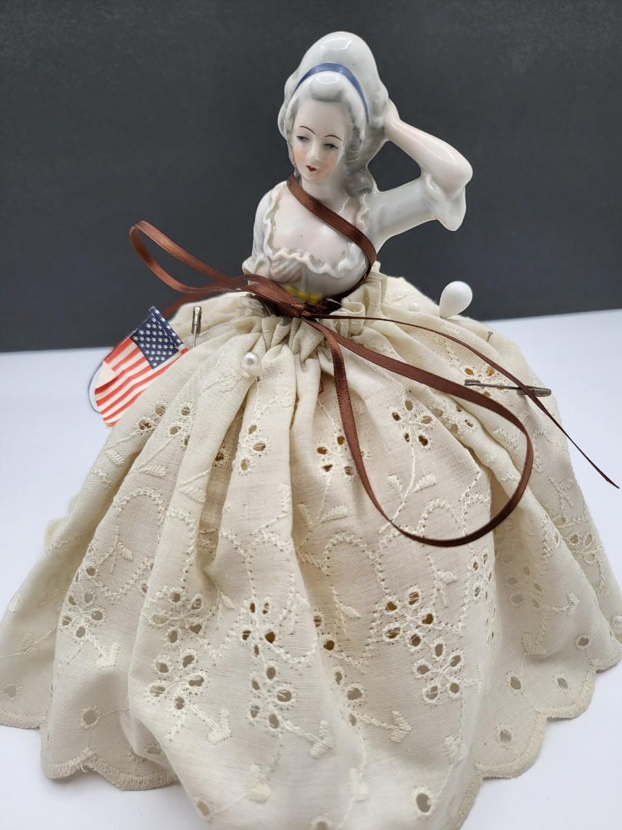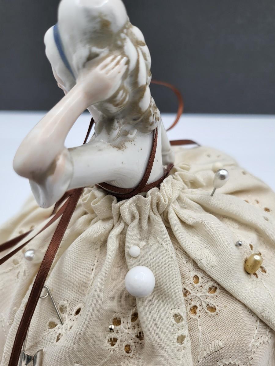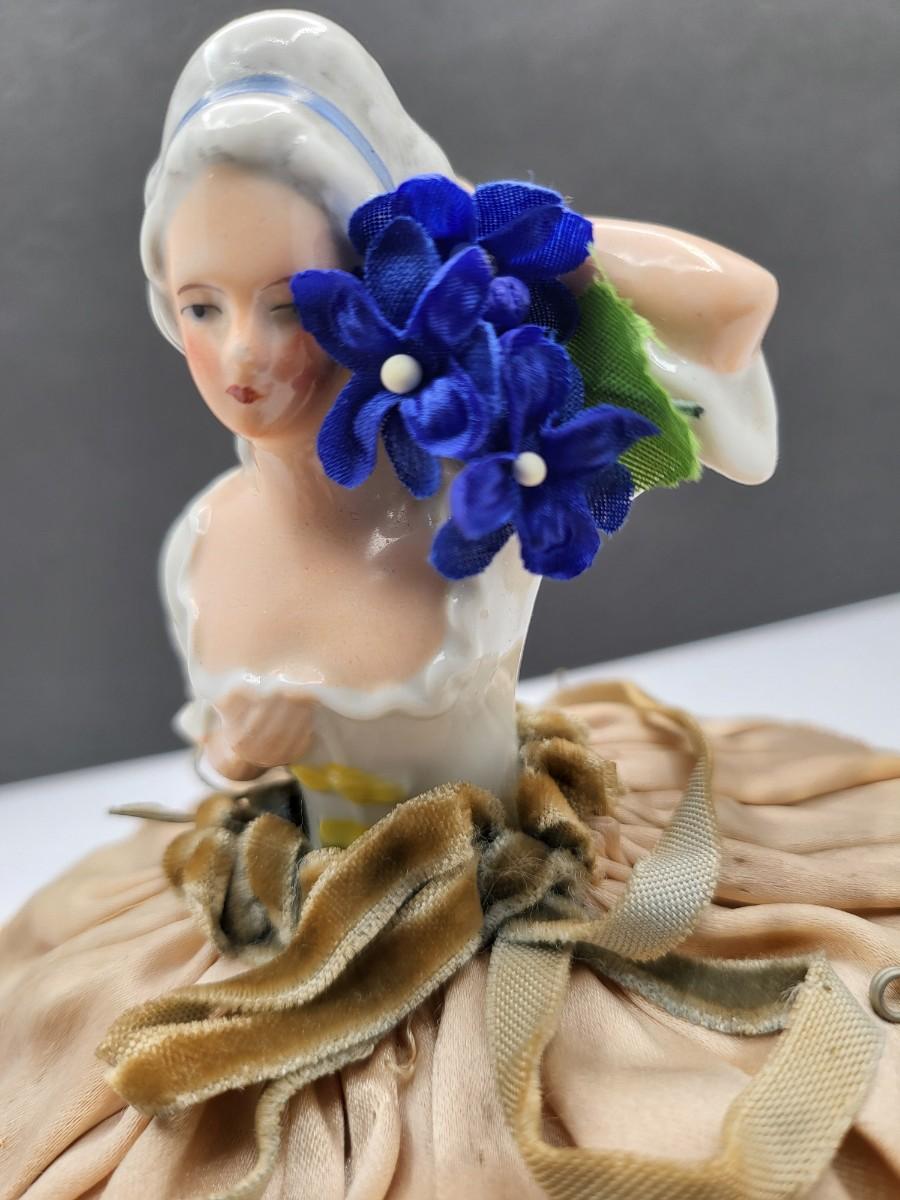 Glazed porcelain woman holding blue flowers, delicate beige lace dress & velvet ribbon, pin cushion. The other with handmade linen skirt. Some straight pins & safety pins. Found as-is. Both measure measures 7" tall x 5" diameter cushion base. Porcelain is in very nice shape. Normal wear due to their age.