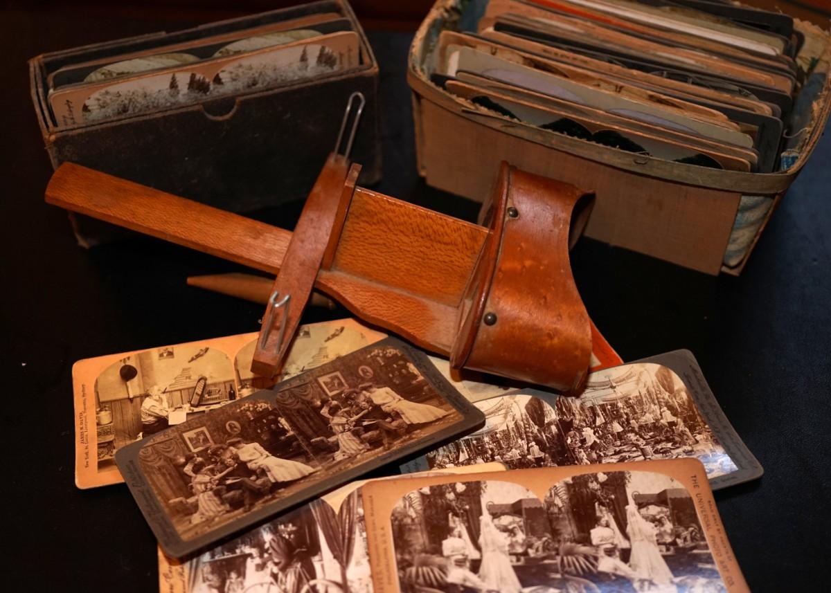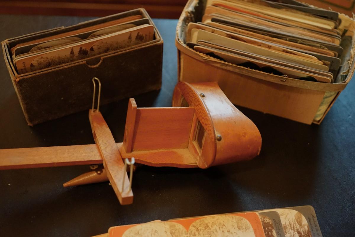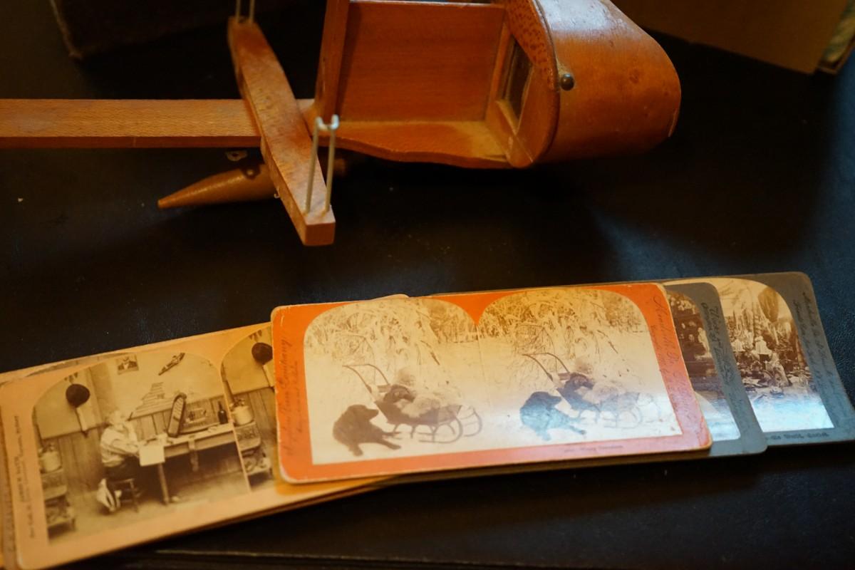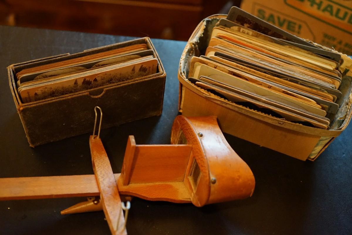EARLY 1900'S BIRDS EYE MAPLE STEREO OPTIC VIEWER W/CARDS ( 40 )