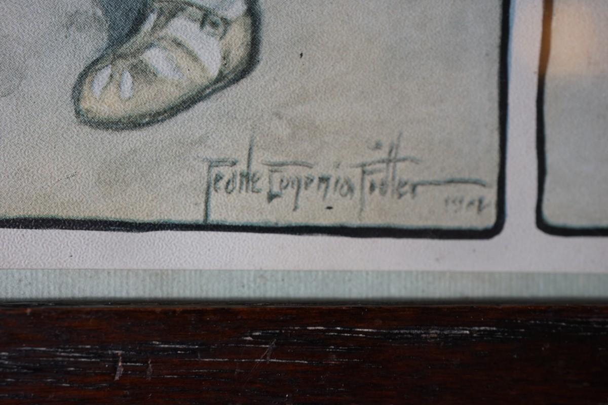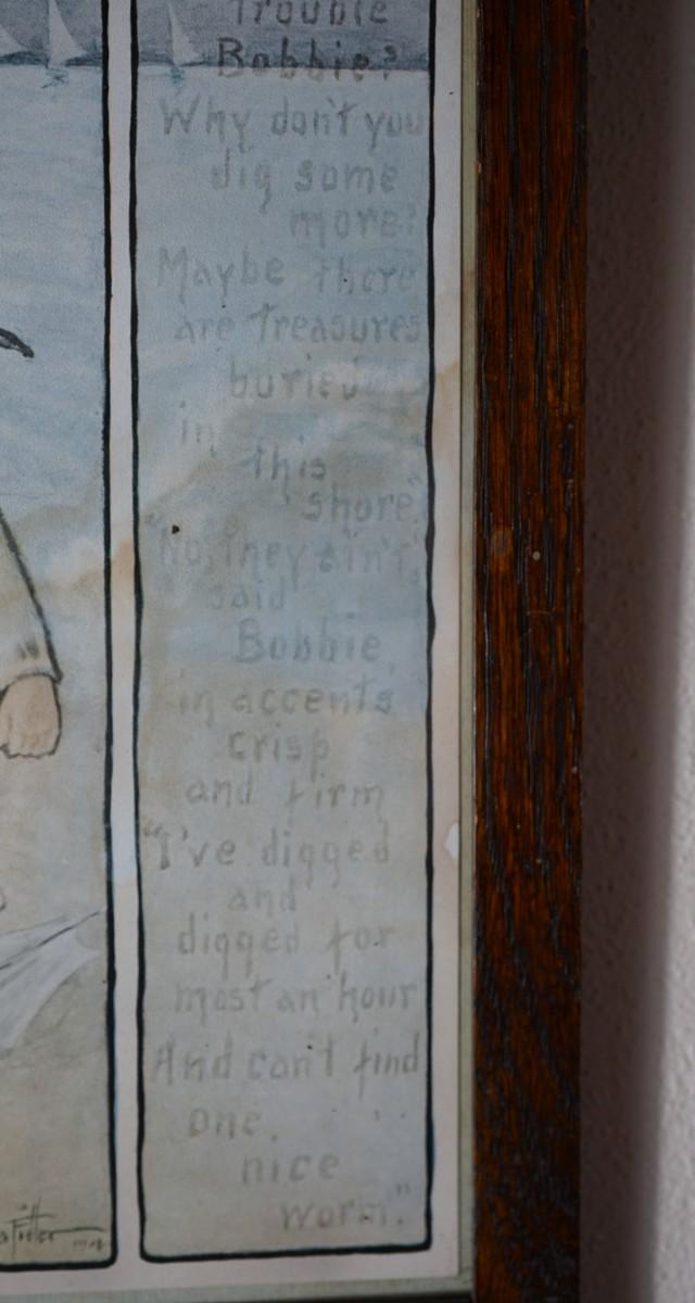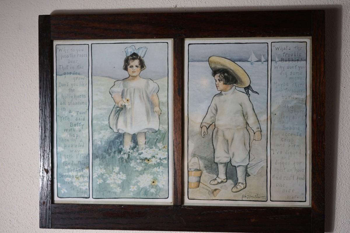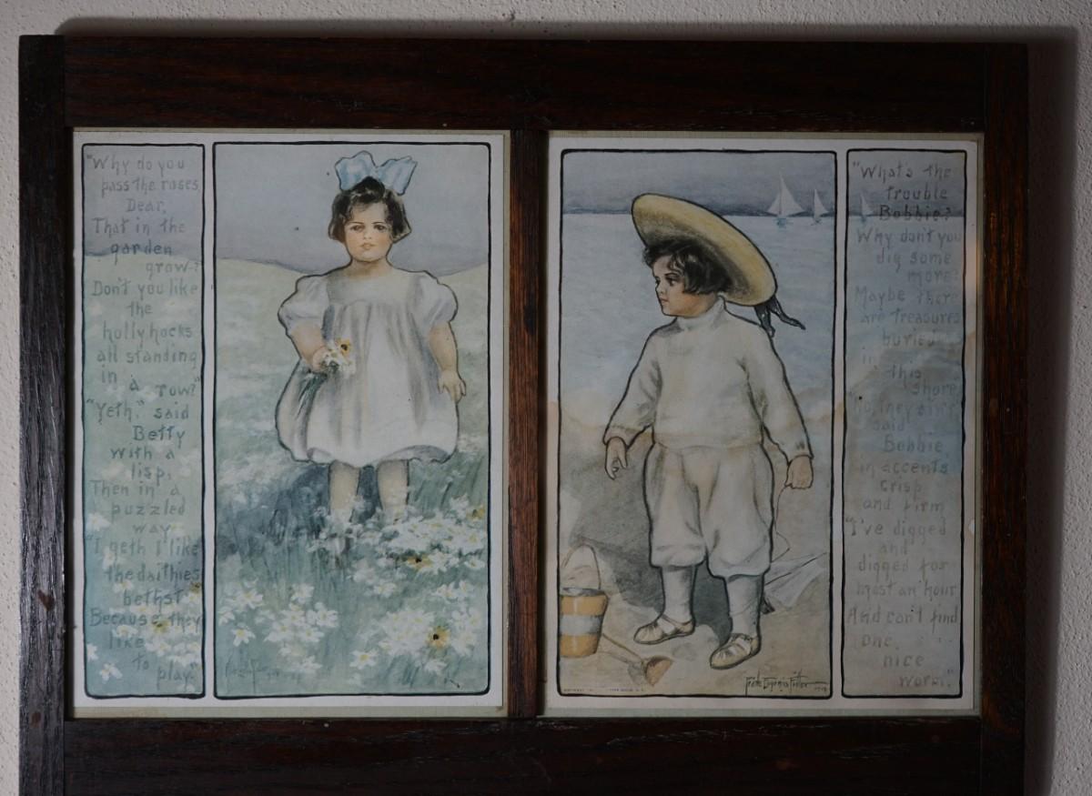 EARLY 1900'S DOUBLE ILLUSTRATION BY PEARLE EUGENIA FIDLER - CHILDREN AT BEACH PRINT IN OAK FRAME W/ VERSE