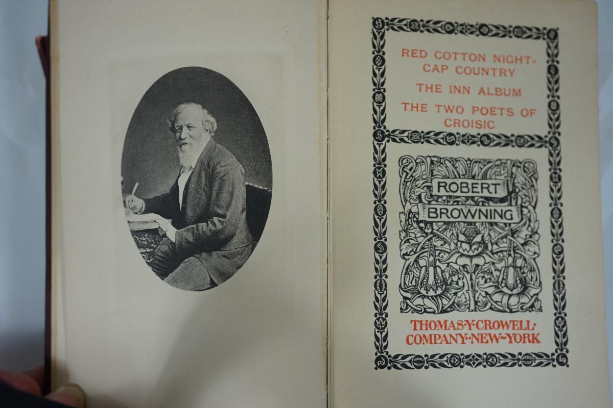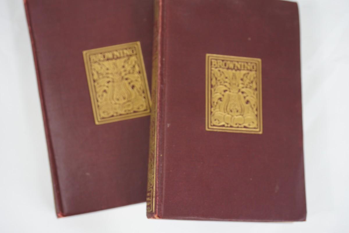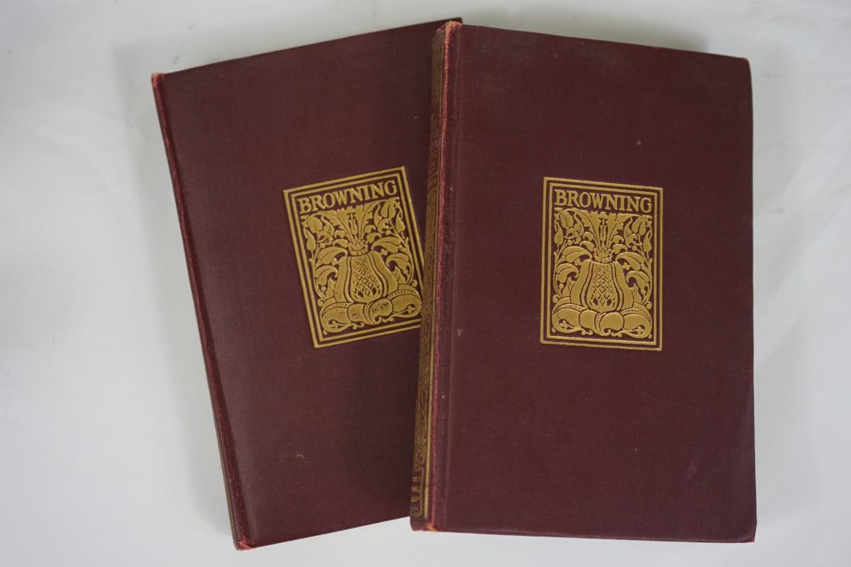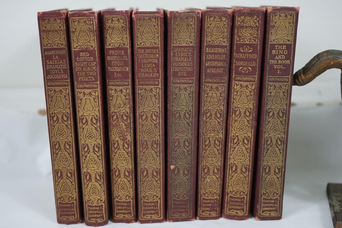 eight leather bound books of Browning writings . ( fair to good condition) some discoloration to the edge of pages. some binding seperation but minor