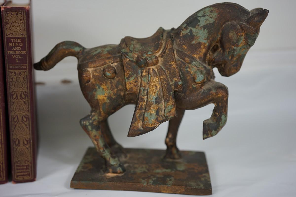 EARLY 1900'S LEATHER BOUND BOOK SET BROWING (8) & METAL TANG JAPANESE STYLE HORSE OF 6"