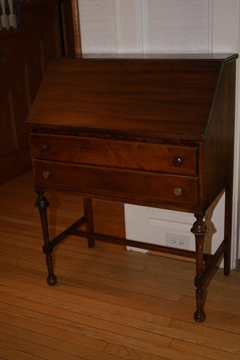 EARLY 1900'S MAHOGANY DROP FRONT WRITING DESK W/ TWO DRAWERS/ TRUMPET TURNED LEGS