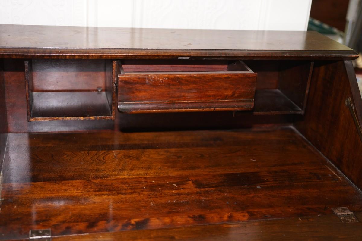 The desk drops down and has cubbies and drawer in the interior to store writing supplies. and area to write notes etc.
