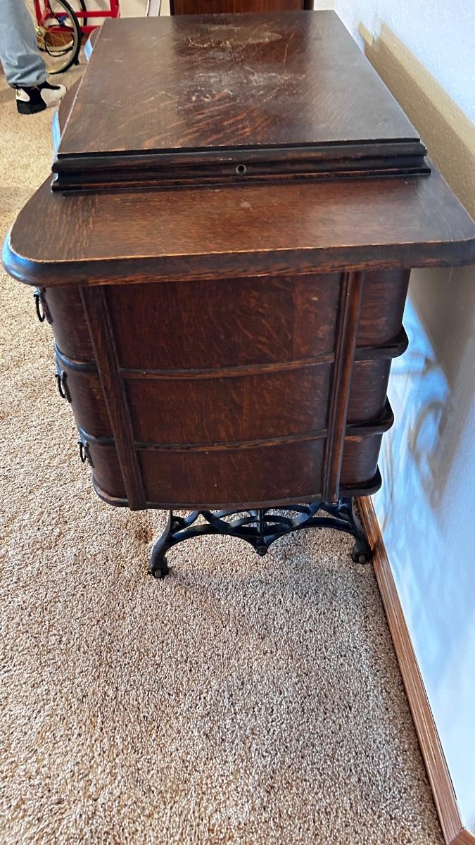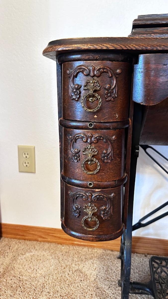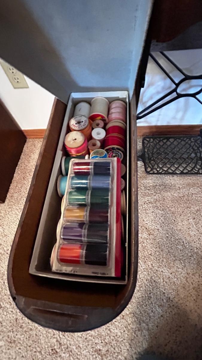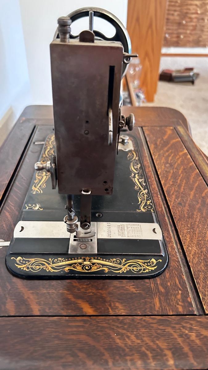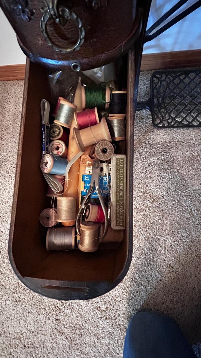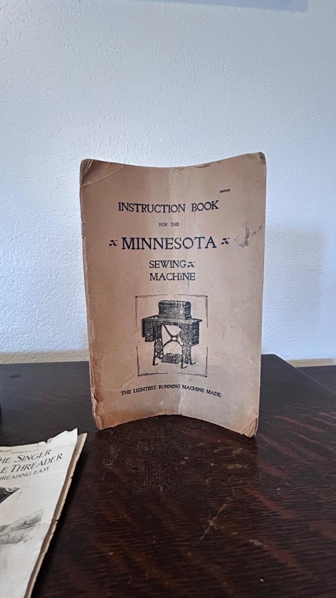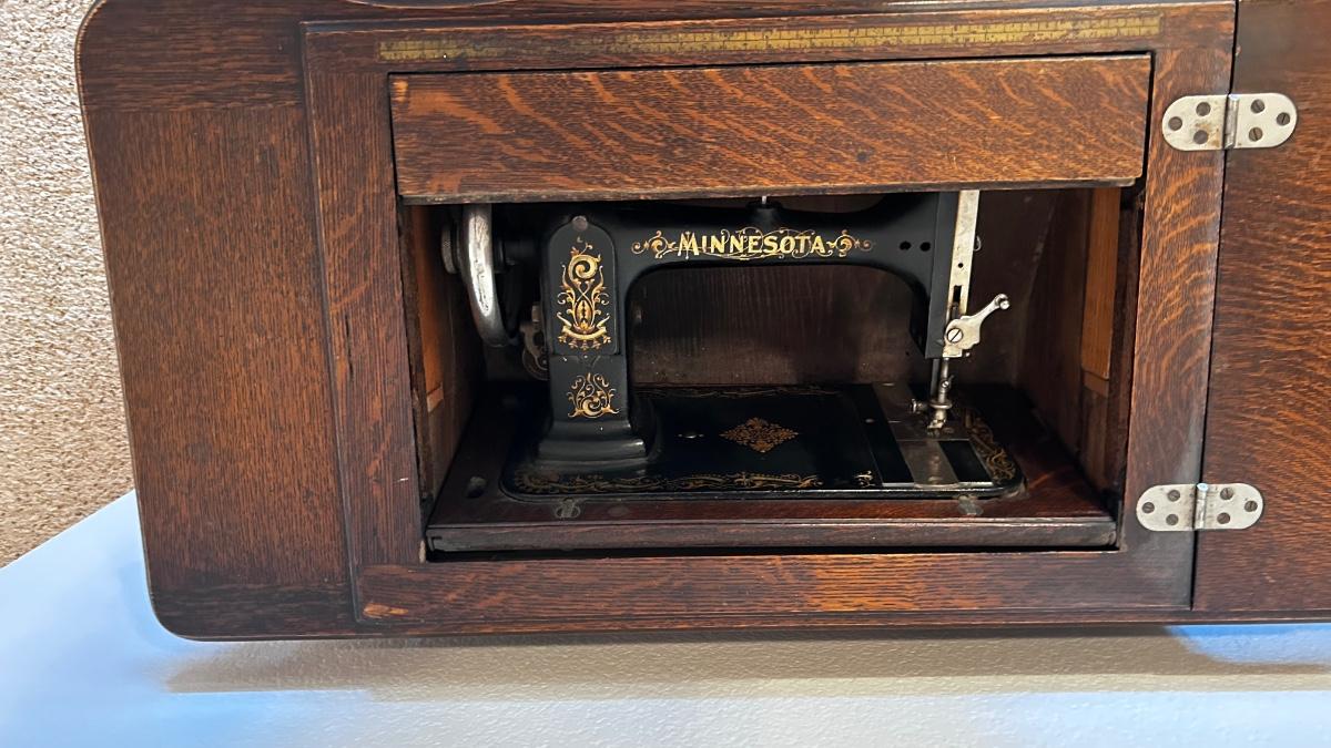 NICE EARLY 1900’s MINNESOTA TREADLE SEWING MACHINE WITH ACCESSORIES, NOTIONS AND ORIGINAL PAPERWORK