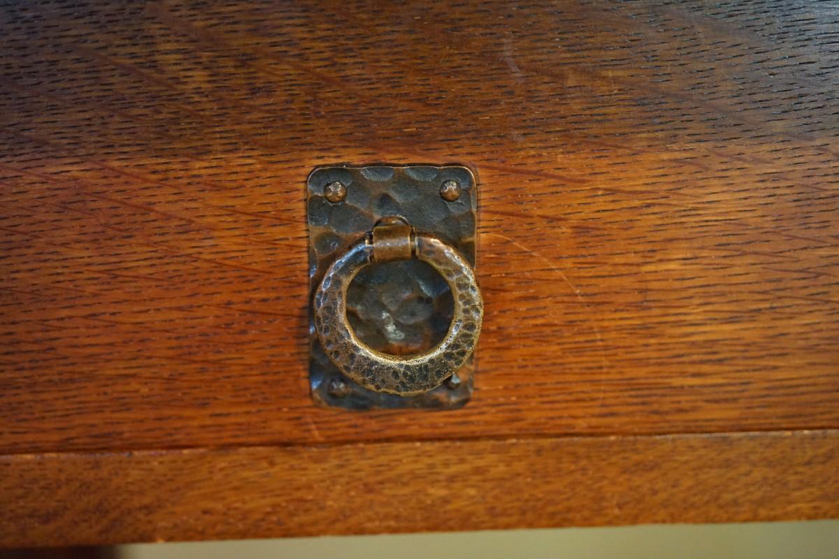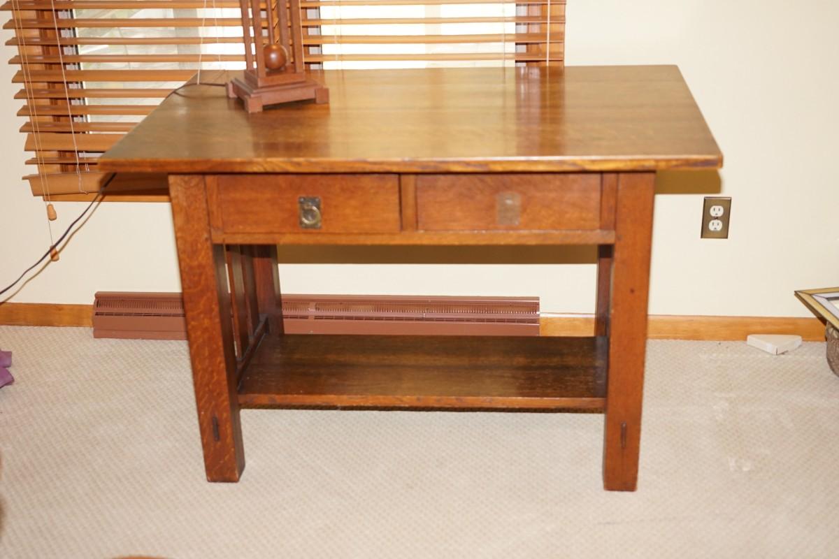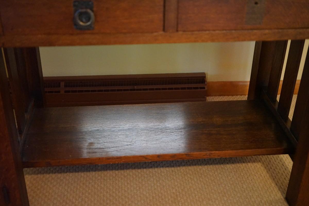 "QUAINT" LABEL ON BASE  1900'S OAK ARTS AND CRAFTS STYLE WRITING DESK TWO DRAWER /COPPER PULLS
