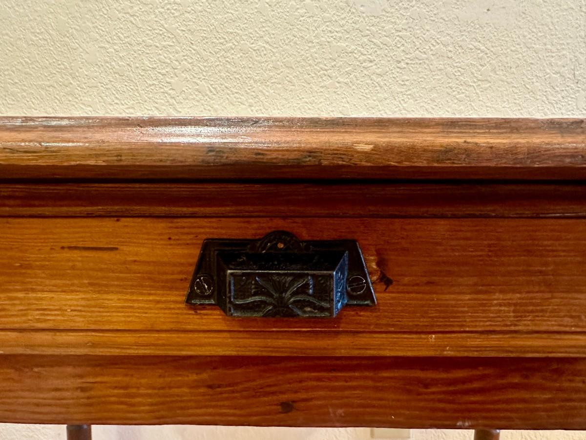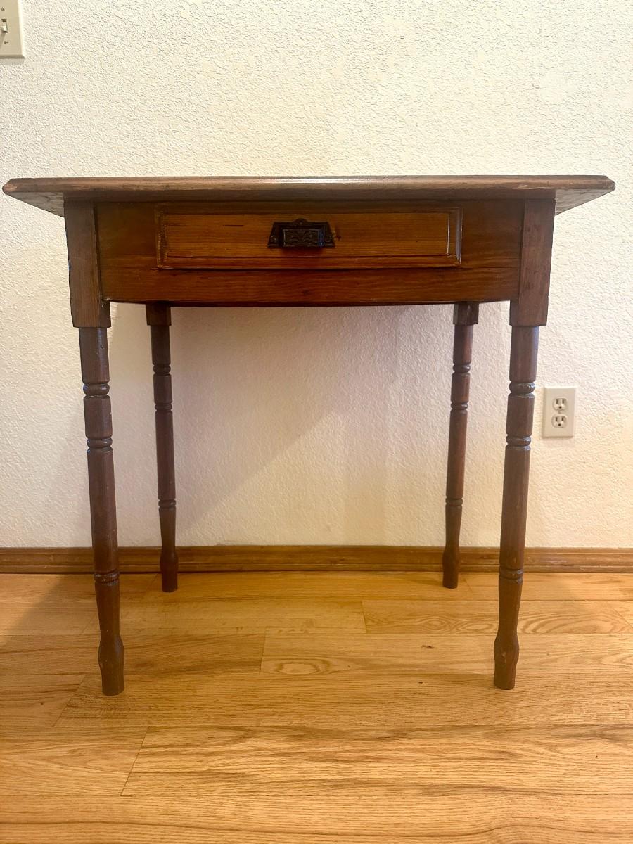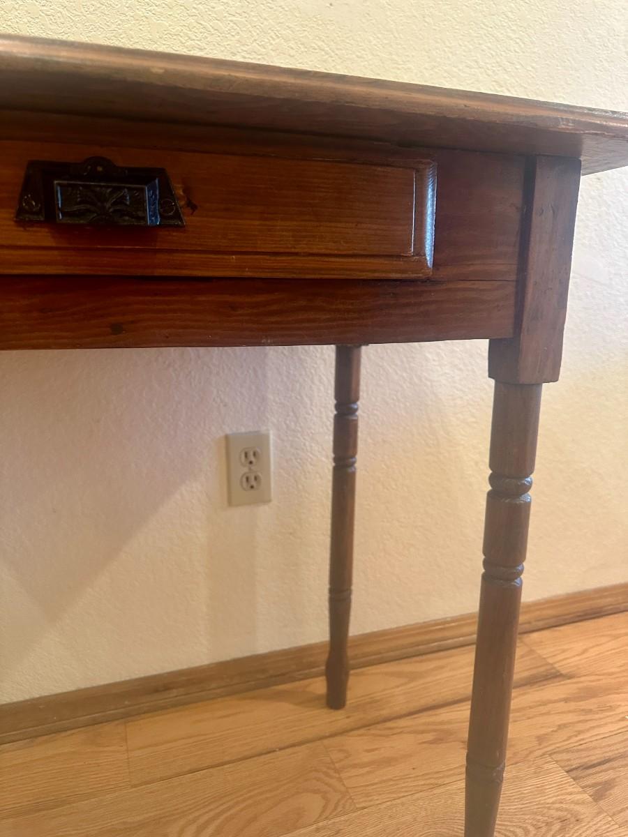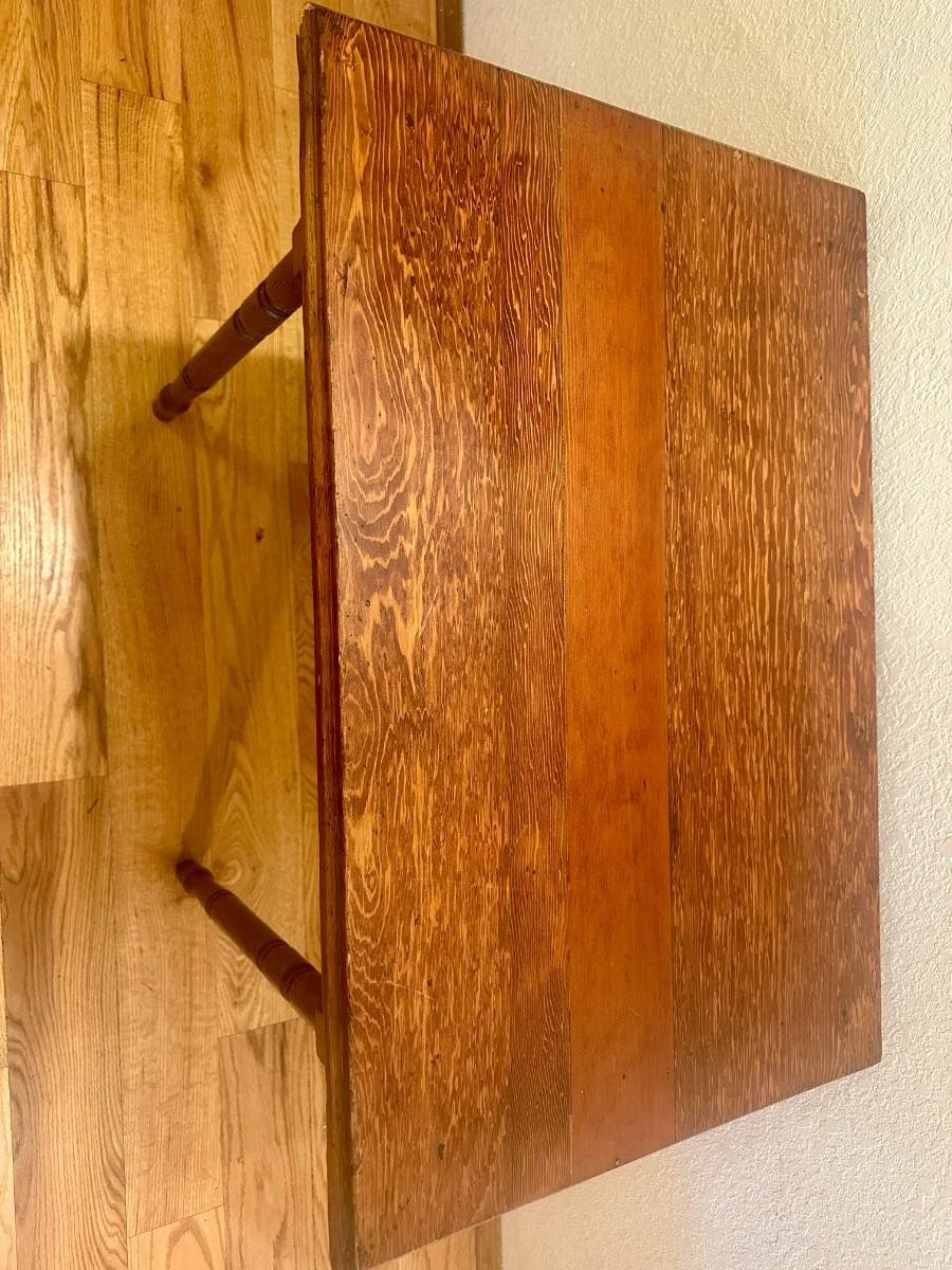 Early 20th Century pine desk with carved spindle legs and two toned top. Drawer has decorative metal handle. Legs are even and desk does not rock. Very good condition with some nicks as pictured.