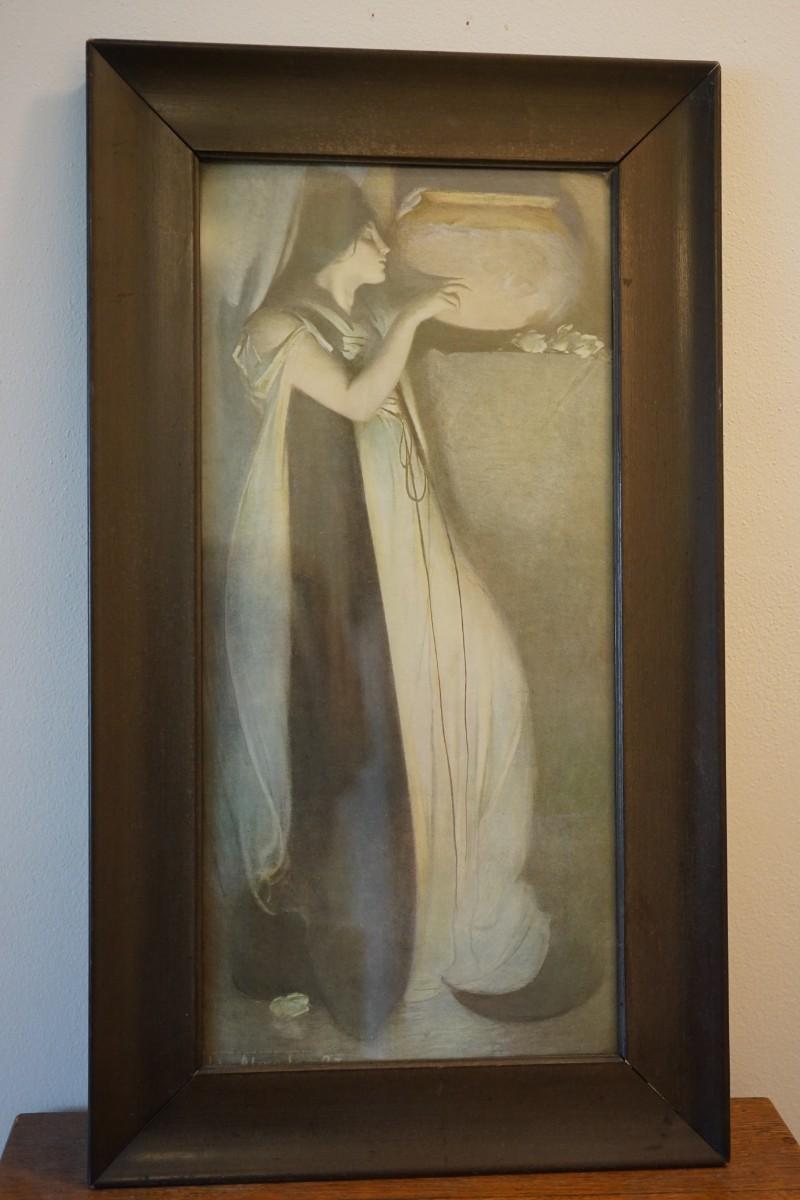 EARLY 1900'S PRINT OF LADY HOLDING VESSEL IN OAK FRAME