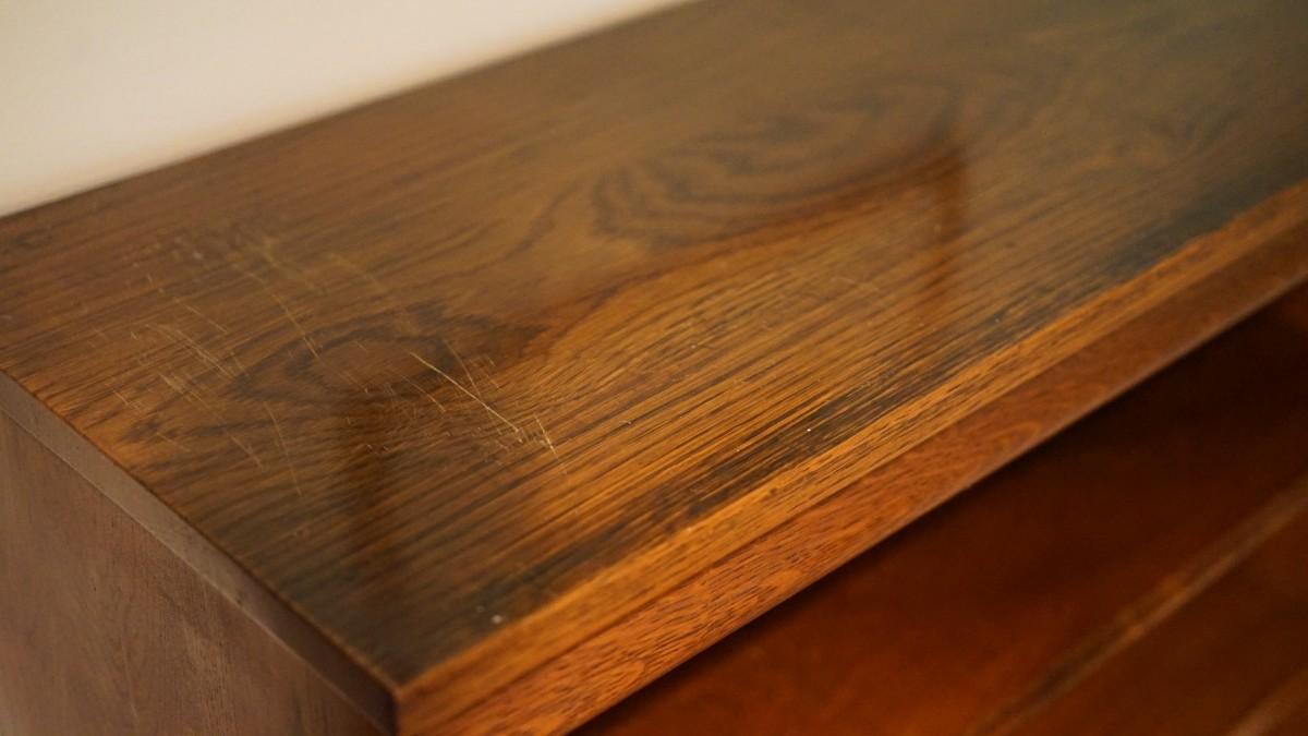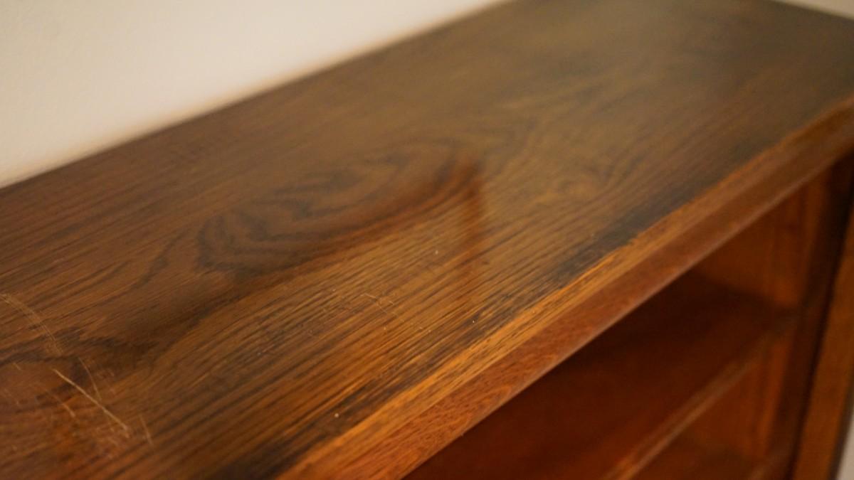oak in natural finish. . there are slight scratches on the top on the right side by edge. see photo.