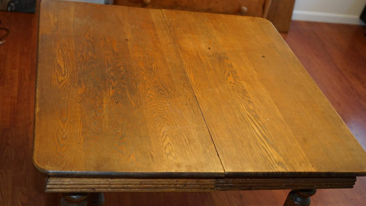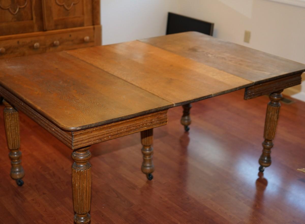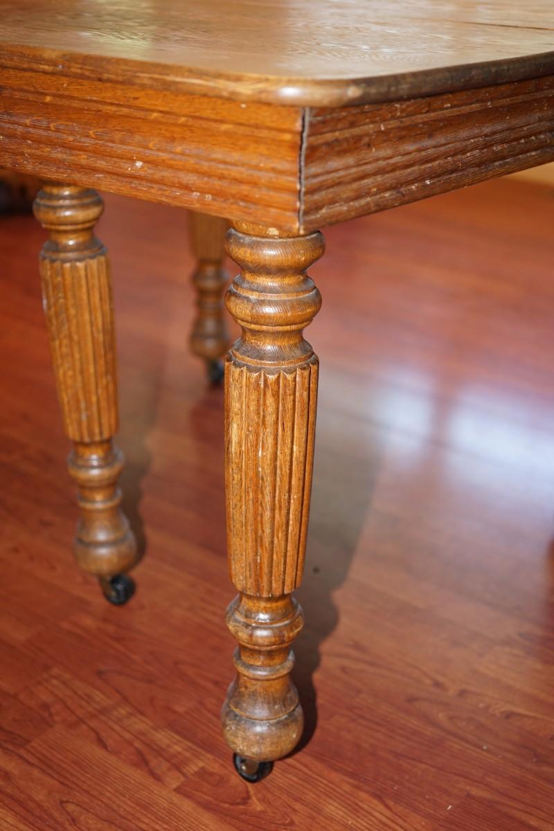 EARLY 1900'S SQUARE  OAK TABLE W/TWO LEAVES/FLUTED LEGS/ CENTER LEG SUPPORT