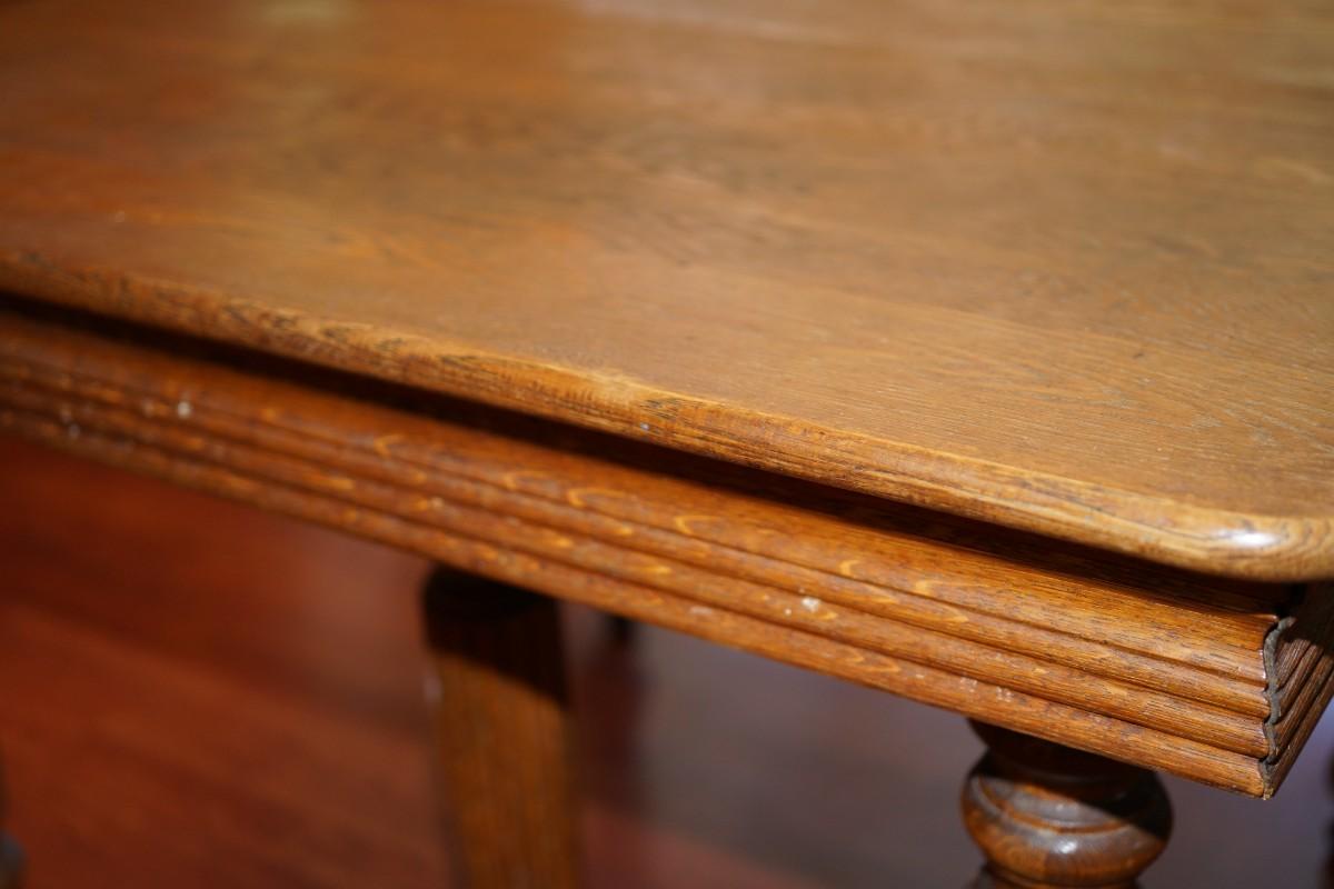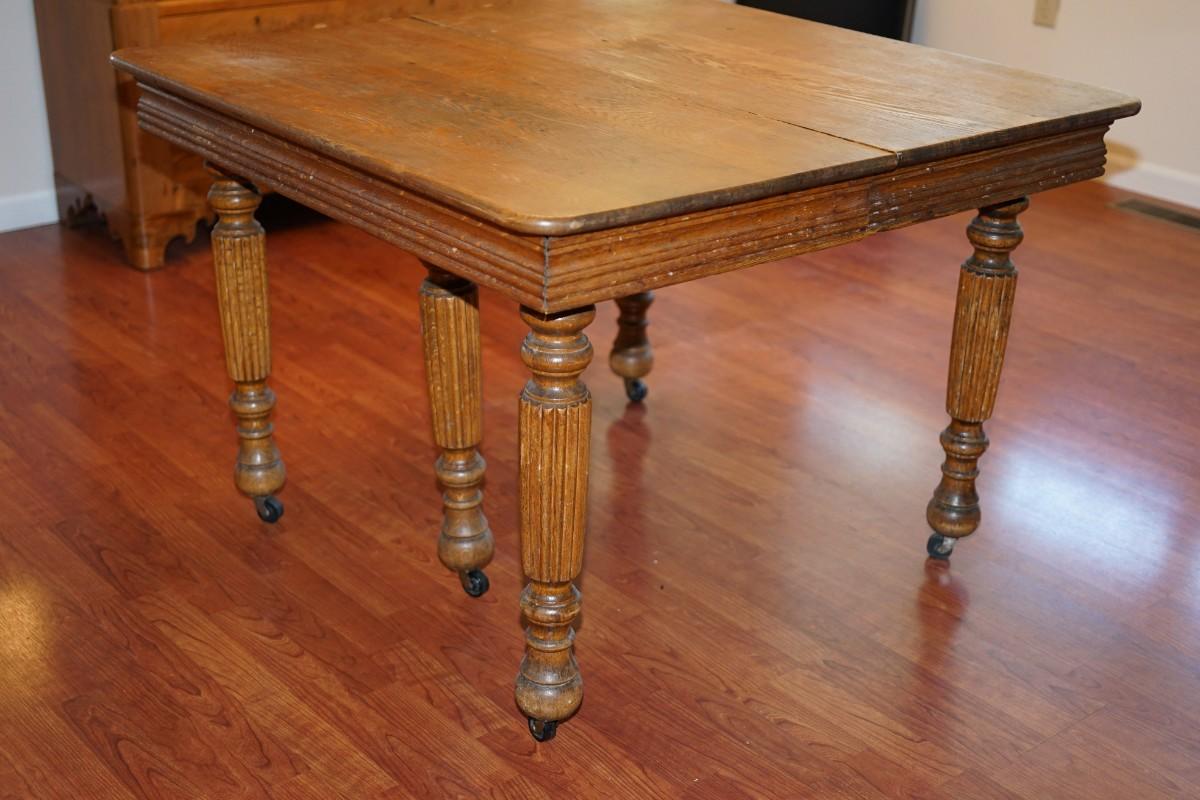EARLY 1900'S SQUARE OAK TABLE W/TWO LEAVES/FLUTED LEGS/ CENTER LEG SUPPORT