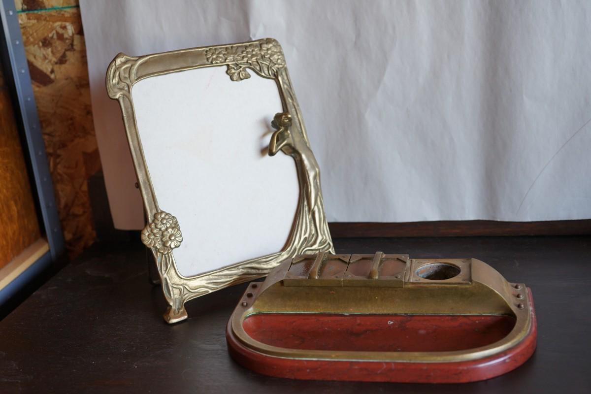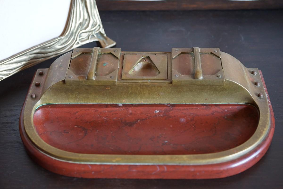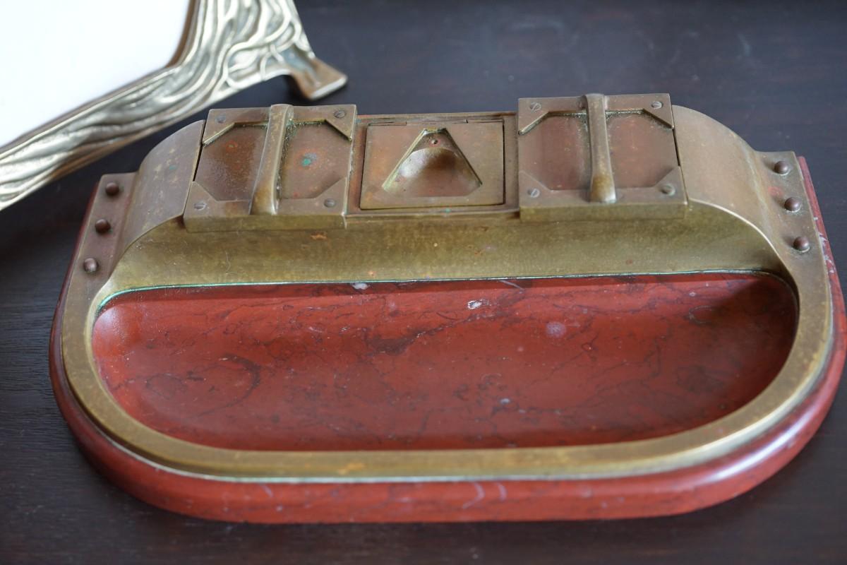 two items in this grouping . the fine item is the red stone( marble? ) base desk set . it has the red marble with the inset brass ink wells that has a sliding cover to expose the choice.. A larger holder for pens in toward the front. The glass inserts for the ink wells are missing. the bronze or brass has wear and discoloration but.. it adds character.