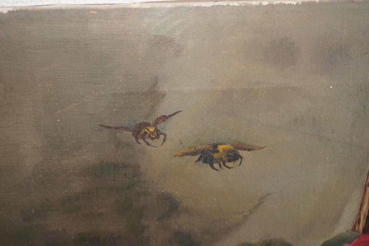 primitive style oil painting of roses falling from a basket on its side. around the basket are bees in flight