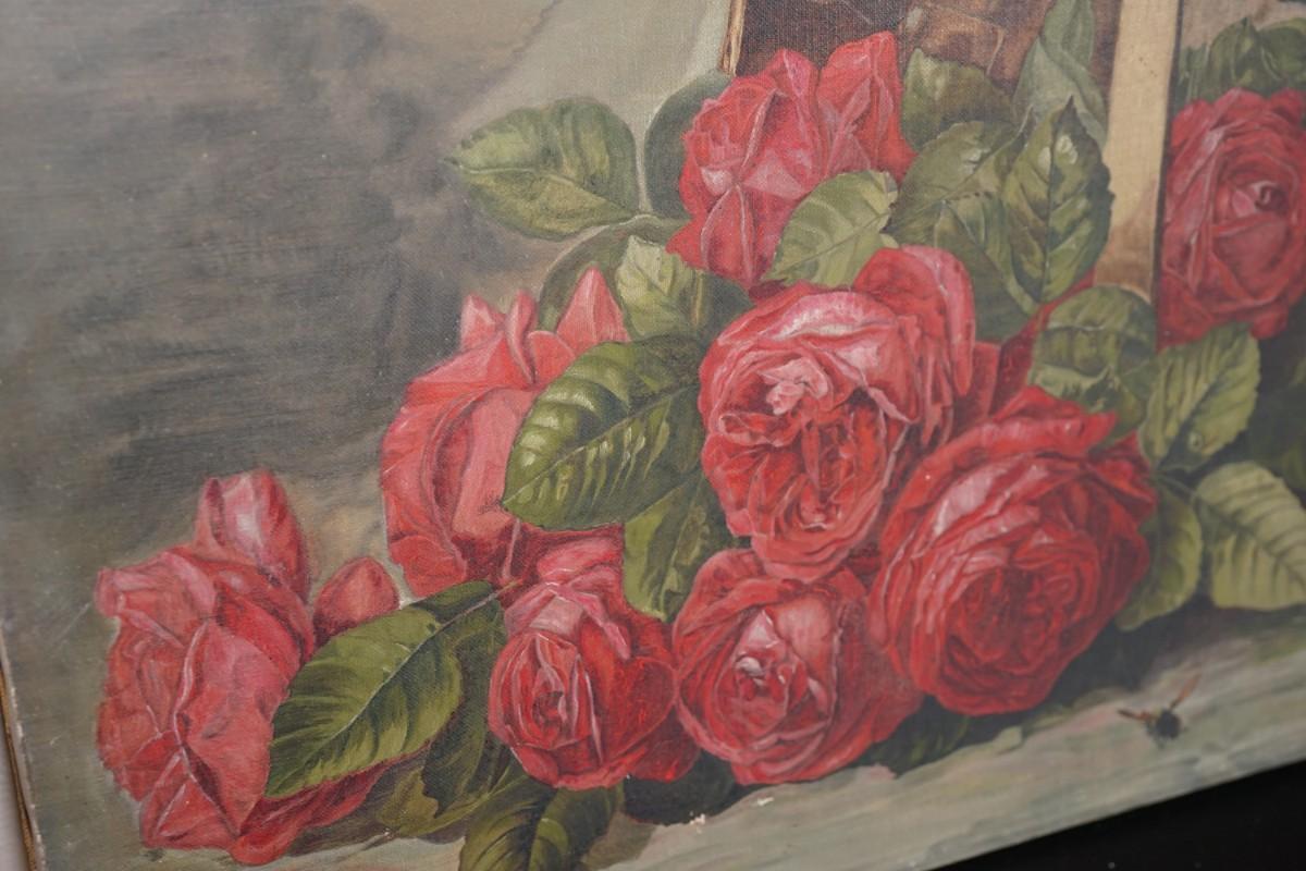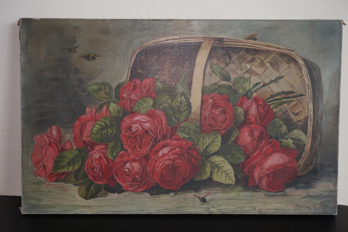 EARLY 1900'S VINTAGE PAINTING OF ROSES /OAK SPLINT BASKET W/ BEES