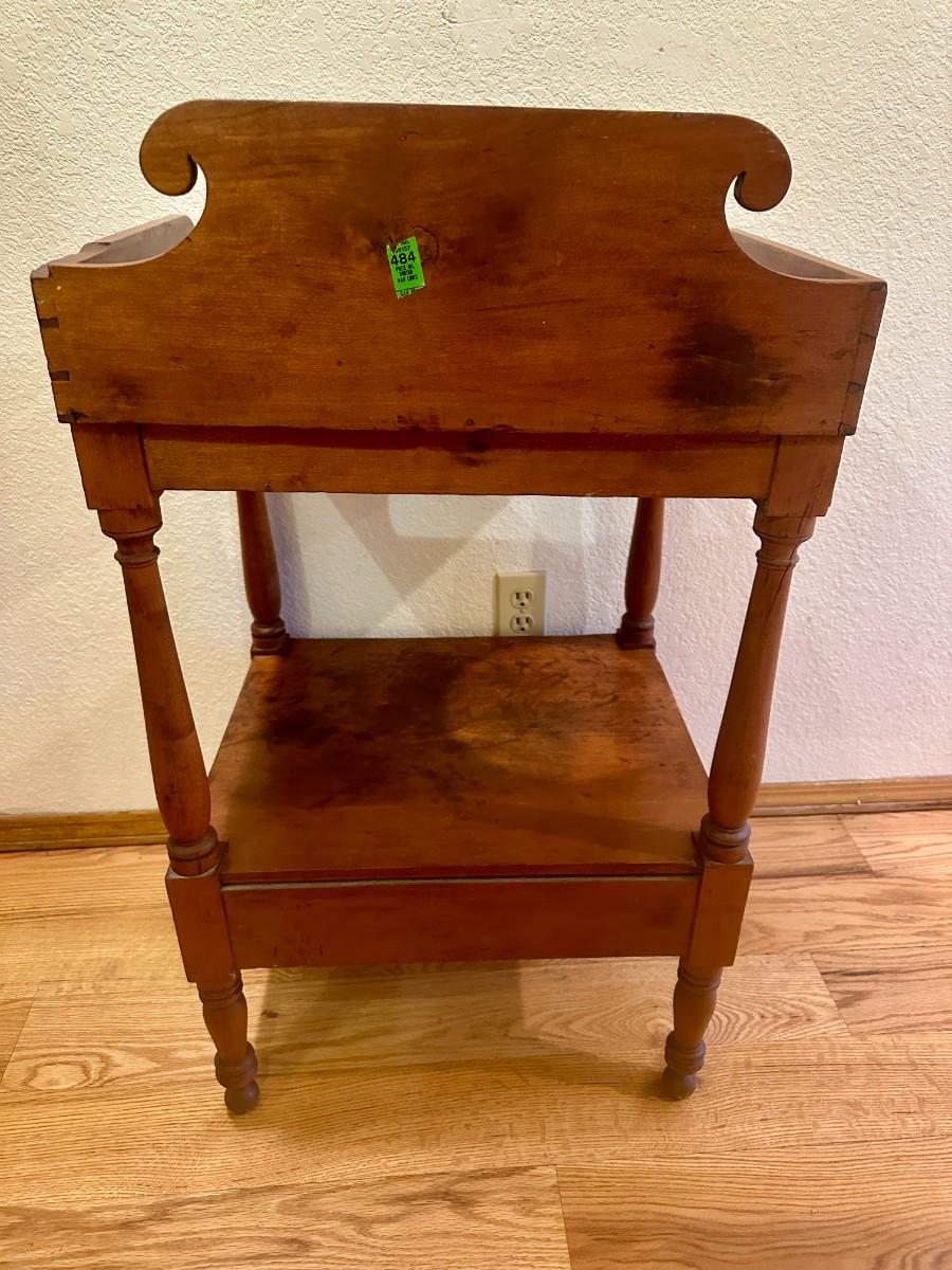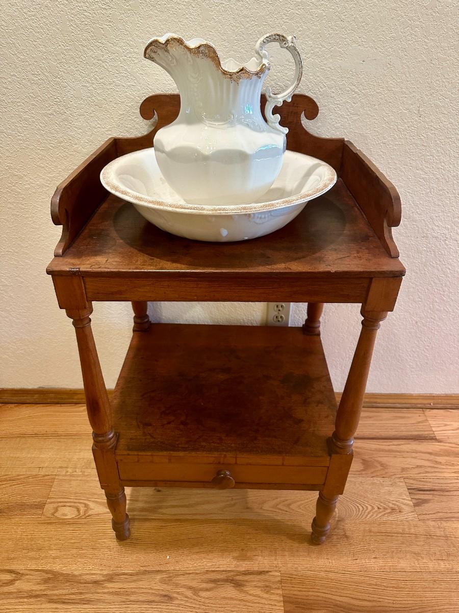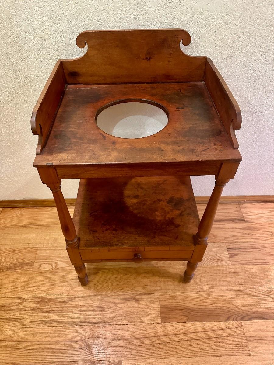 Dated to approximately 1900, this unique wash basin with stand has been in the family for 3 generations. The stand has a recessed hole to allow the basin to sit down in it. The writing on the bottom of the drawer appears to not be a person, but a Macy's store that was in Seioto, Ohio in 1900, which would likely make this basin stand, not a sale item, but a fixture. Wood has some discoloration from age and there is a crack in the wood under the basin. The basin bowl has a small chip on the bottom but is not visible when displayed.
