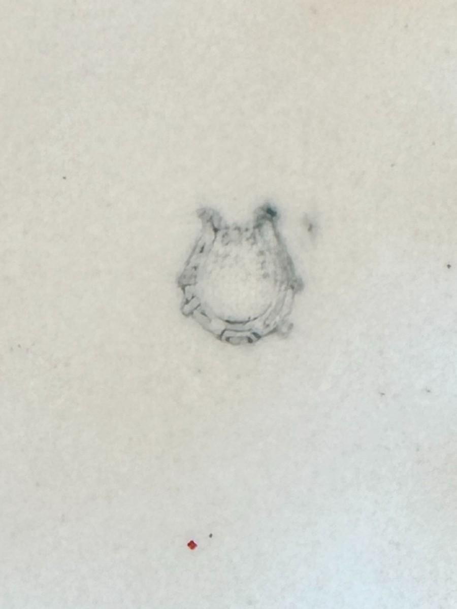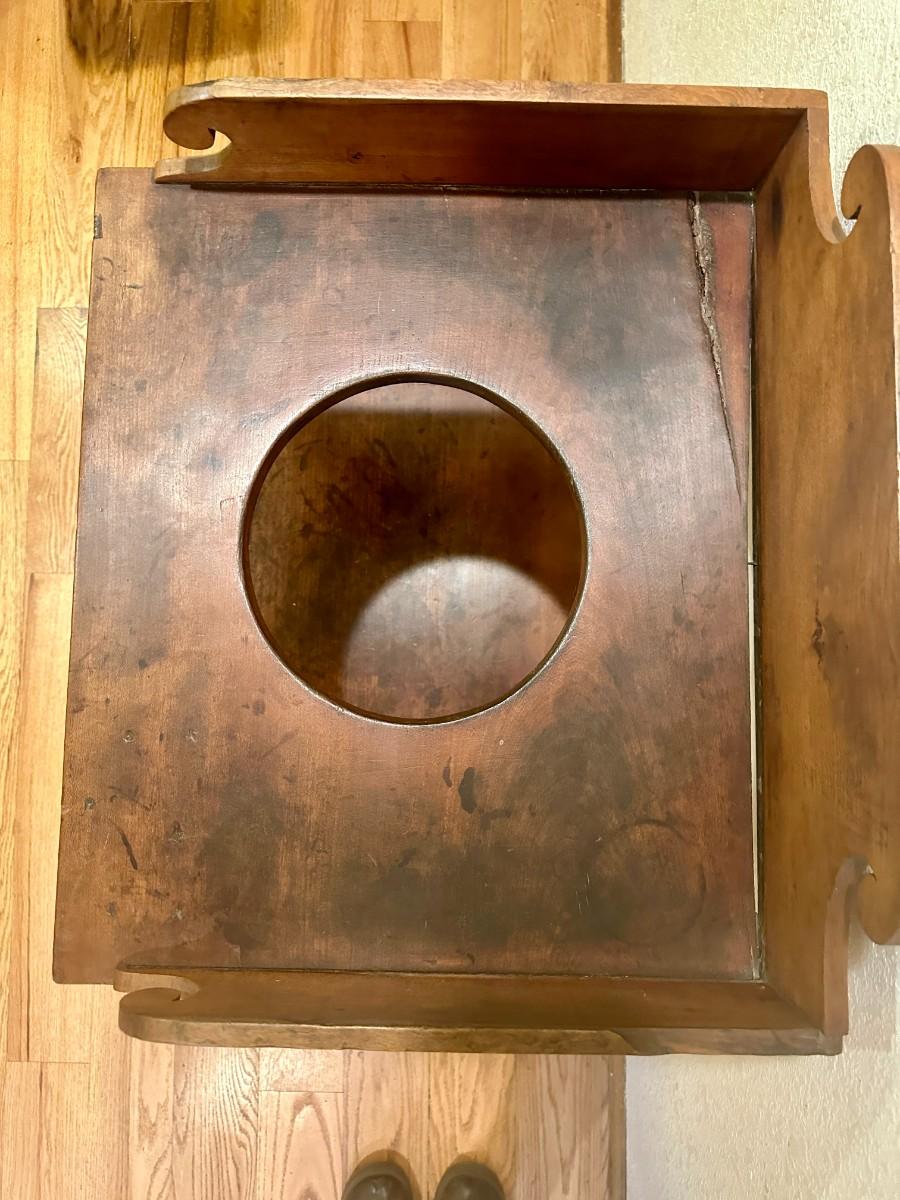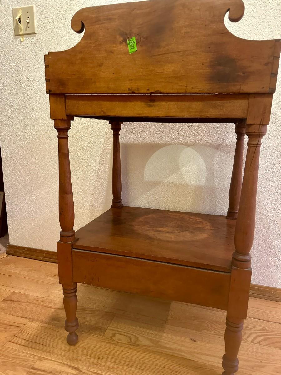 Dated to approximately 1900, this unique wash basin with stand has been in the family for 3 generations. The stand has a recessed hole to allow the basin to sit down in it. The writing on the bottom of the drawer appears to not be a person, but a Macy's store that was in Seioto, Ohio in 1900, which would likely make this basin stand, not a sale item, but a fixture. Wood has some discoloration from age and there is a crack in the wood under the basin. The basin bowl has a small chip on the bottom but is not visible when displayed.