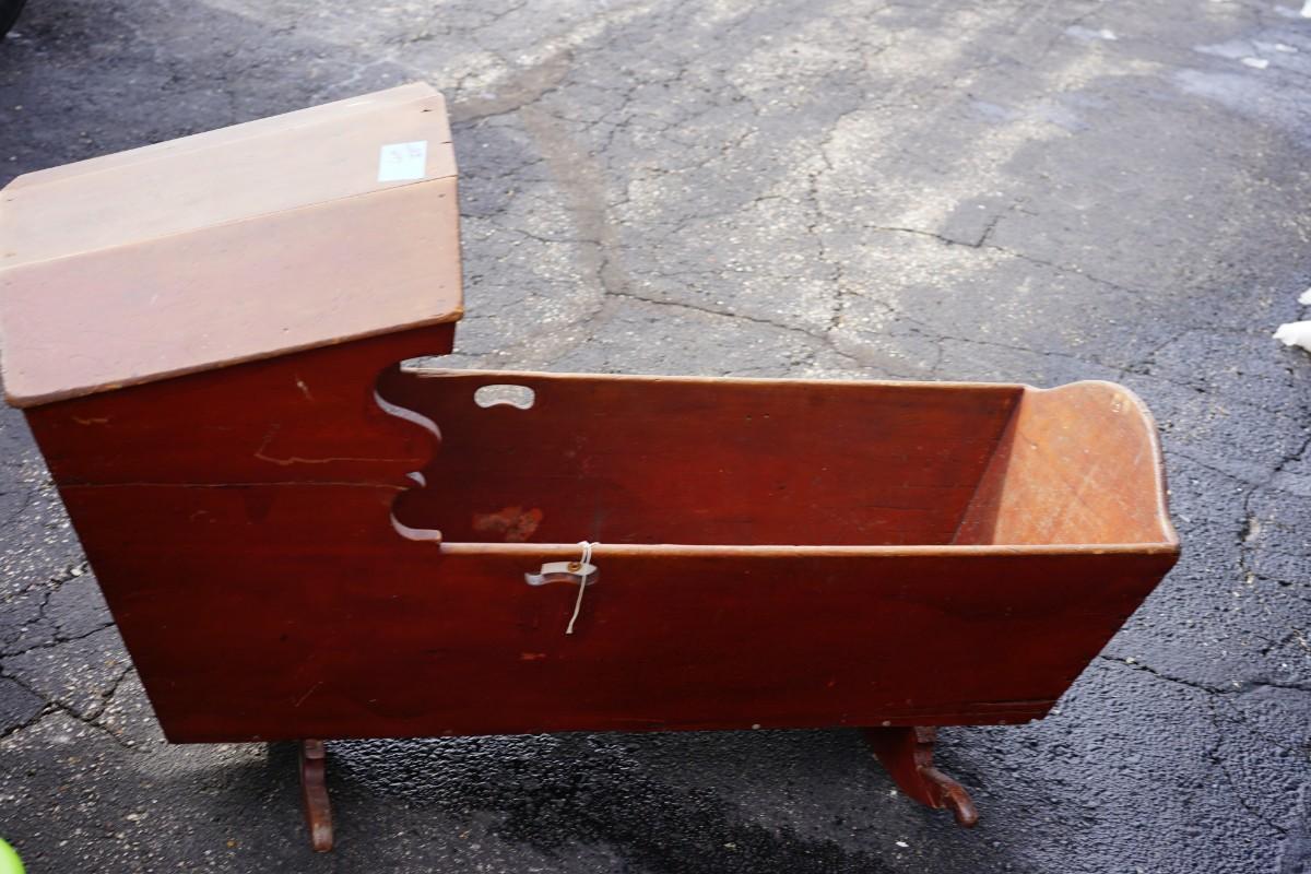 This historic baby cradle is in good condition. It will need some addtional cleaning and a light finish if prefered to the exterior.