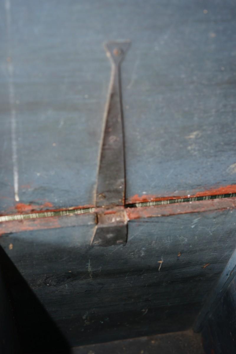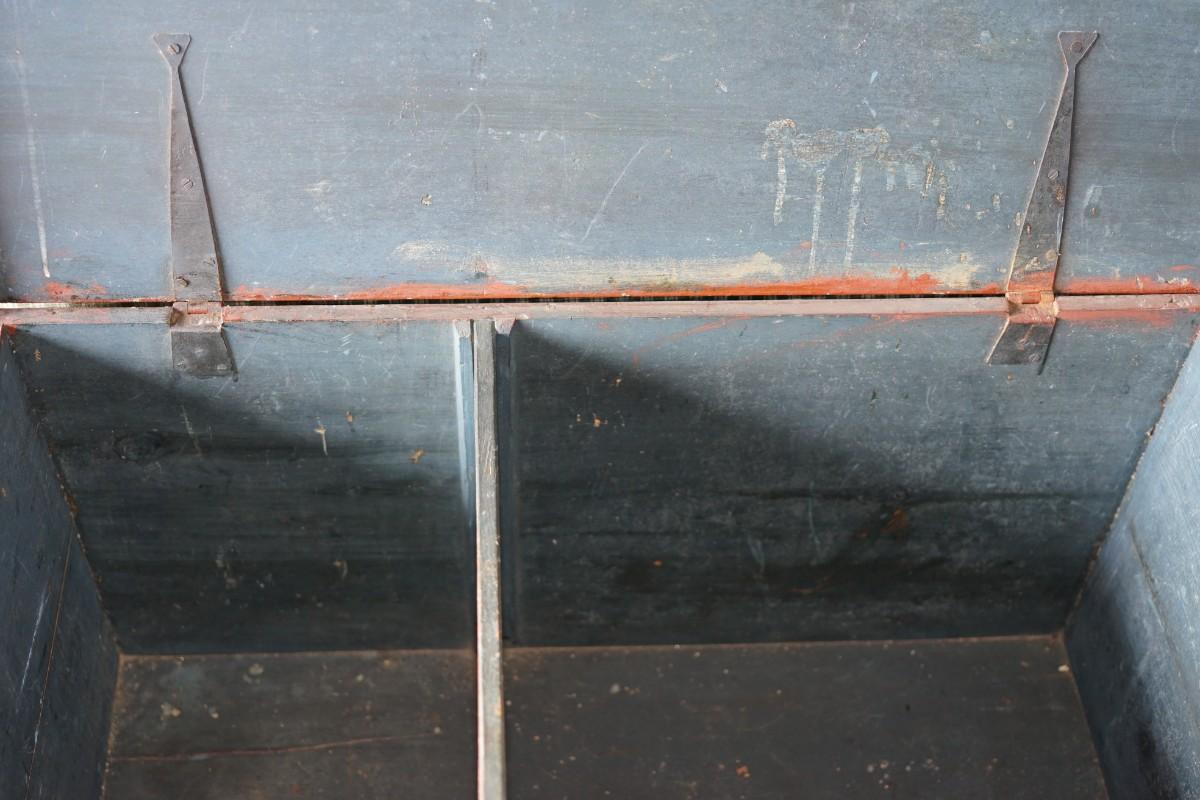the interior is painted the older blue color( orginal . The hand forged "rat tail" hinges intact but one is loose. The piece needs a better cleaning interior and slight resoration to the top. There are scratches and some discoloration to the paint. Most damage to the top from other trunks in the past being stacked. This one should be seen in person to appreciate the charm of the color and style.