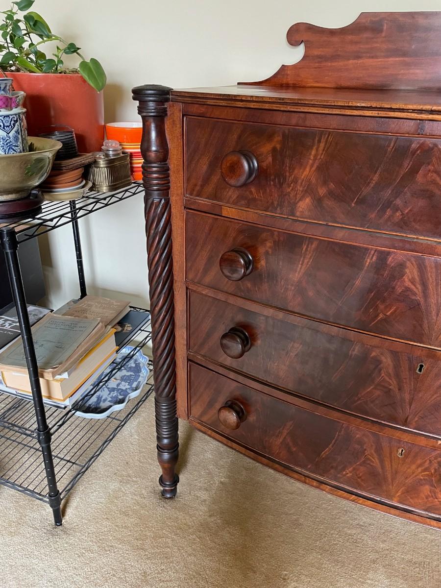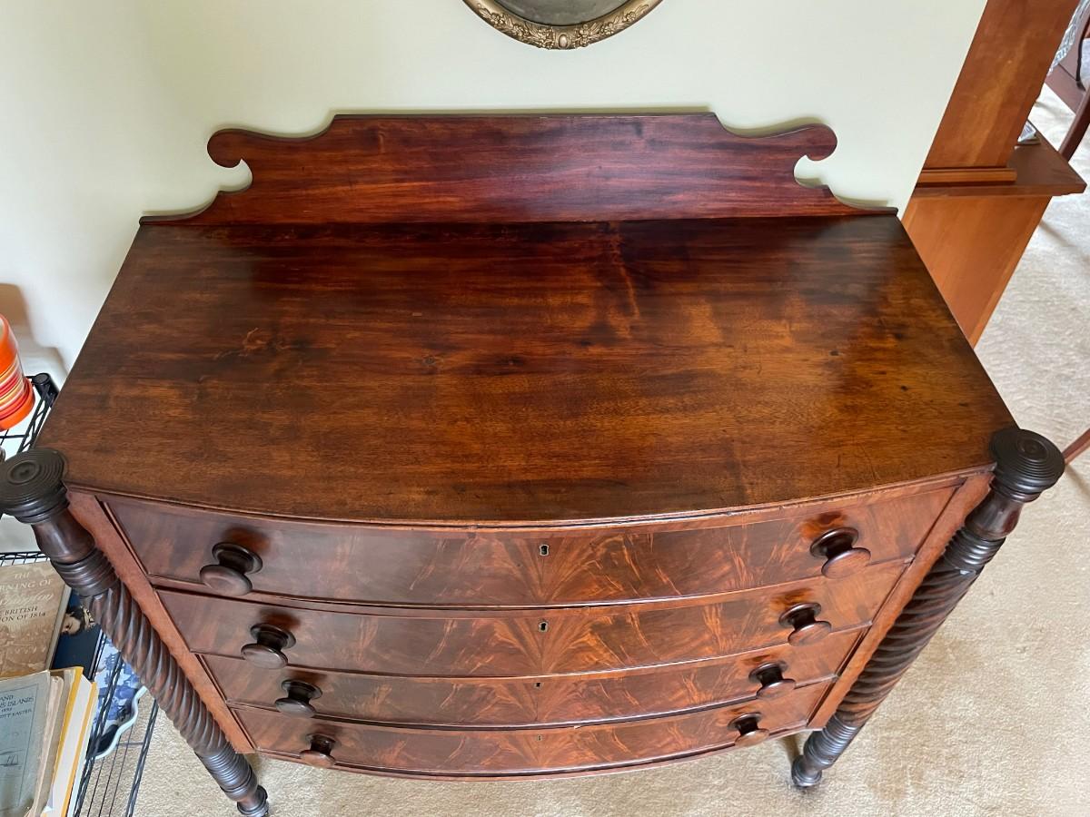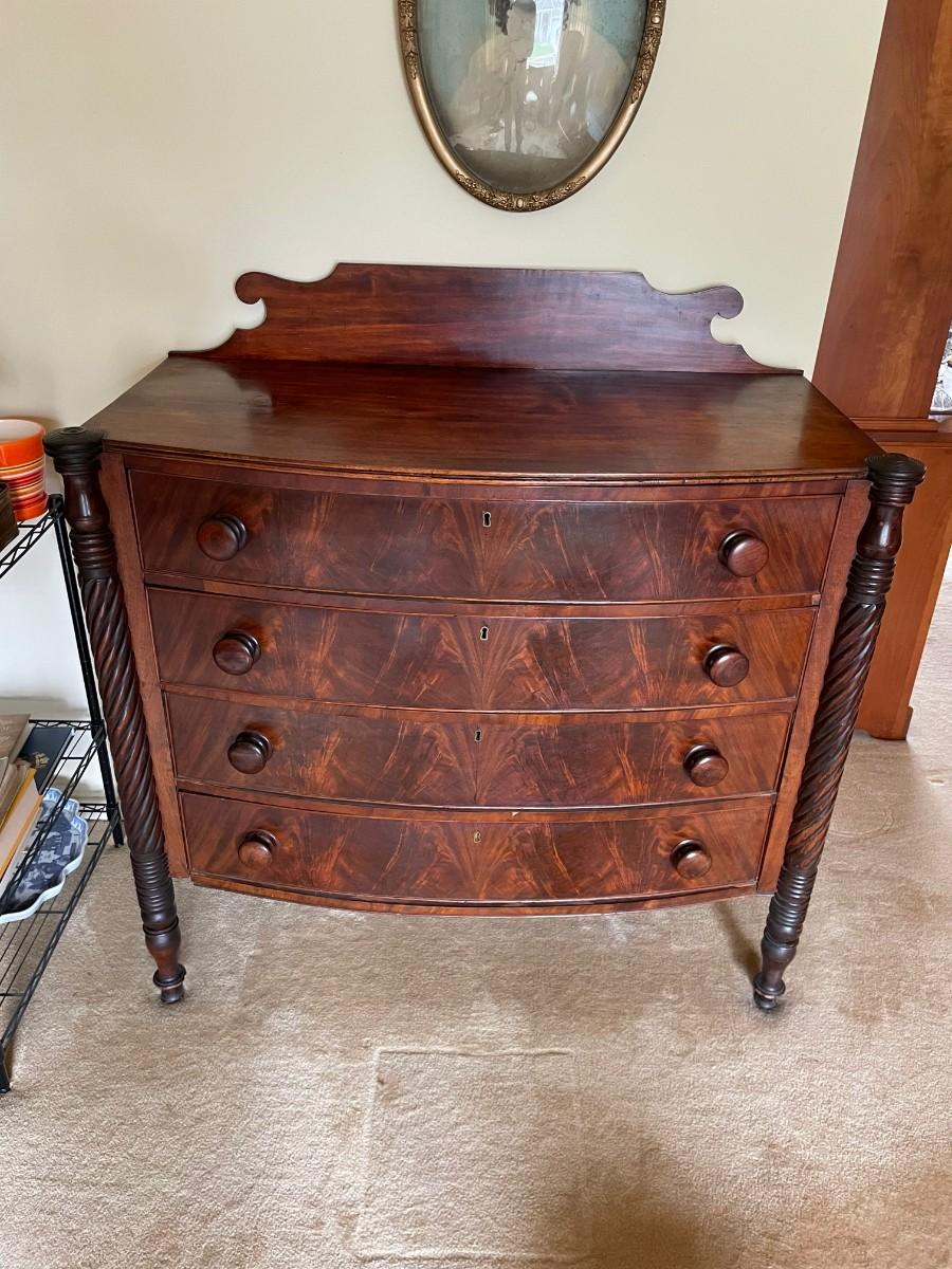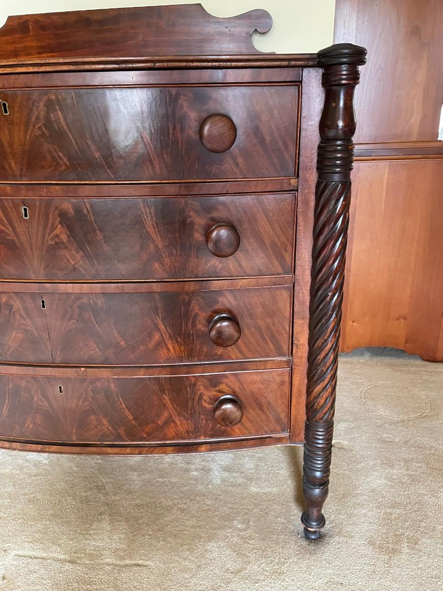 19th Century Sheraton Flame Mahogany Bow Front Chest flanked by fluted barley twist columns and on turned legs. There are 4 larger bow front drawers on the chest, all fitted with the original pulls.Back right leg needs a minor repair. 45H x 37 1/2L x 19W