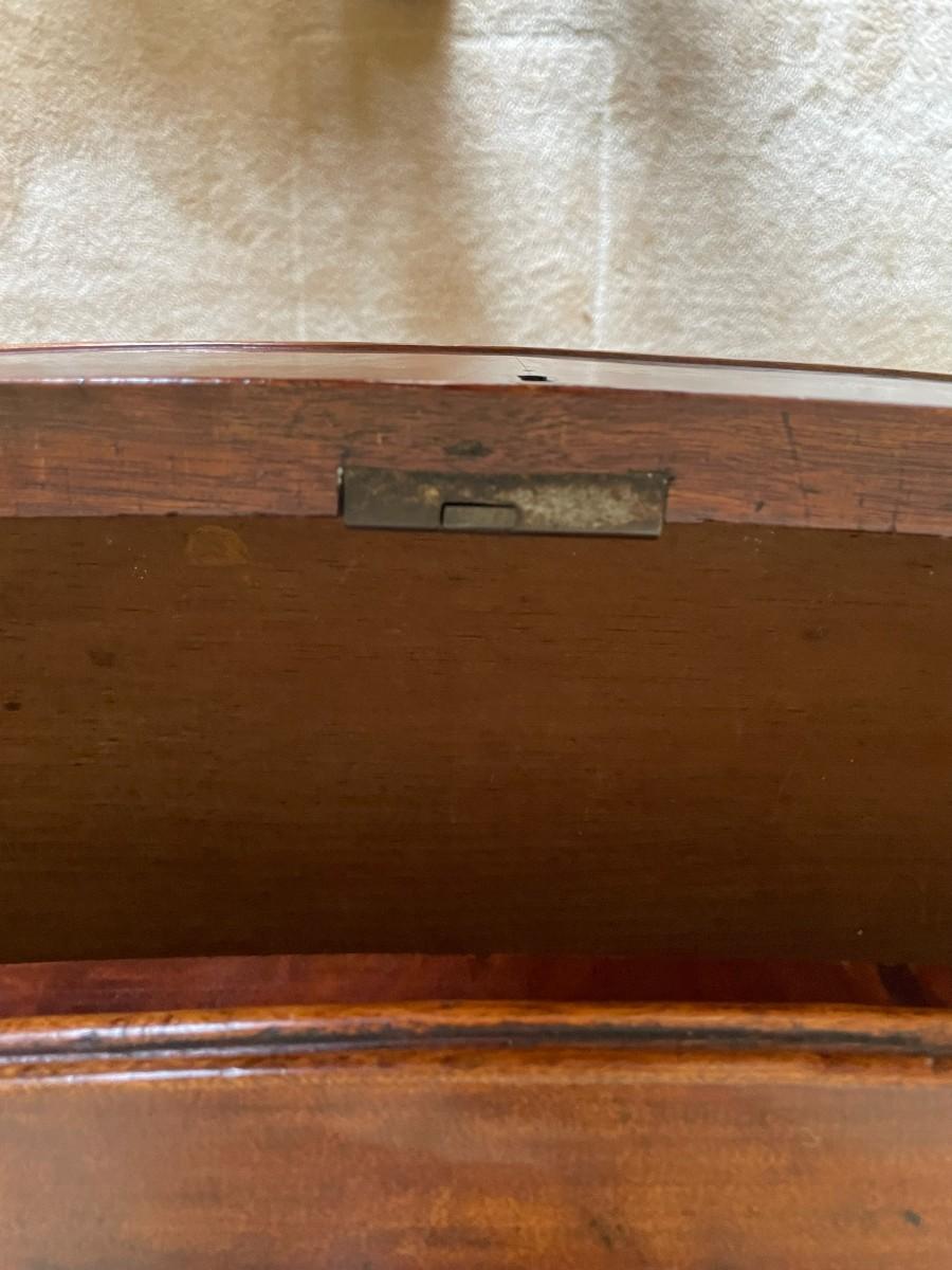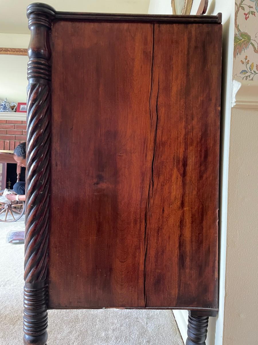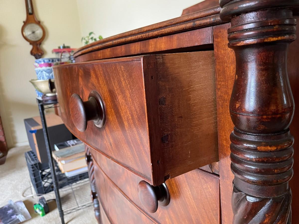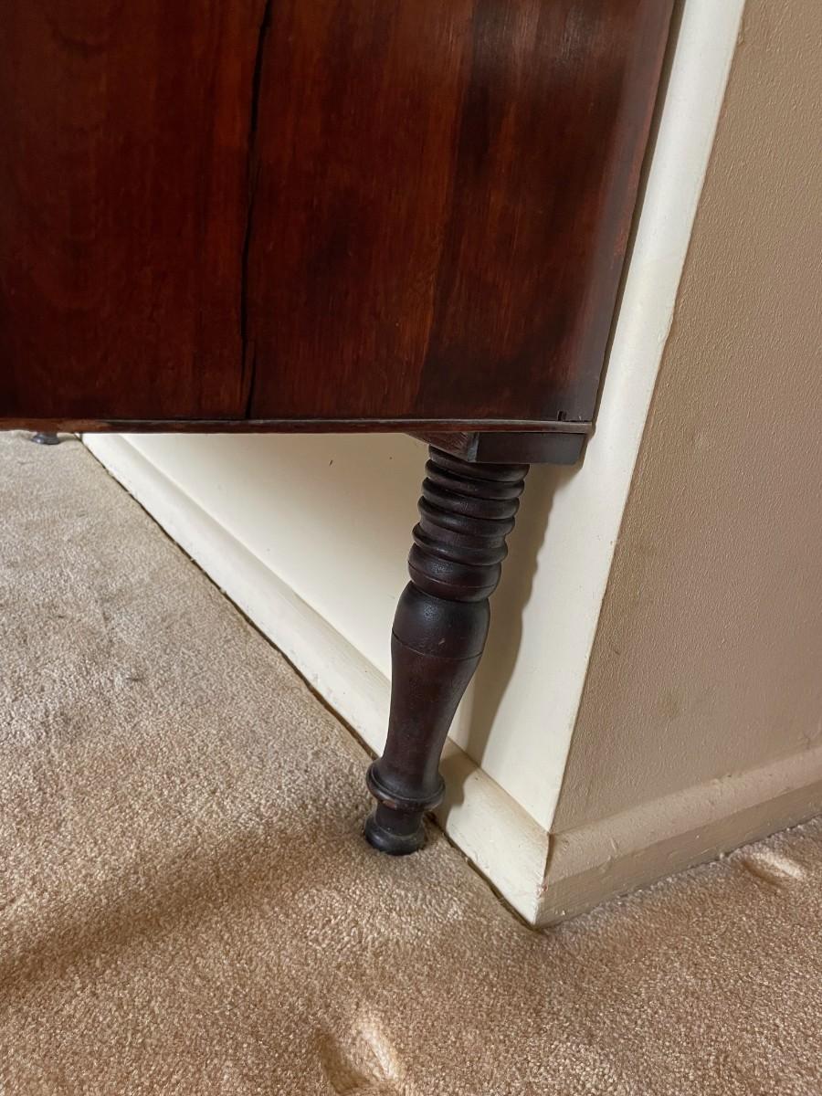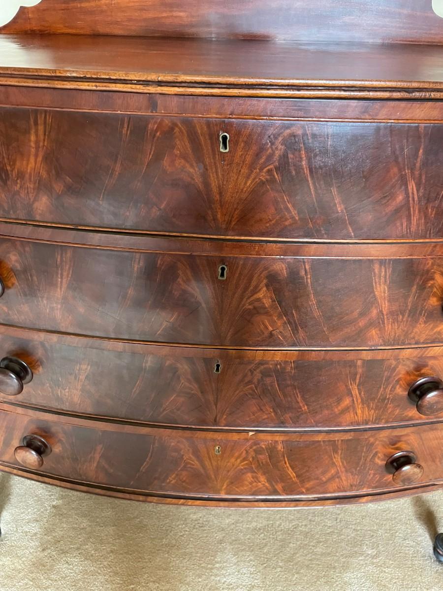 19th Century Sheraton Flame Mahogany Bow Front Chest flanked by fluted barley twist columns and on turned legs. There are 4 larger bow front drawers on the chest, all fitted with the original pulls.Back right leg needs a minor repair. 45H x 37 1/2L x 19W