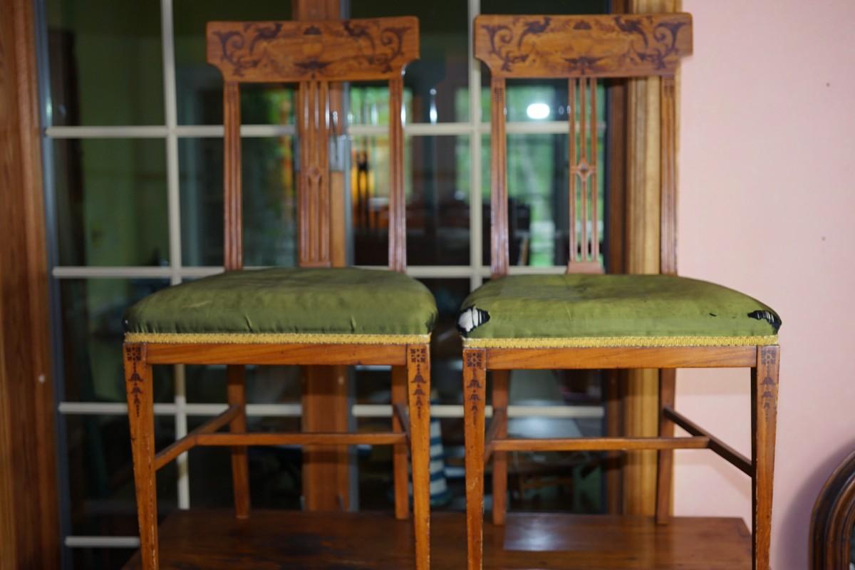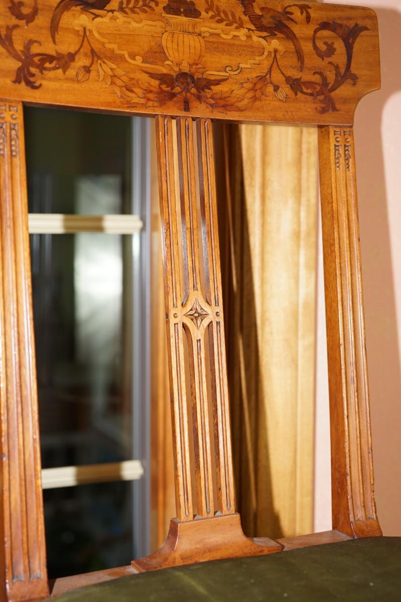 Early 19th century Italian side chairs of mahogany wood inlay of rosewood and fruitwoods to depict birds of paradise and bell flowers. accent pieces. upholstered seats of green silk. The upholstering is not original and is fraying.