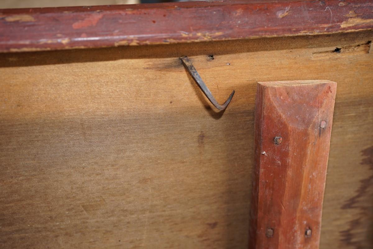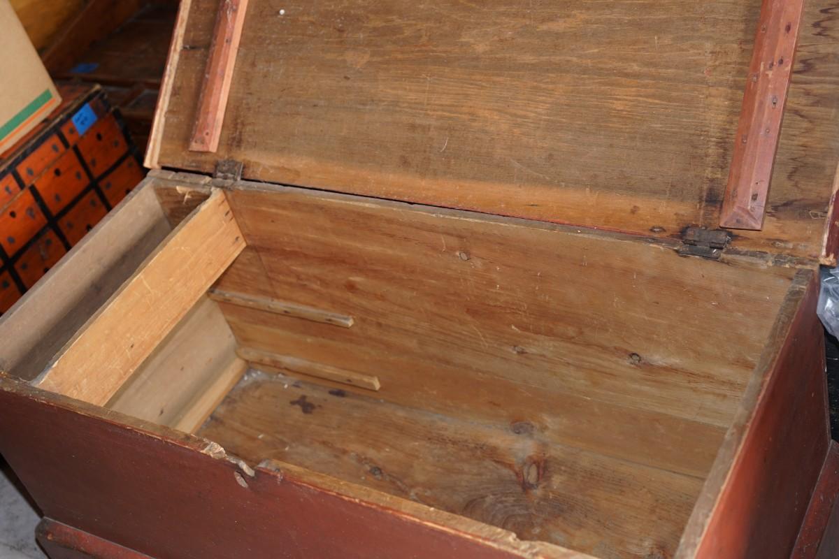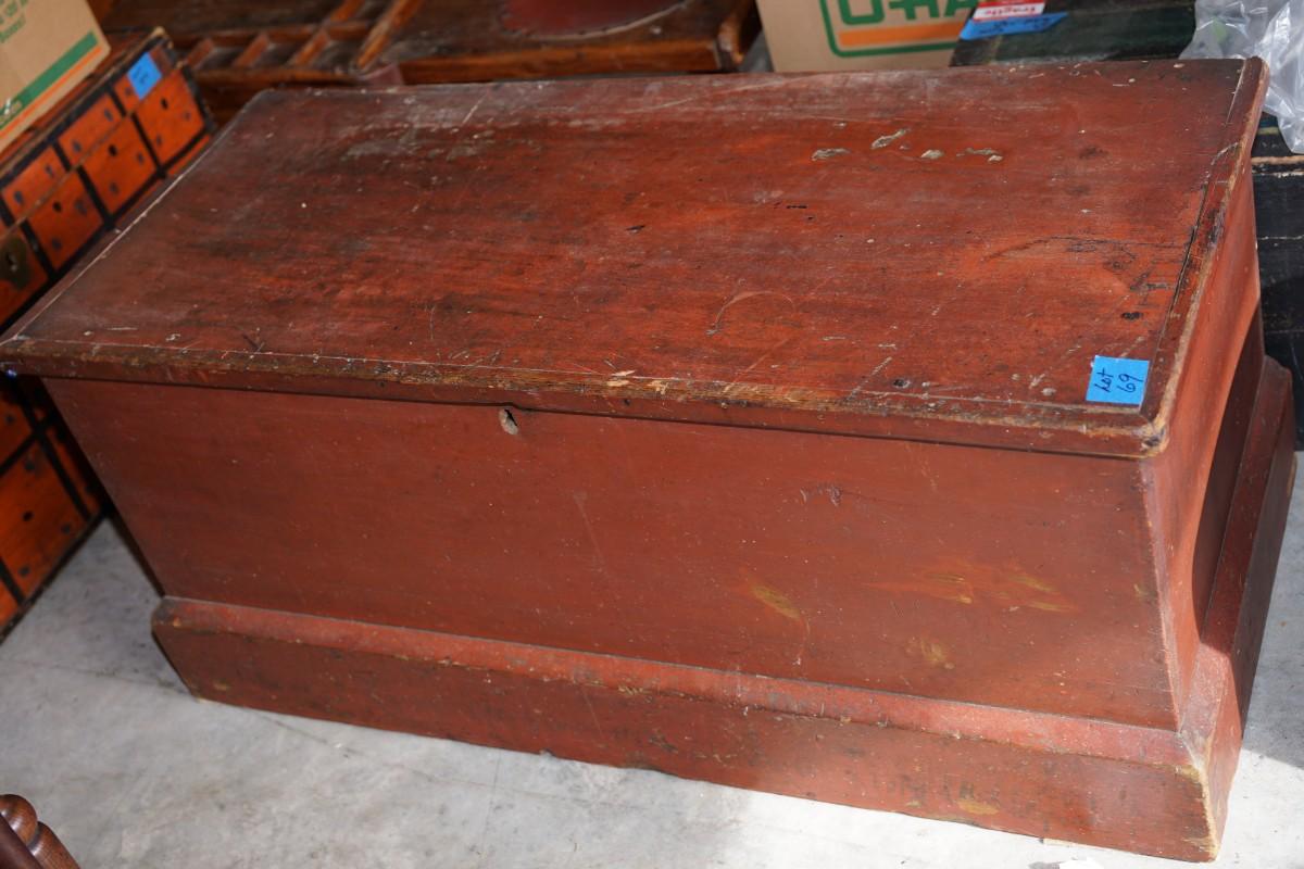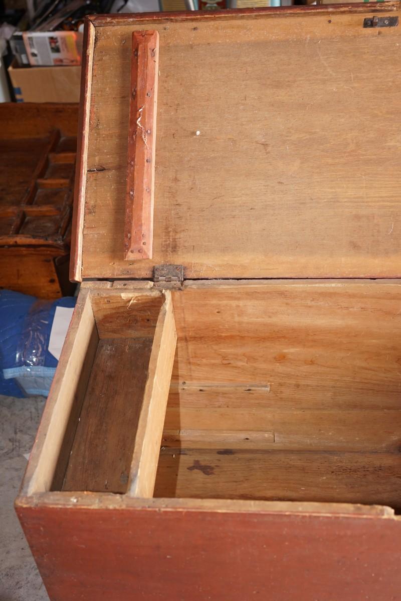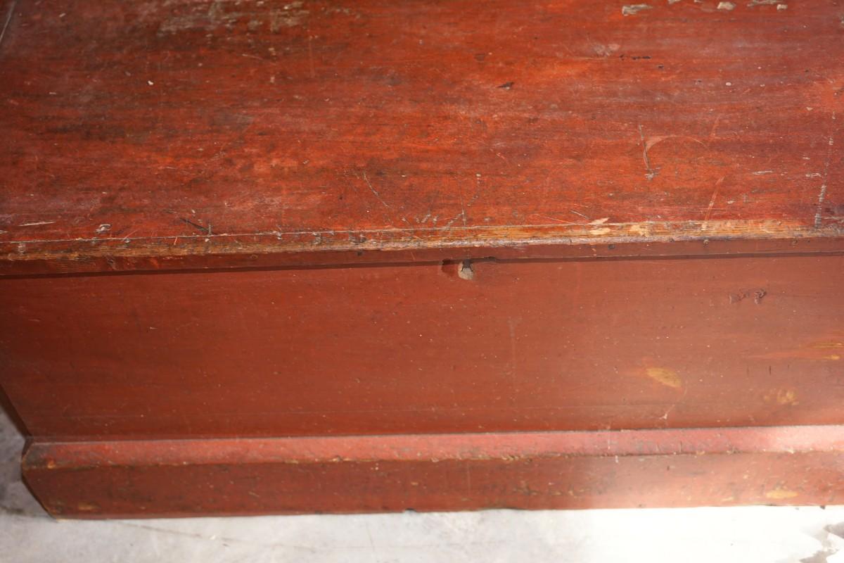Early 19th century wooden travel chest with original red paint. the chest rests on the floor. no legs.
