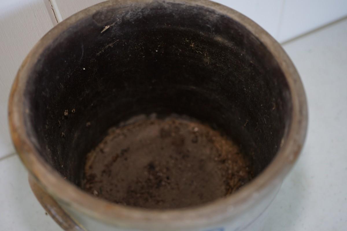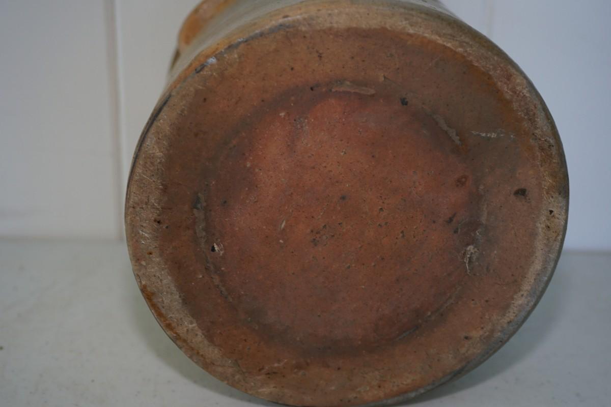 This crock is interesting in that it is a factory flaw. The top is more of an oval shaped at the opening.