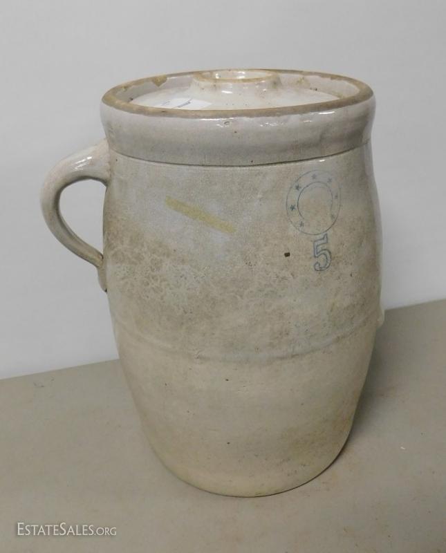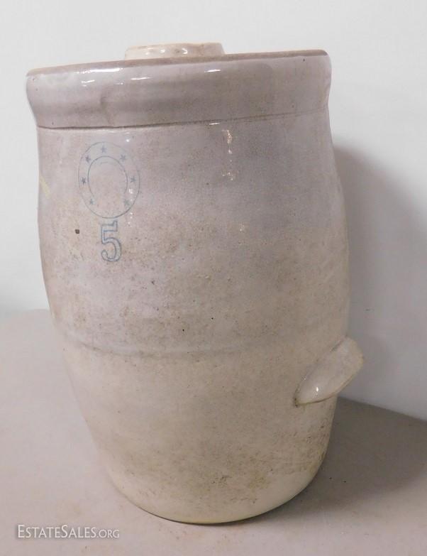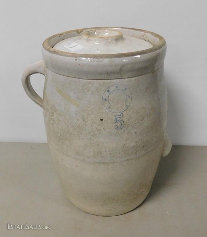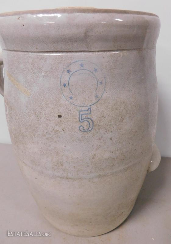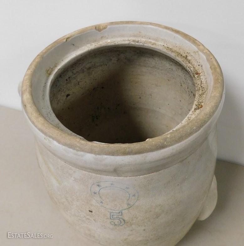 Early 20th Century Louisville Pottery #5 Crock. Minor chip on inside lip of crock. No plunger. Indian head on logo worn off. Very nice piece and rare for this size. Needs some cleaning.