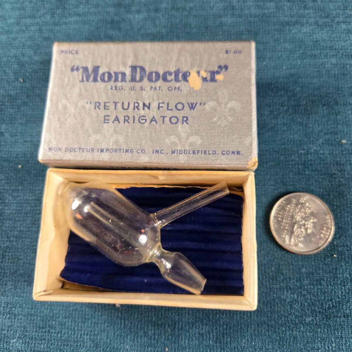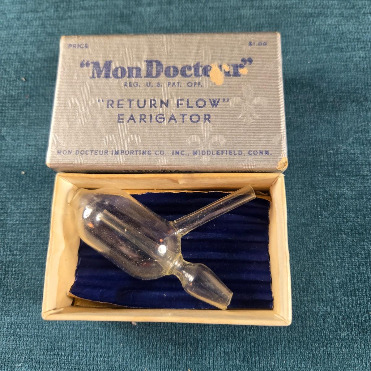This auction lot is for an Early 20th Century Medical Device - "Mon Docteur". It is an Early 20th Century Medical Device - "Mon Docteur" Return Flow Earigator. It was made in Middlefield, CT. The device itself is made of glass and is in it's original box. The box shows wear.
