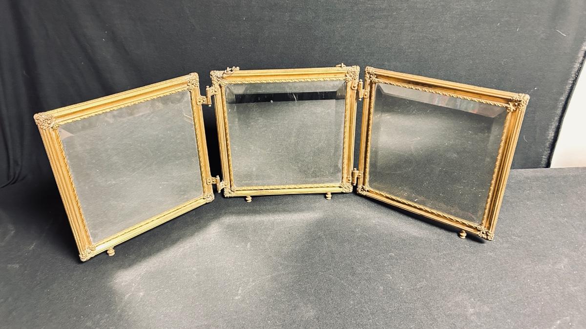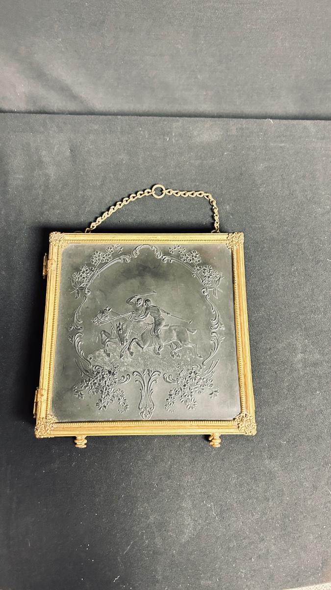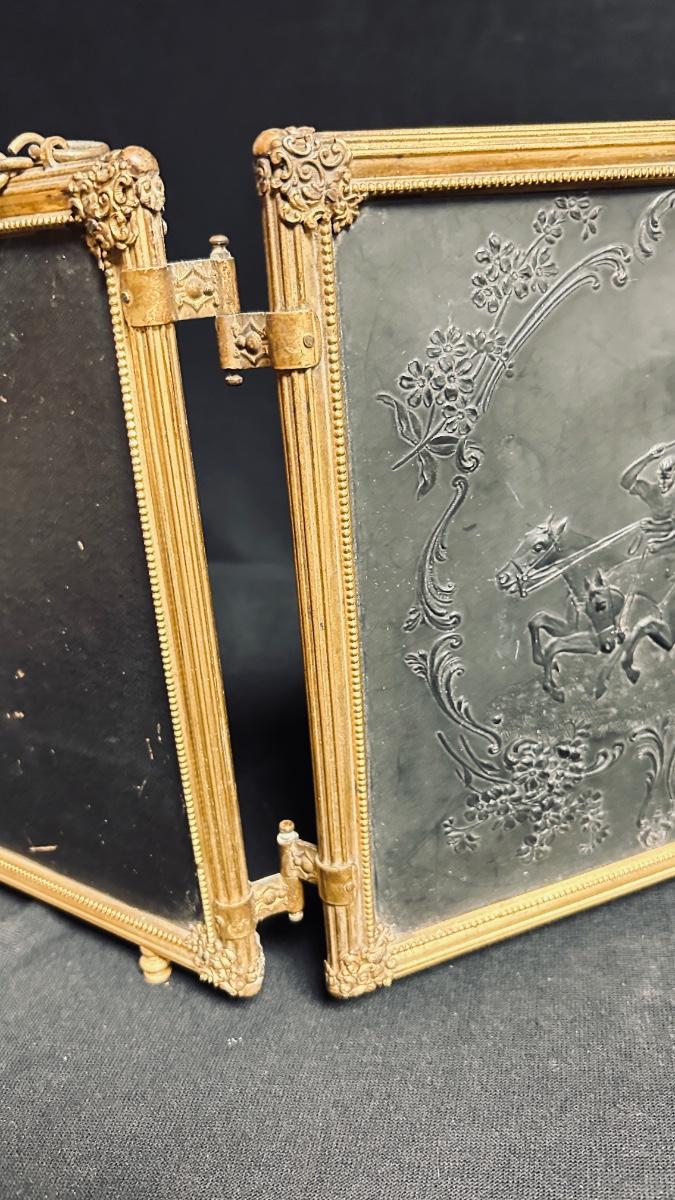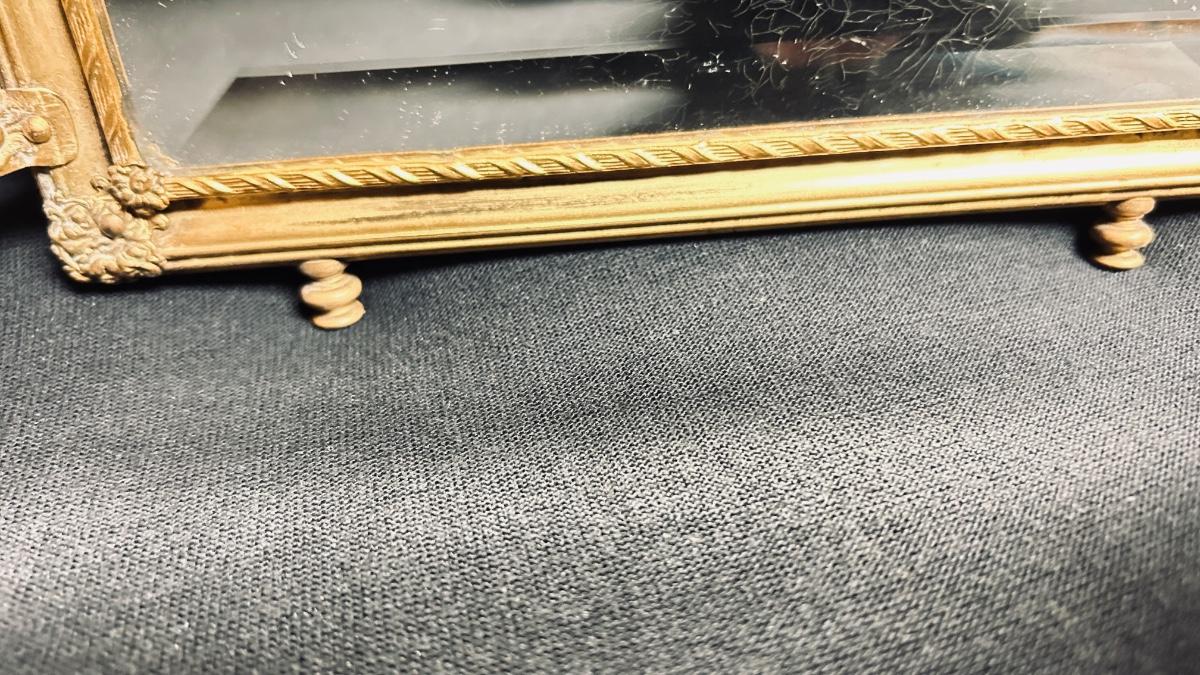 EARLY 20TH CENTURY ORMOLU BARBER MIRROR WITH A LEATHER RAISED DECORATIVE MOTIF