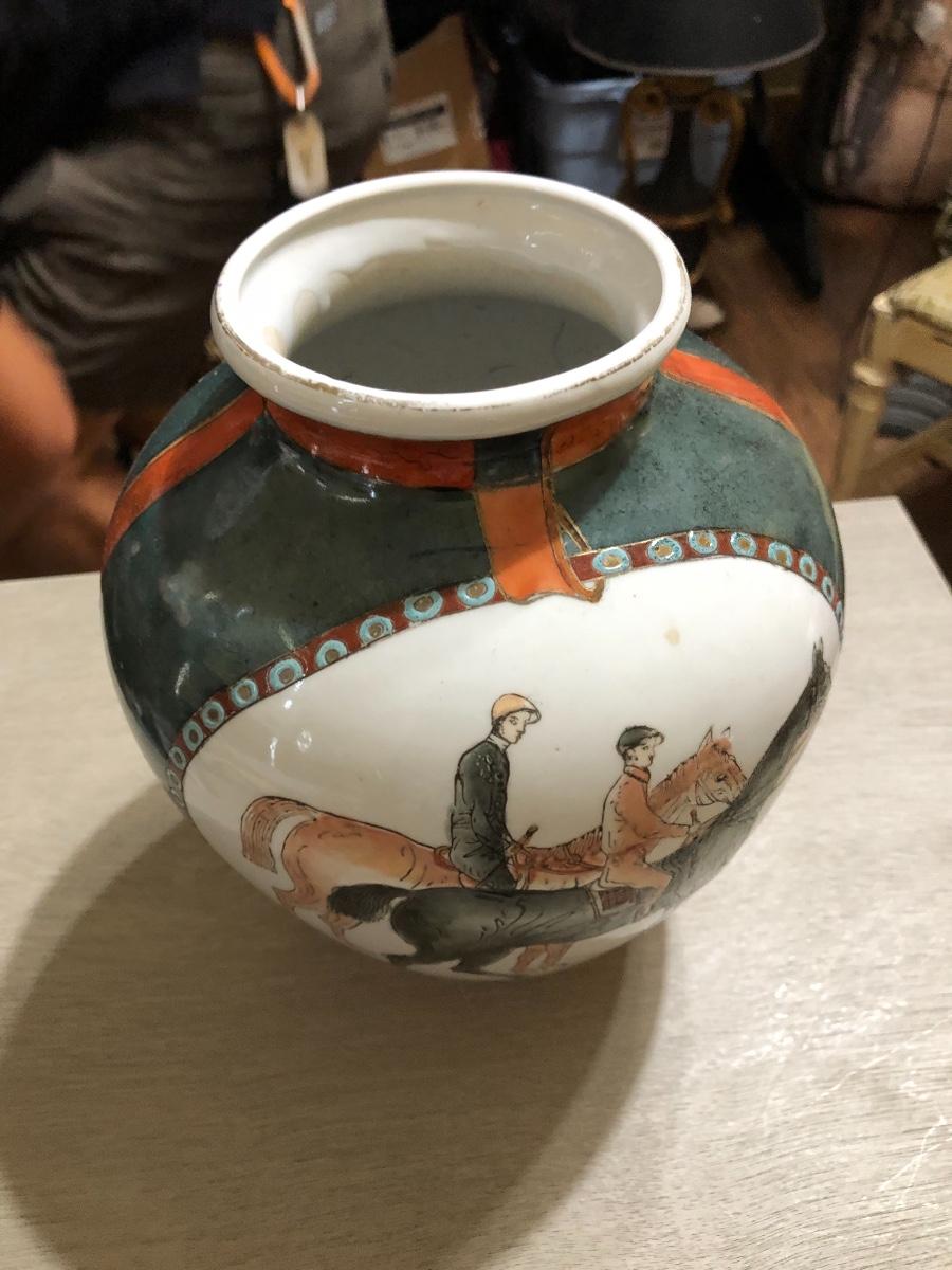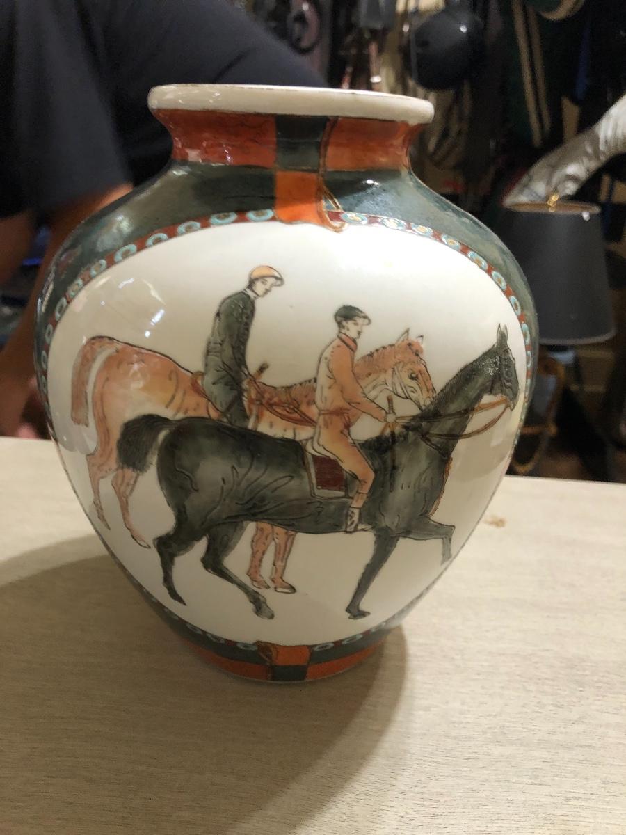 Highly collectable WBI (World Banking Institute) Chinese hand painted porcelain vase. Equestrian/Polo themed with jockey's riding two horses. Both sides feature same imagery. The bridle detail is featured on each side as well. Beautiful exterior texture with accents of gold guilt throughout. Hand painted number for this items is present on underside of vase.