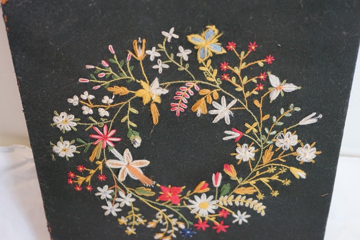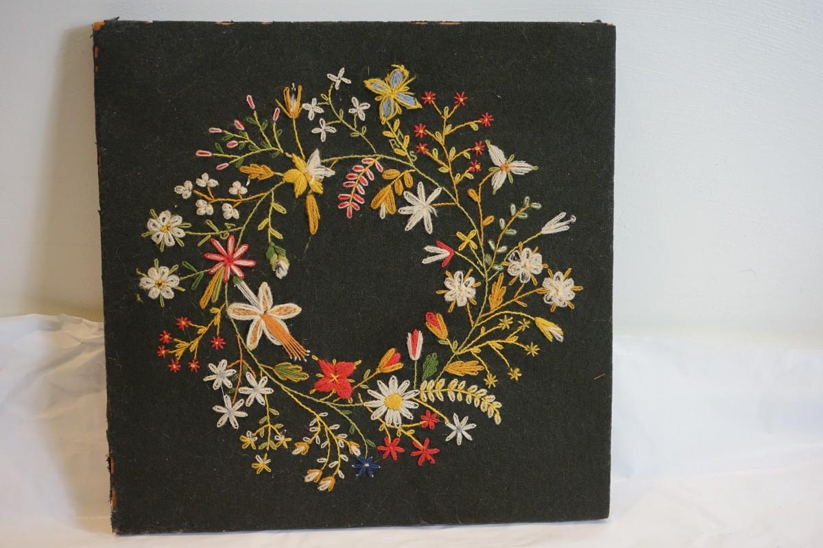very colorful and intricate crewel work in fine yarn on black fabric back ground