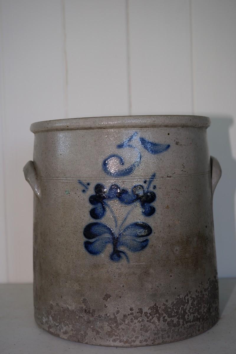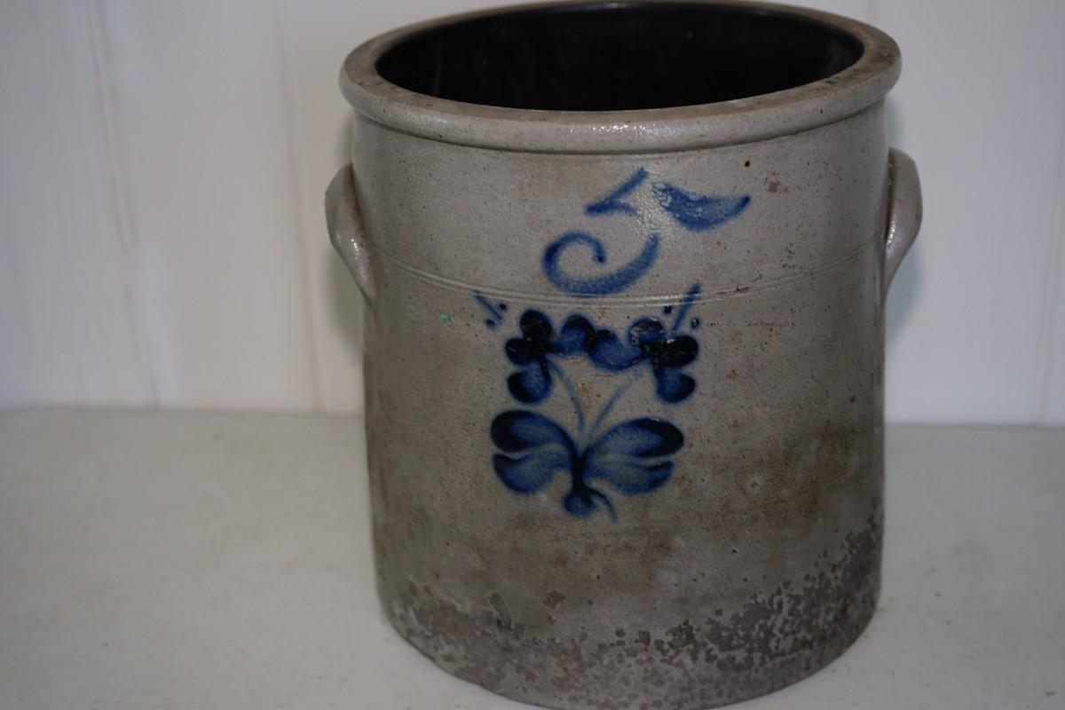 EARLY #5 HANDLED SALT GLAZE AND COBALT BLUE DECORATED HANDLED CROCK