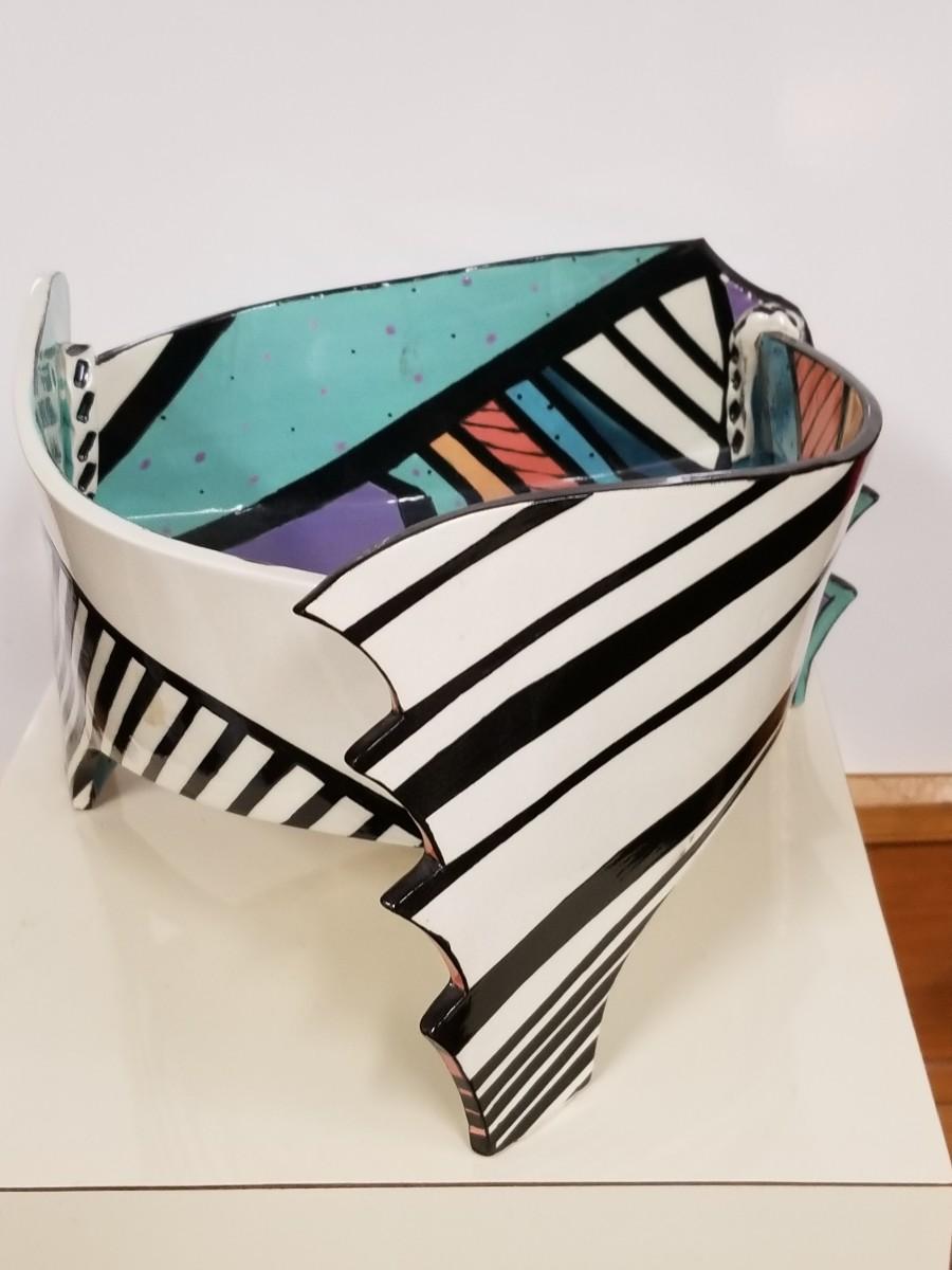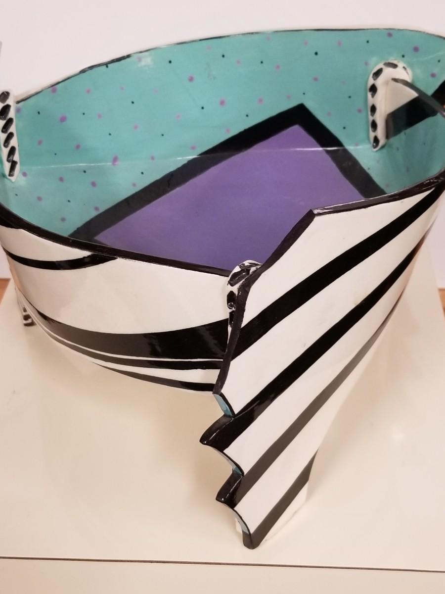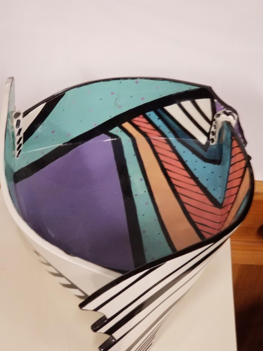 Early 80s ceramic hand-painted art bowl by Dorothy Hafner making a very strong design statement.. please note that horizontal white line on photos is from a reflection and is not a flaw or crack