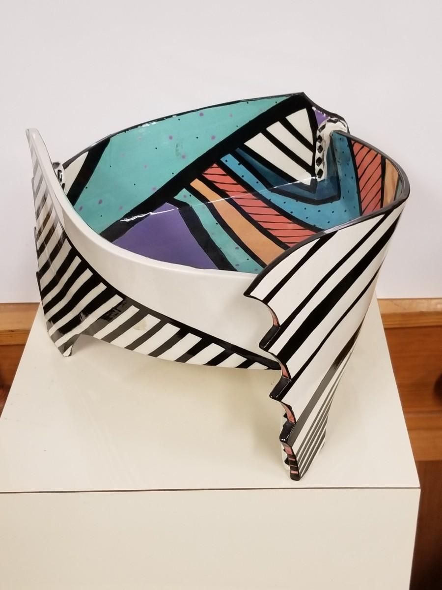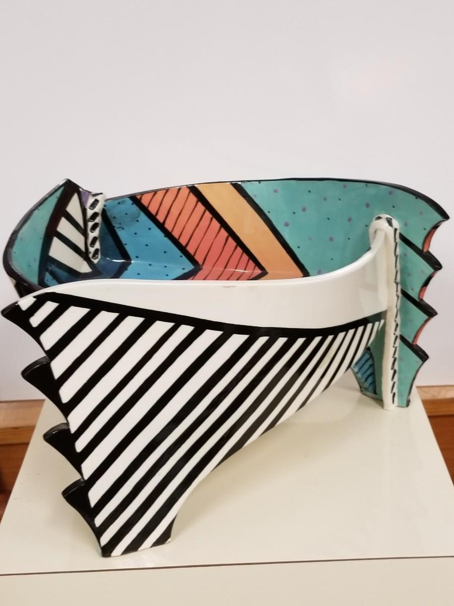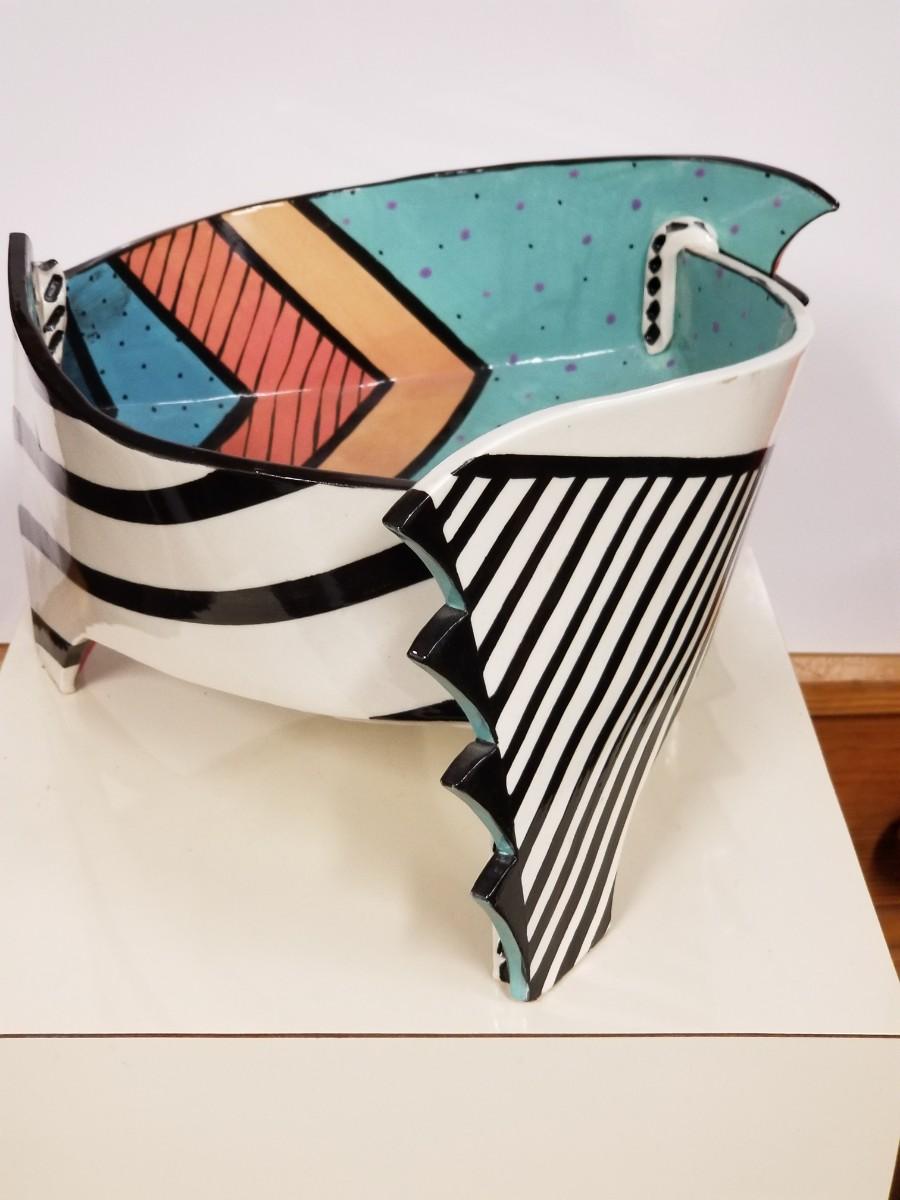 Early 80s ceramic hand-painted art bowl by Dorothy Hafner making a very strong design statement.. please note that horizontal white line on photos is from a reflection and is not a flaw or crack