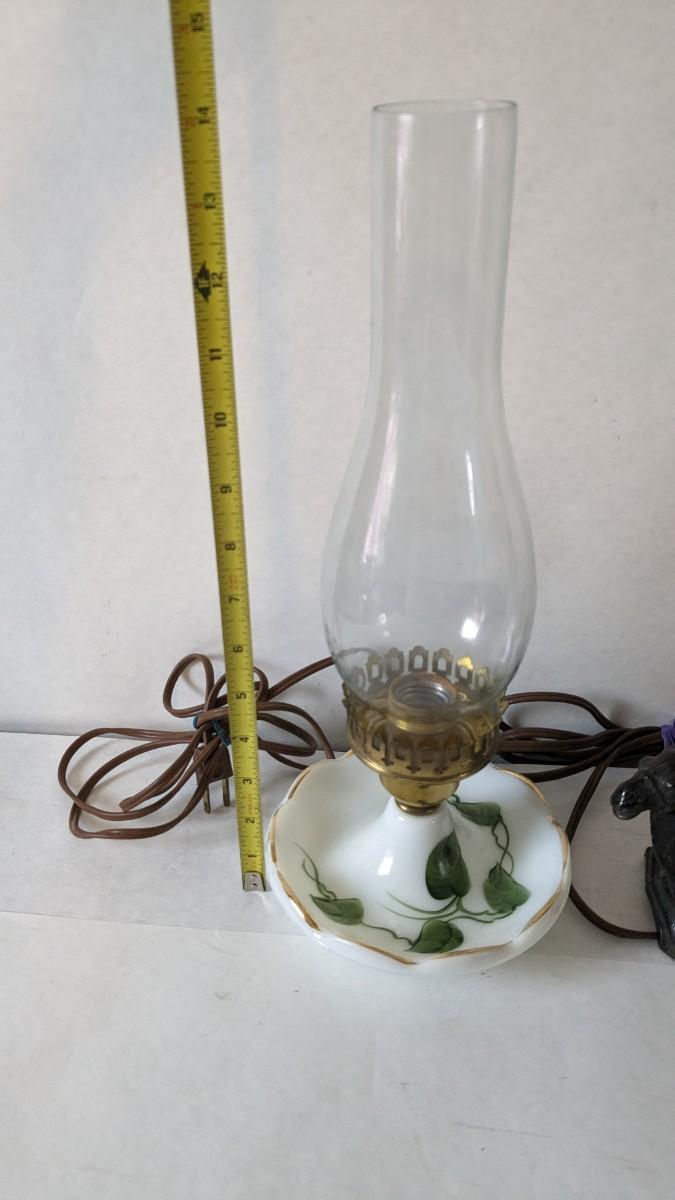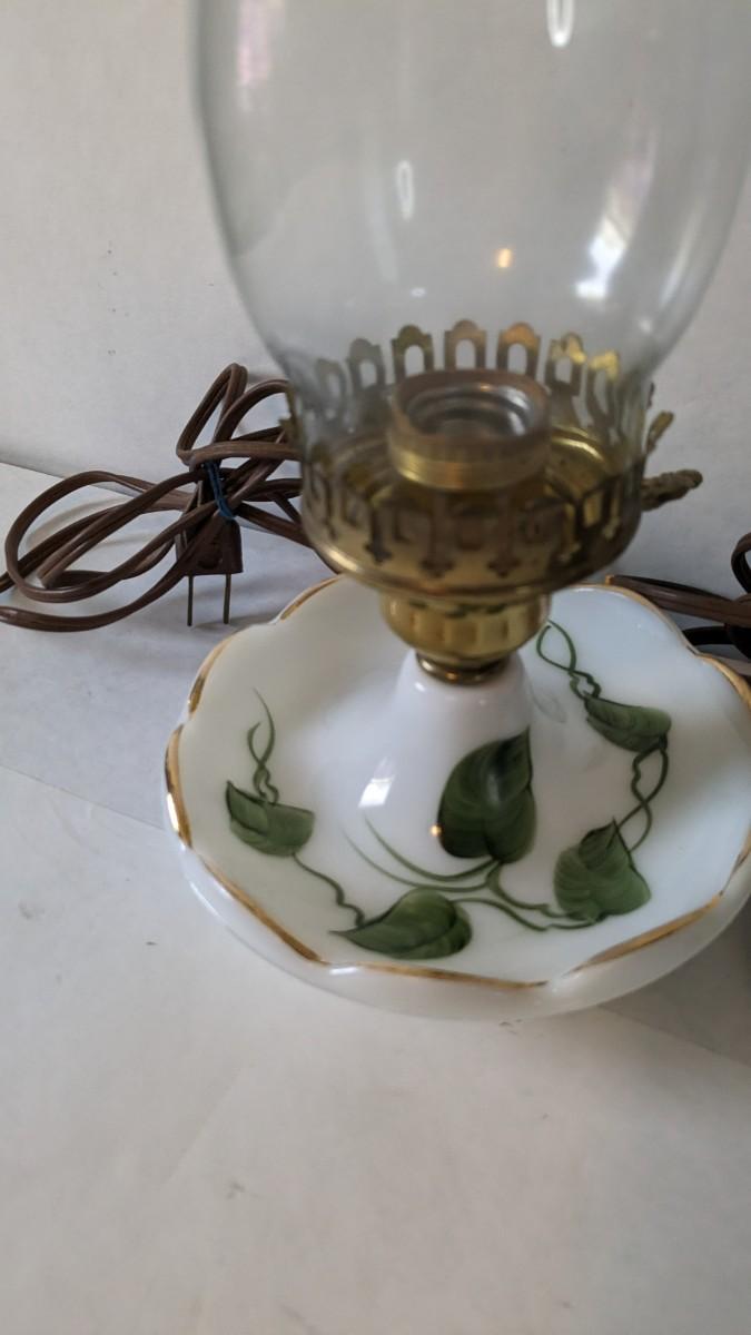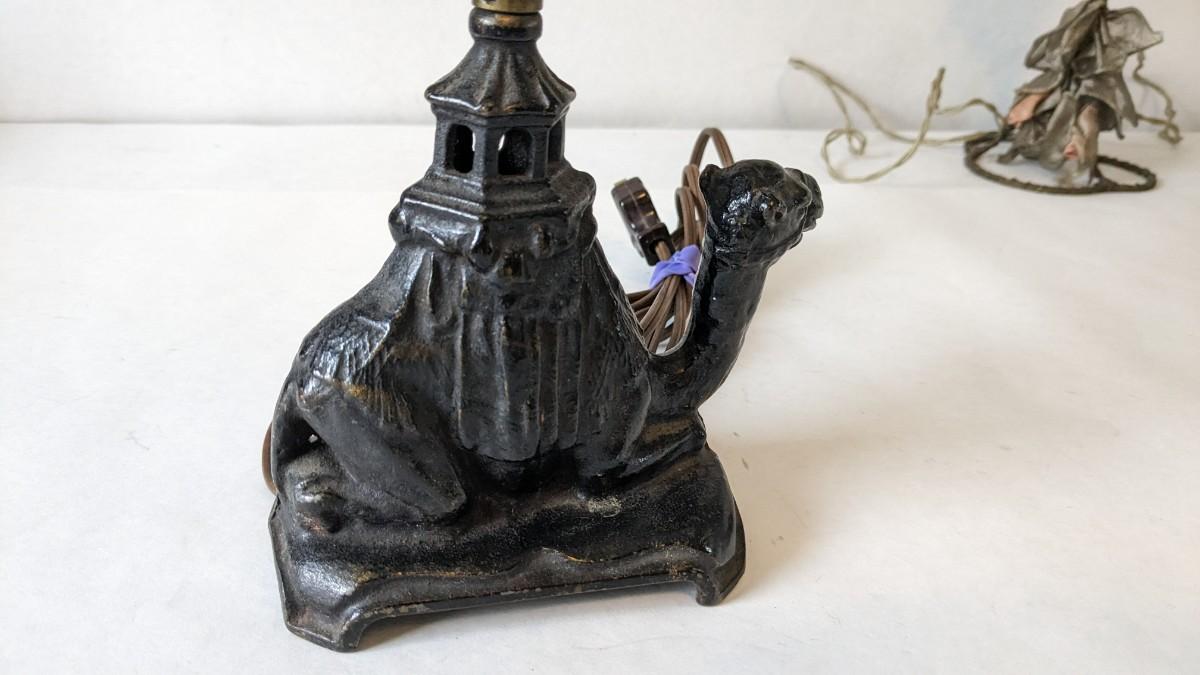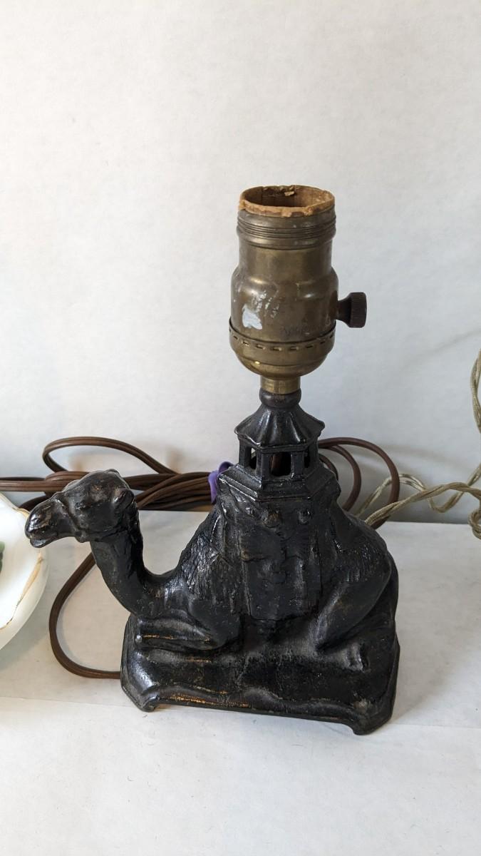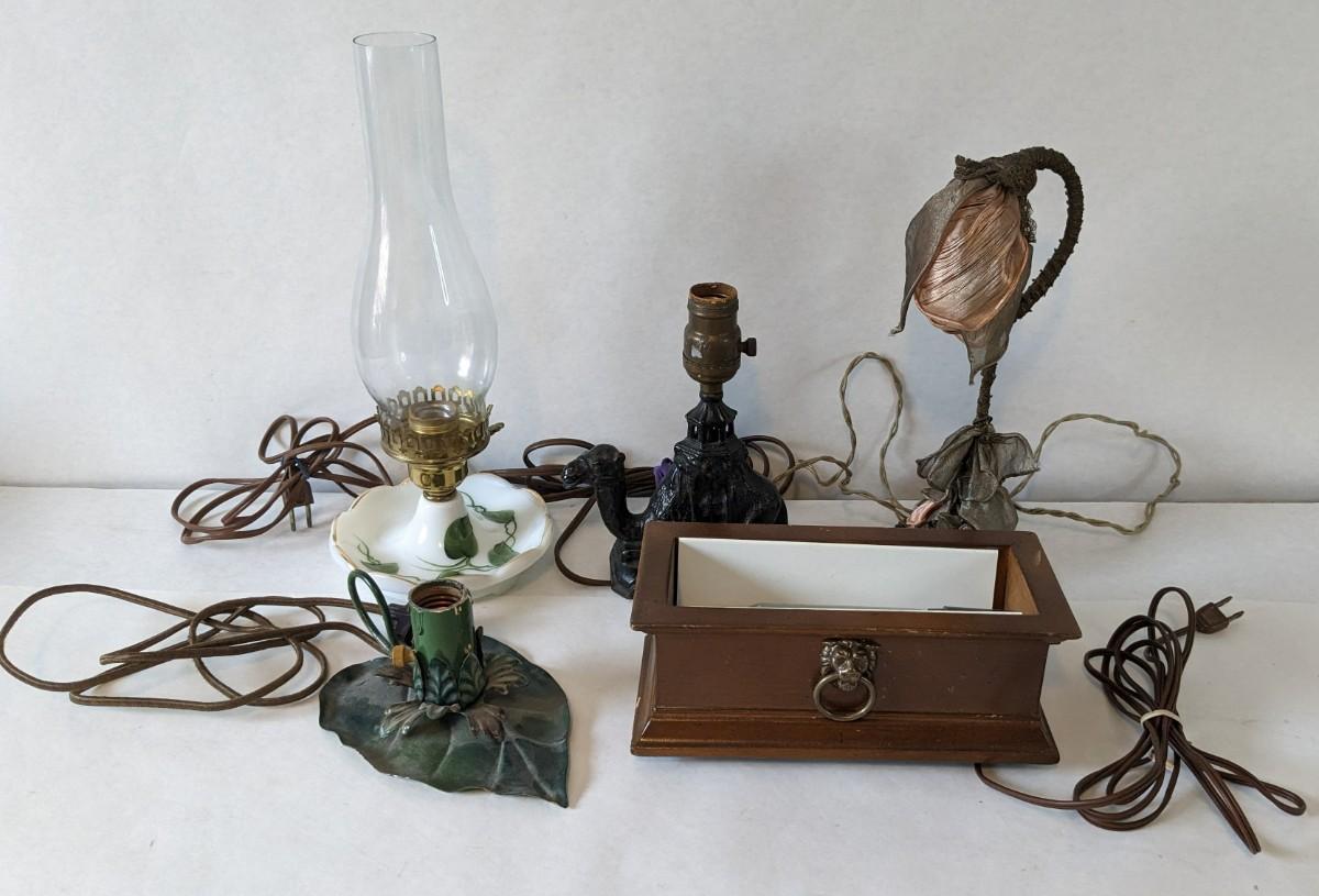 Five varied decade accent lamps including silk wrapped tulip that shows wear, cast iron camel, hand painted milk glass, Ivy leaf, and wood box TV lamp. All cords are in great shape, however new wiring is recommended. Great little assortment