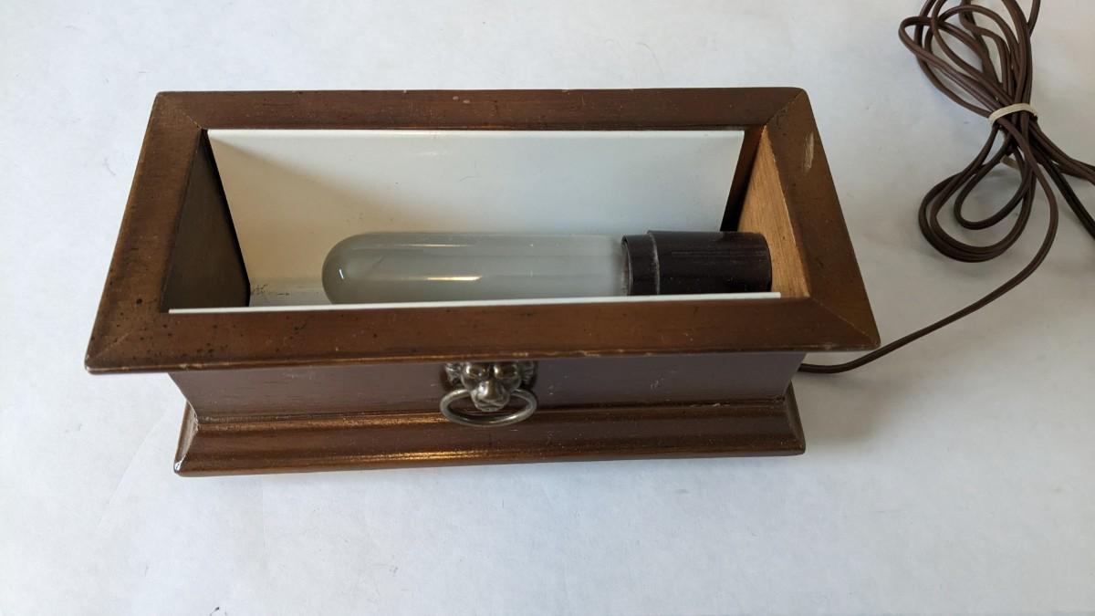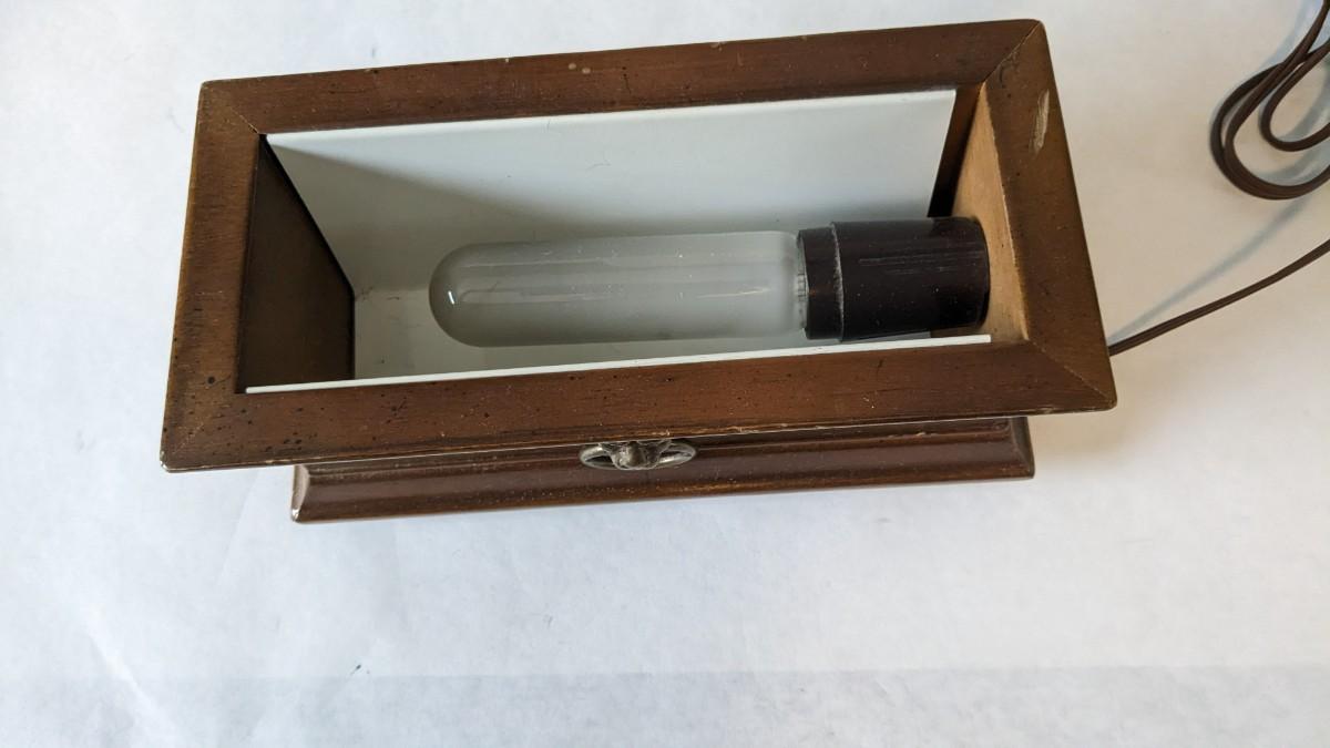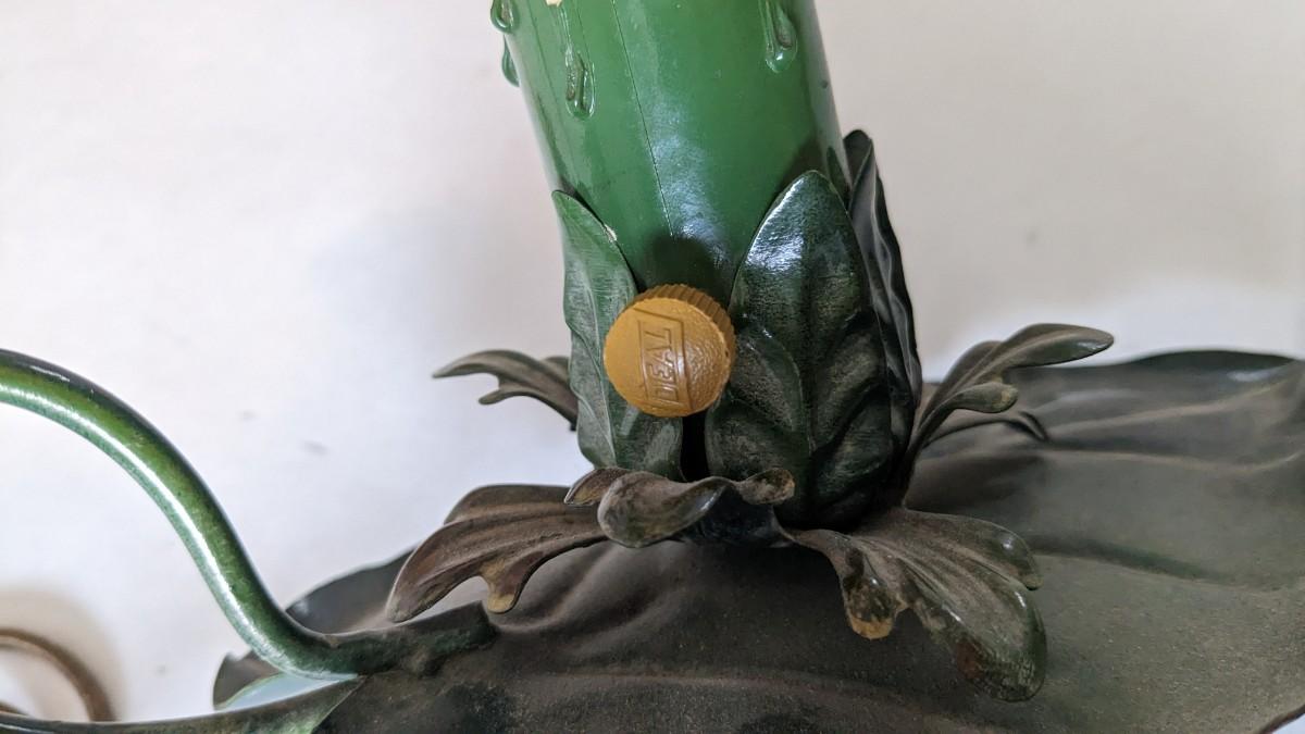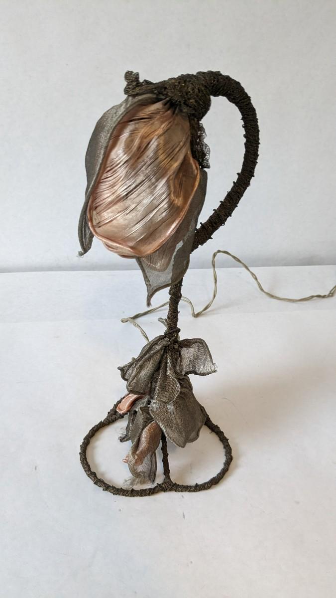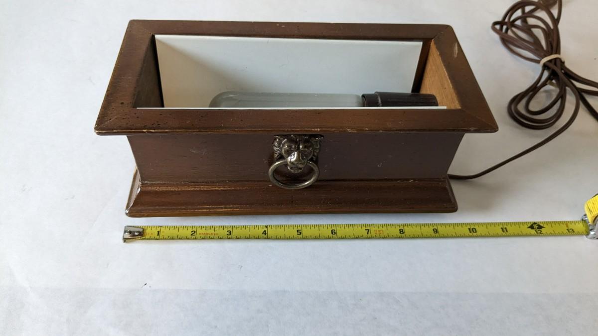 Five varied decade accent lamps including silk wrapped tulip that shows wear, cast iron camel, hand painted milk glass, Ivy leaf, and wood box TV lamp. All cords are in great shape, however new wiring is recommended. Great little assortment