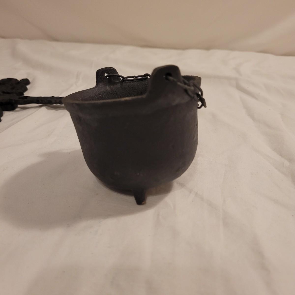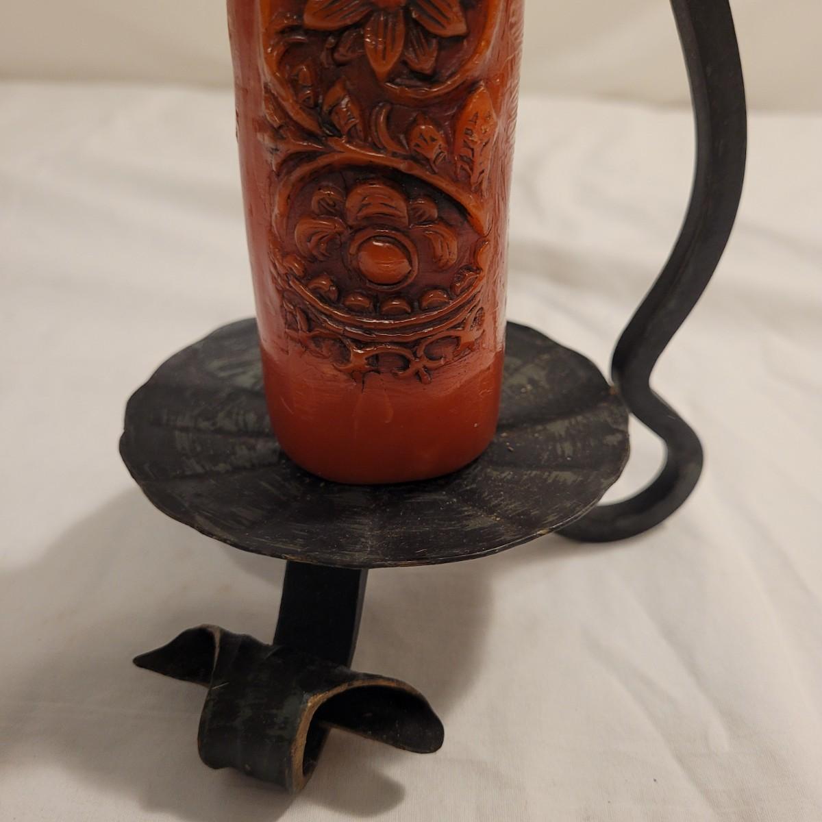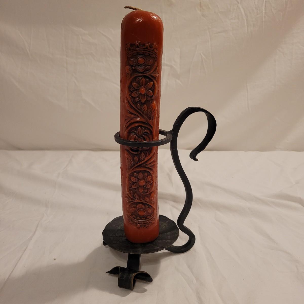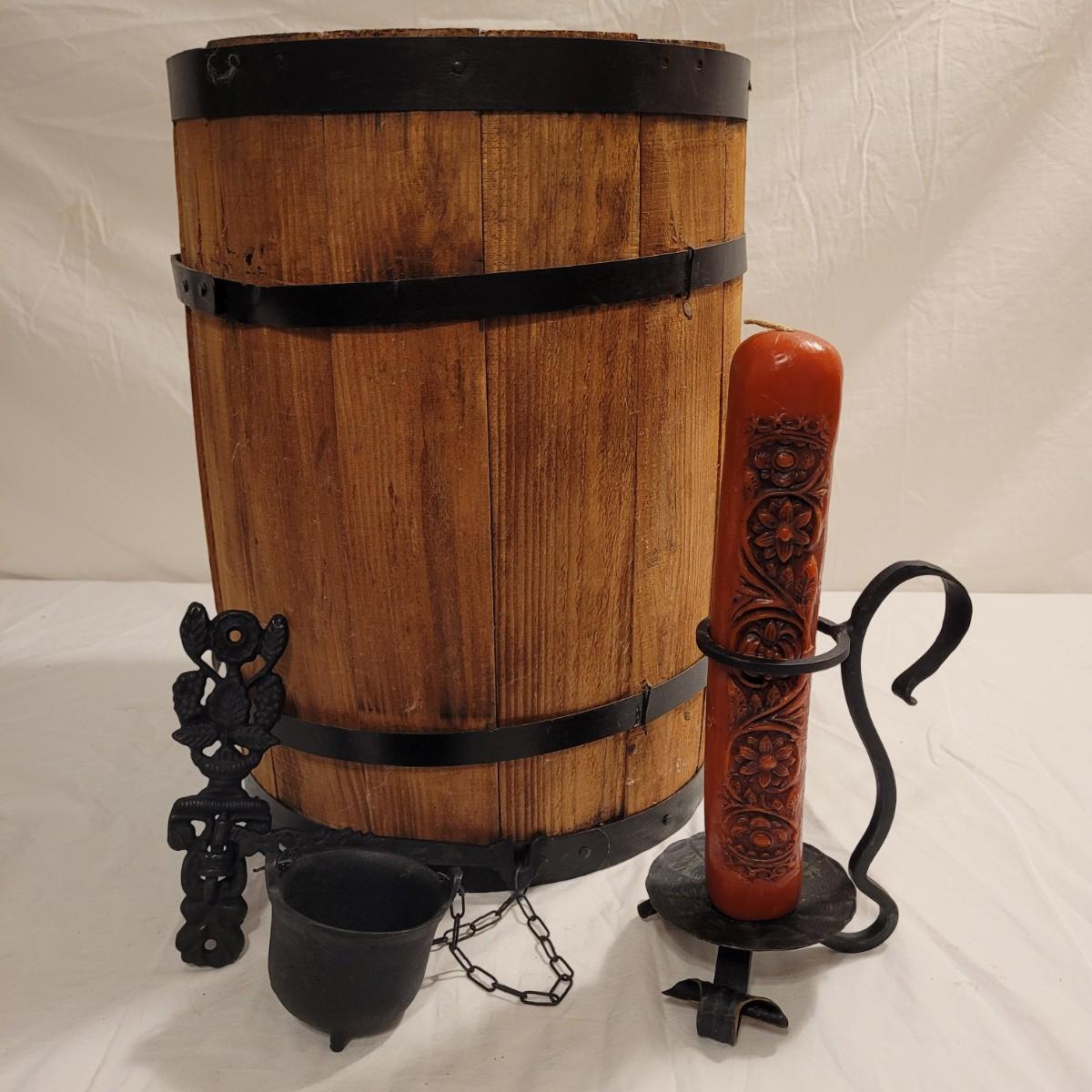 This lot includes three pieces of Early American style decoration. The first item is a a small wooden barrel with metal banding. The barrel measures 12"D x 17"H. The second item is a decorative red candle and metal base. The candle has never been burned. The base features ornate metalwork forming a handle. The last item is a cast iron cauldron wall hanging. It features an ornate floral base, arm with chain, and hanging cauldron or Dutch oven.