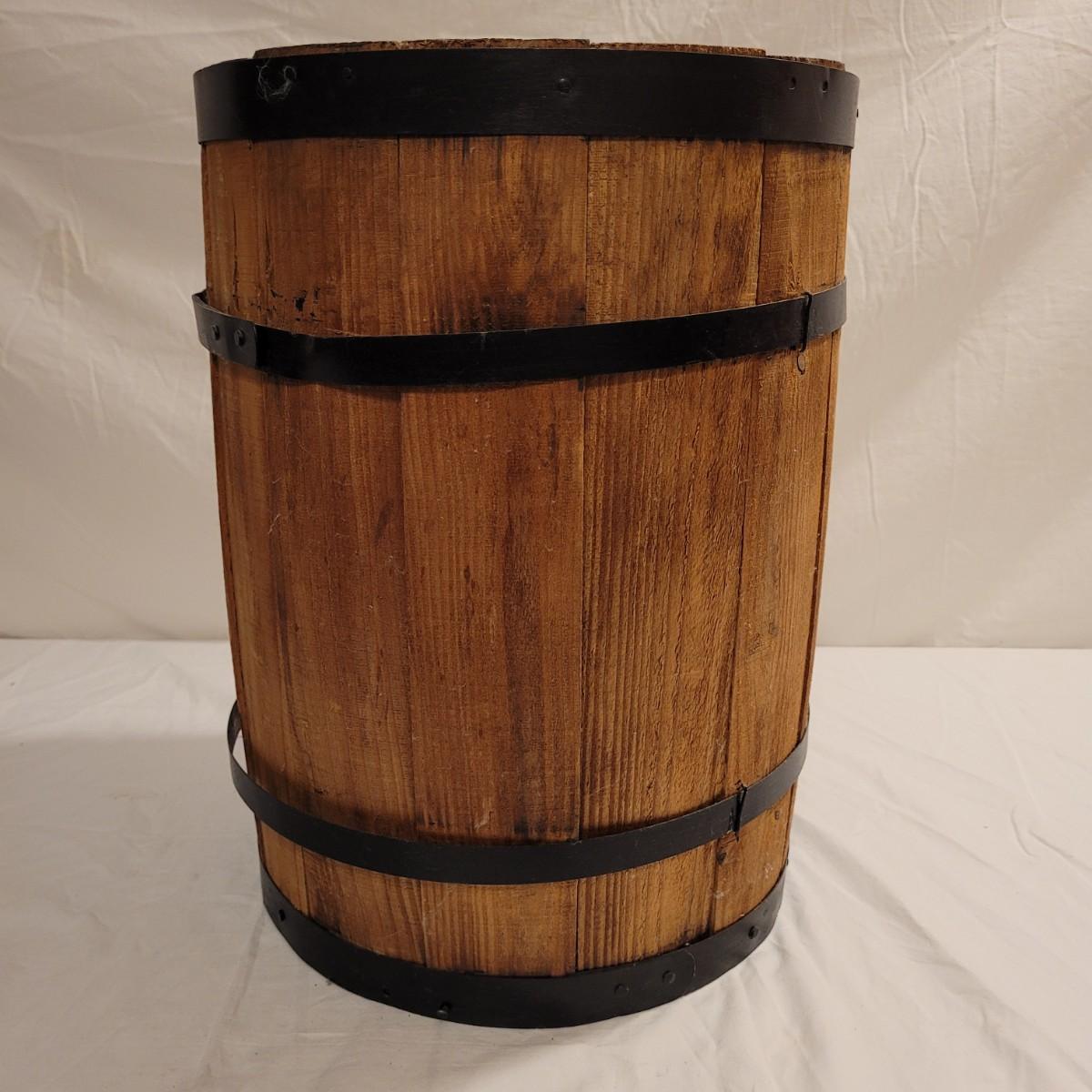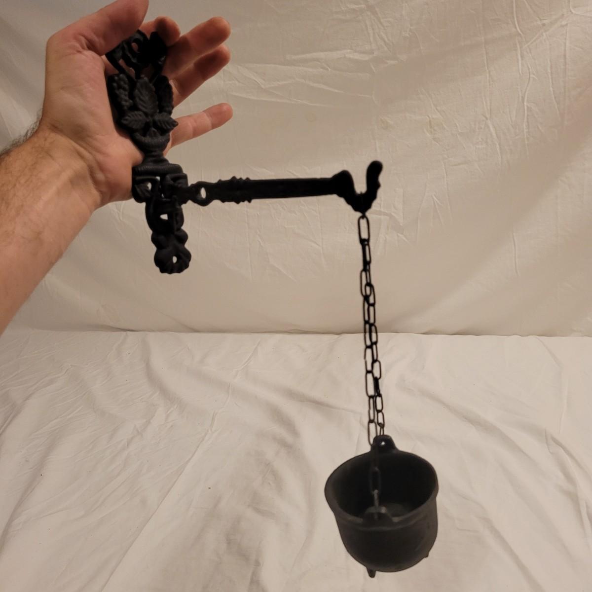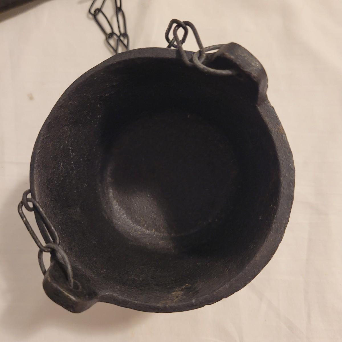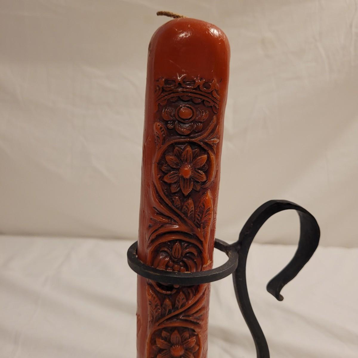 This lot includes three pieces of Early American style decoration. The first item is a a small wooden barrel with metal banding. The barrel measures 12"D x 17"H. The second item is a decorative red candle and metal base. The candle has never been burned. The base features ornate metalwork forming a handle. The last item is a cast iron cauldron wall hanging. It features an ornate floral base, arm with chain, and hanging cauldron or Dutch oven.