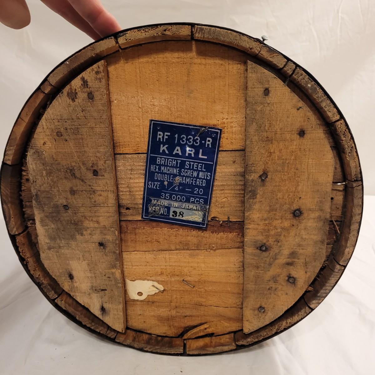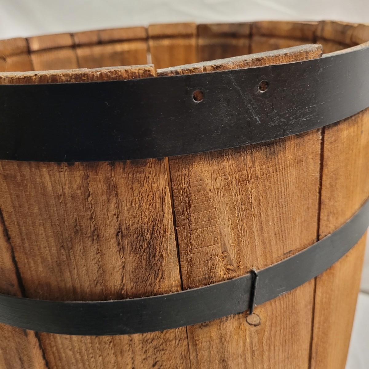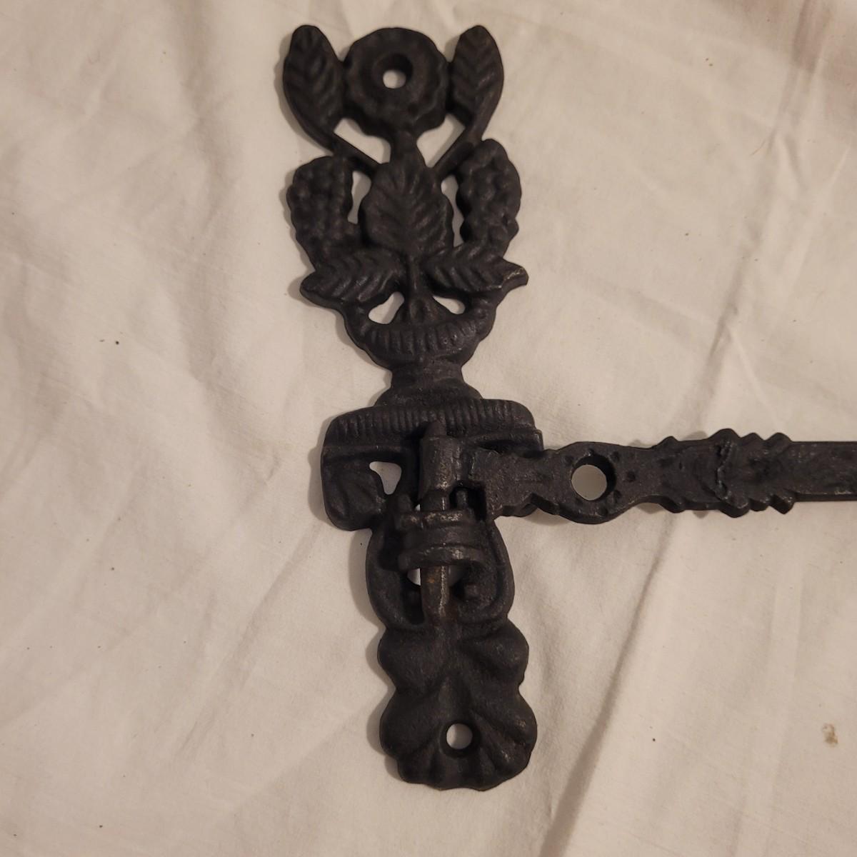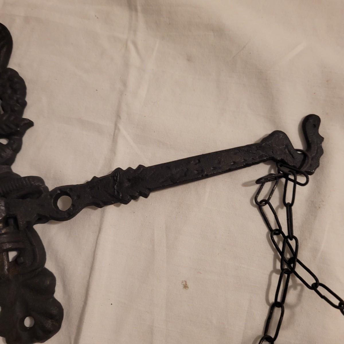 This lot includes three pieces of Early American style decoration. The first item is a a small wooden barrel with metal banding. The barrel measures 12"D x 17"H. The second item is a decorative red candle and metal base. The candle has never been burned. The base features ornate metalwork forming a handle. The last item is a cast iron cauldron wall hanging. It features an ornate floral base, arm with chain, and hanging cauldron or Dutch oven.