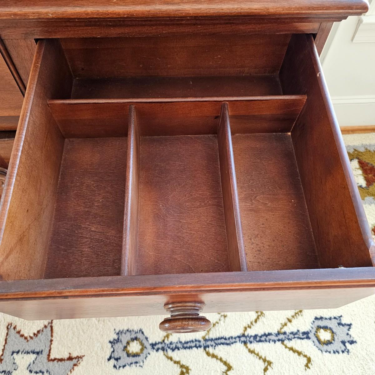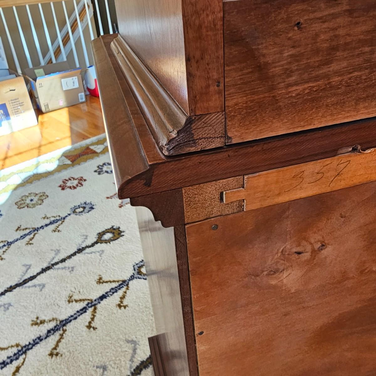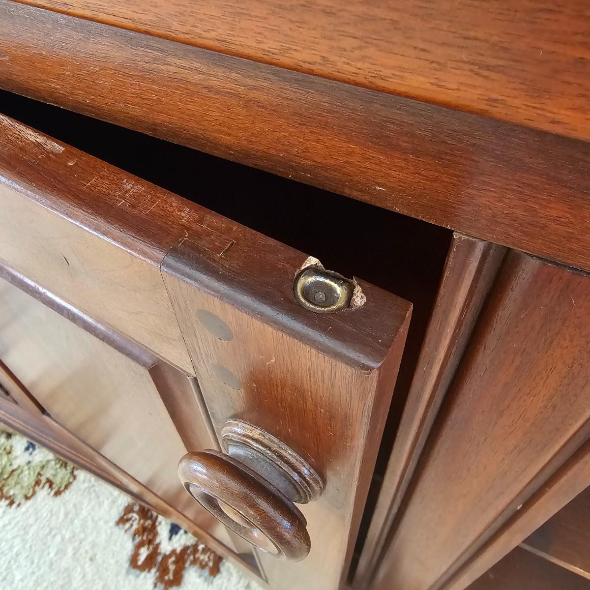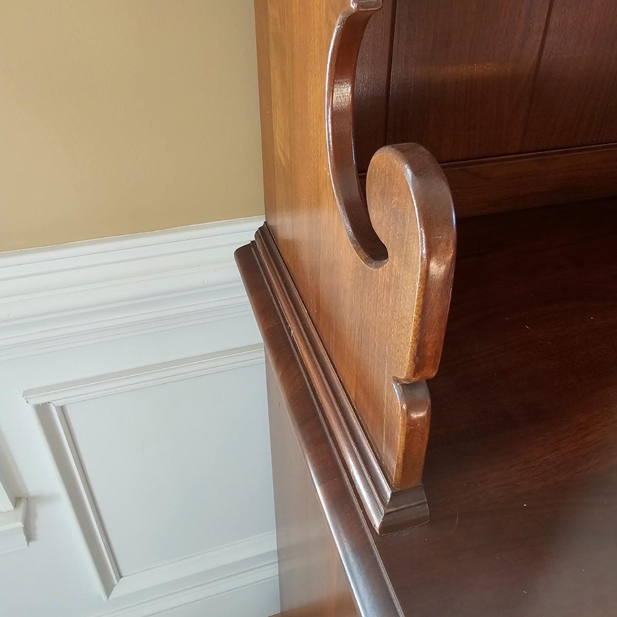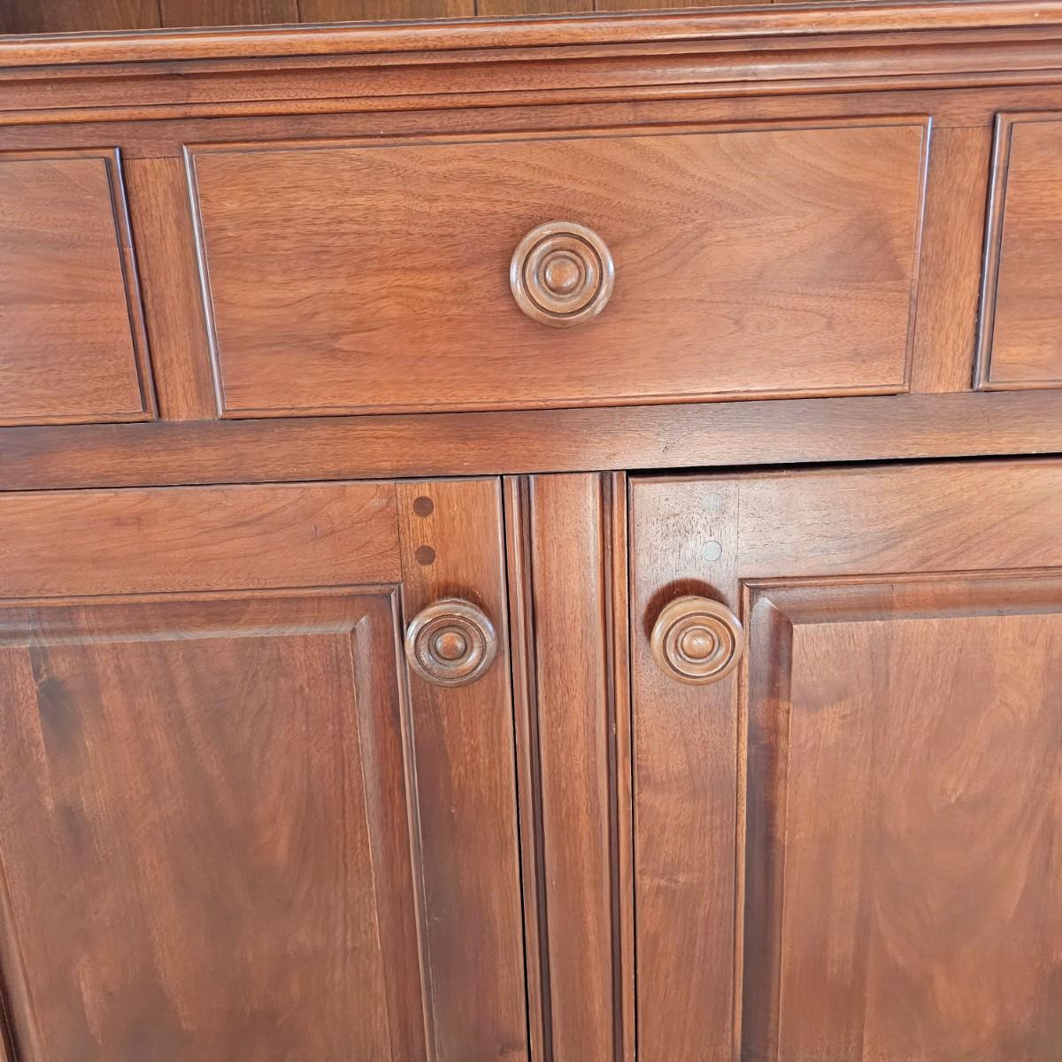 Solid wood hutch top on credenza storage base. Two shelves plus solid top on hutch, panel style back piece. Bottom has two lower doors and shelf plus three dovetail drawers including one for flatware storage. Round wooden door/drawer pulls. Item separates into two pieces, measures 54.5"'x 20" x 71.5" H. See photos for details. Local pickup only. Winning bidder must bring assistance to help move and load this item due to its weight and/or size. Item is located on first floor with access to front door and down two steps to driveway.