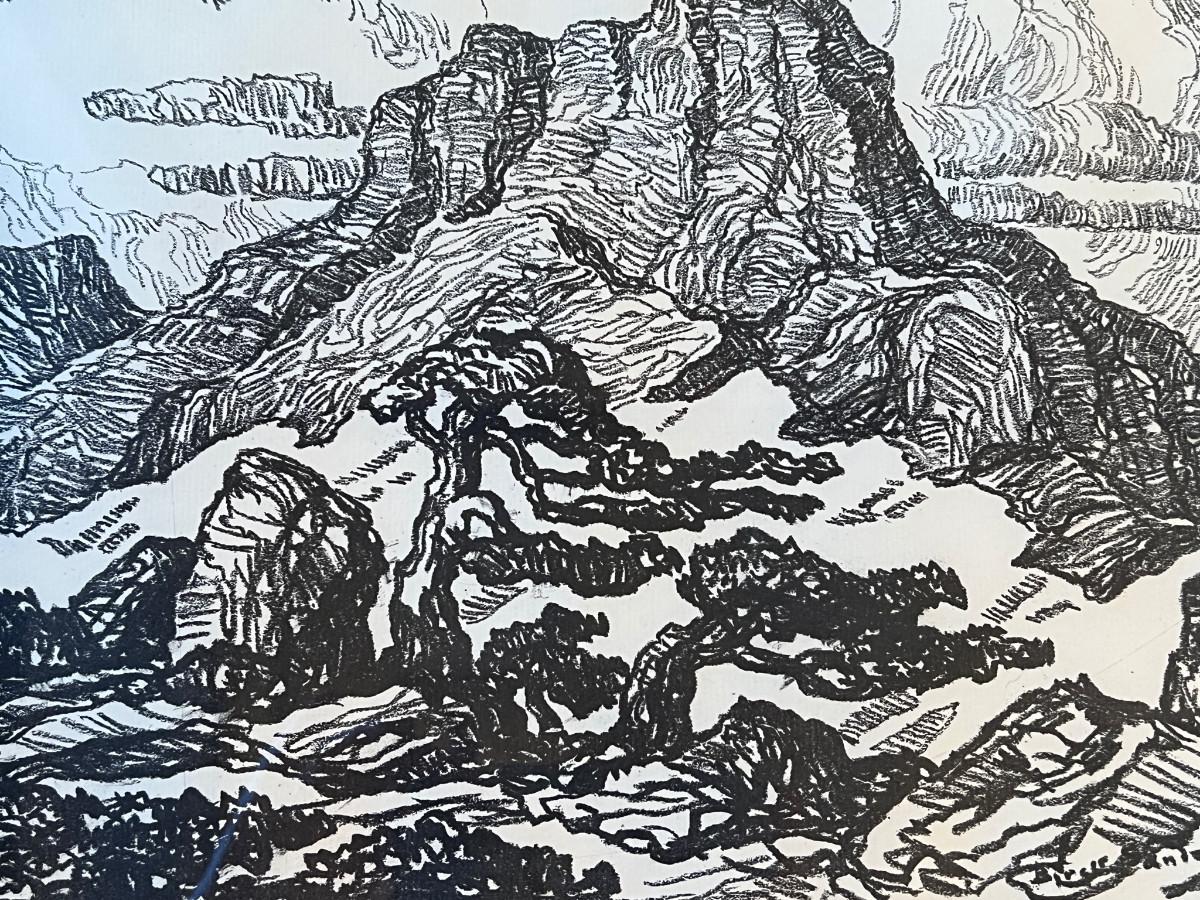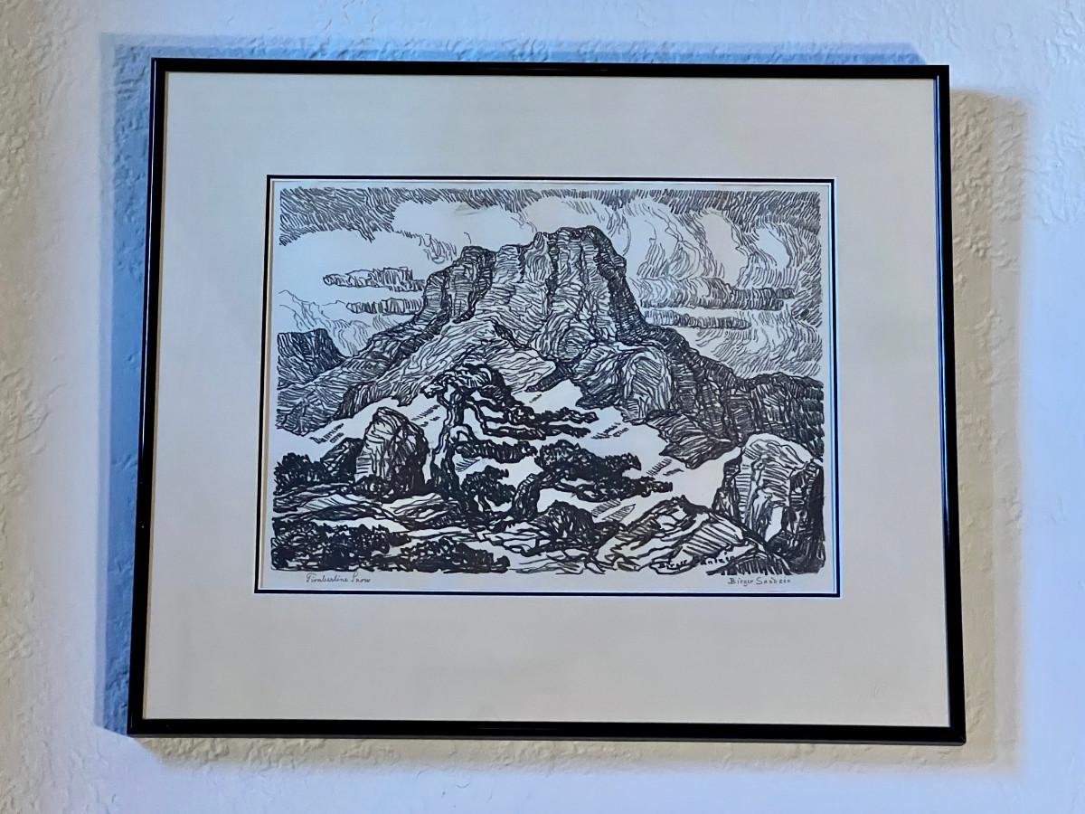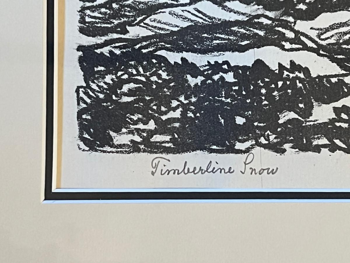 Early Master Swedish Printmaker Birger Sandzen 1925 Signed Lithograph "Timberline Snow". A pencil-signed and titled vista of Pike's Peak, with cedars in the foreground. Executed on cream laid paper. Unusual and dramatic subject matter for this Prairie Printmaker of Pike's Peak mountain. Signed lower right, titled lower left. Back of work indicates age and edition and where this image appears in the catalog. (see photo).
