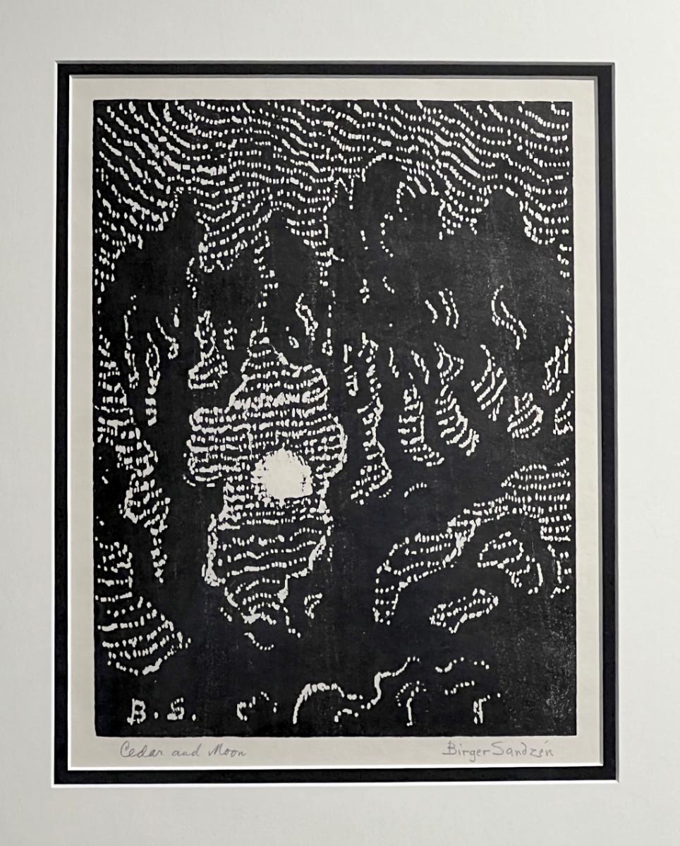 DESCRIPTION: The subject item is an original, signed fine art print by noted and listed Swedish-American artist, Birger Sandzen. The artist has rendered a mature cedar tree bathed in moonlight.