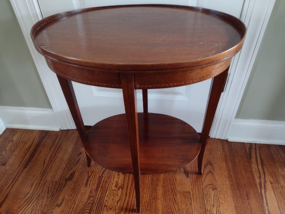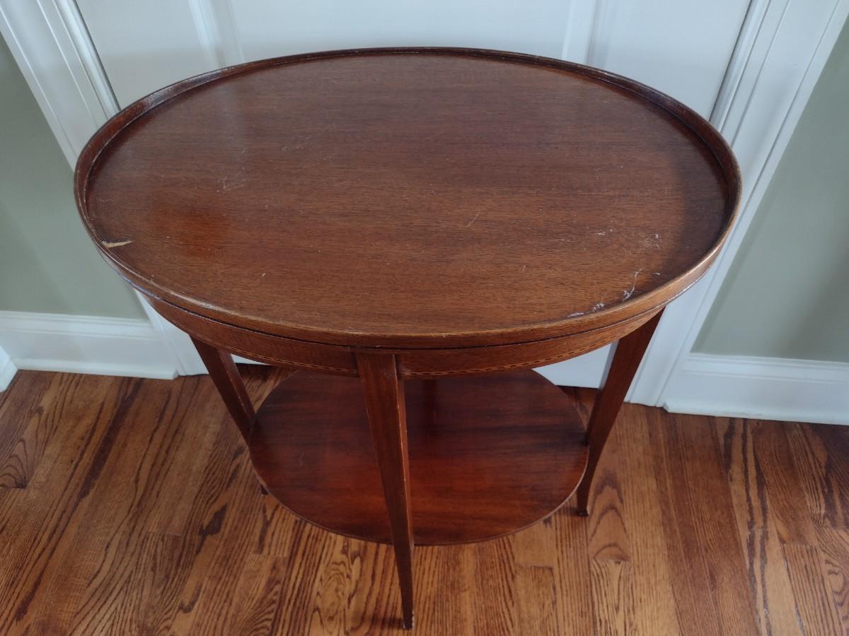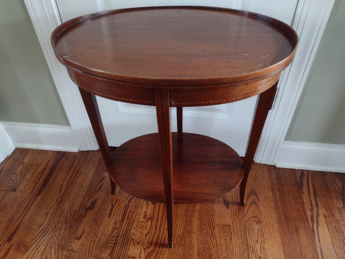 Early Century Sheraton Design Inlaid Banded Oval Accent Table. Has a chip in the wood along top surface as shown.