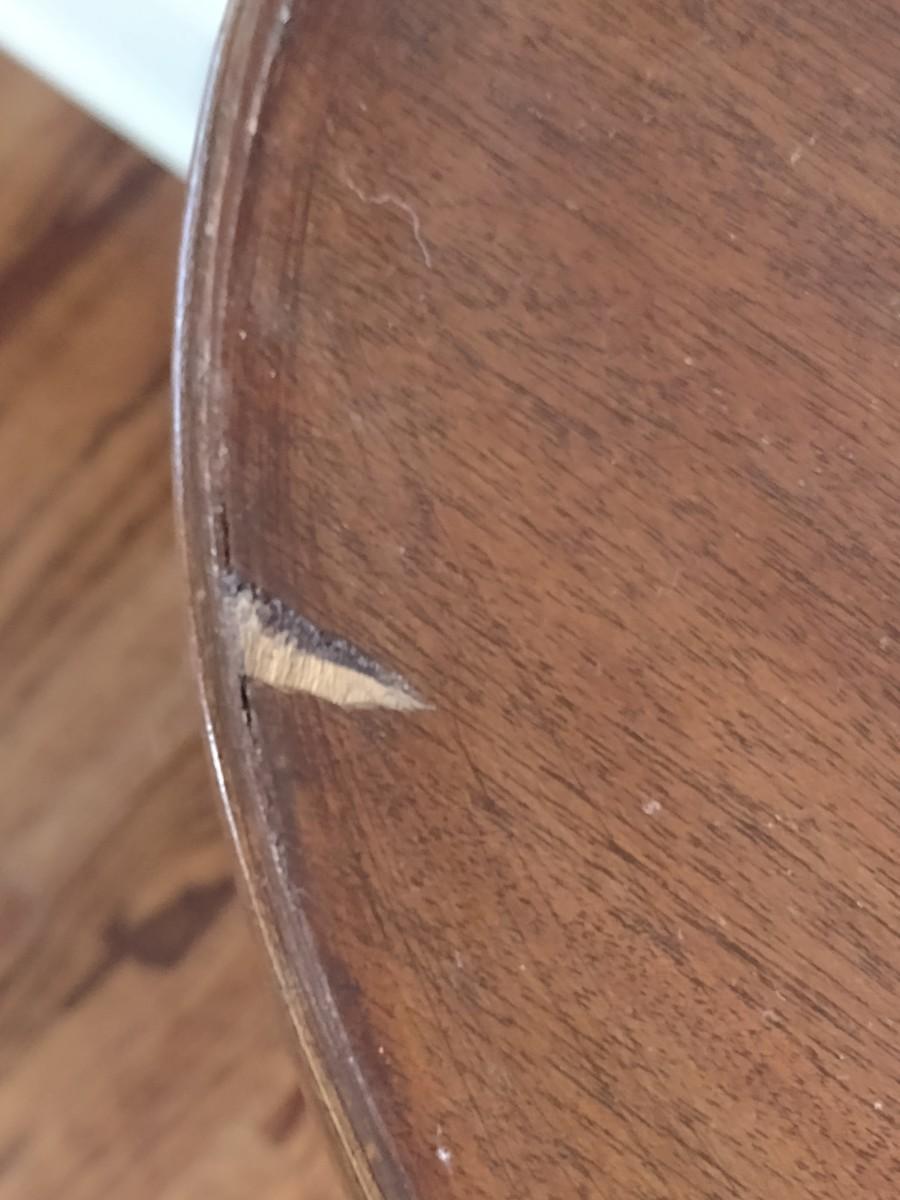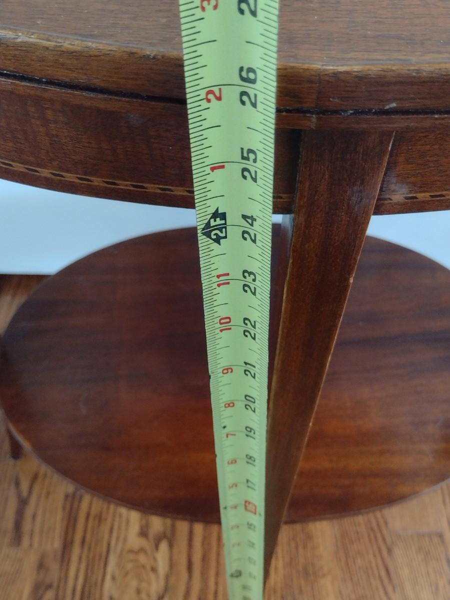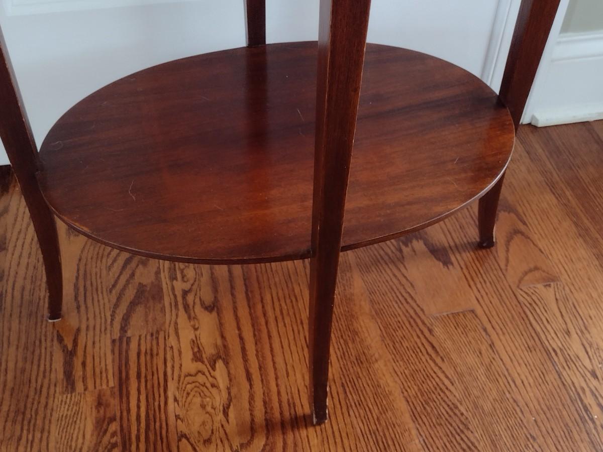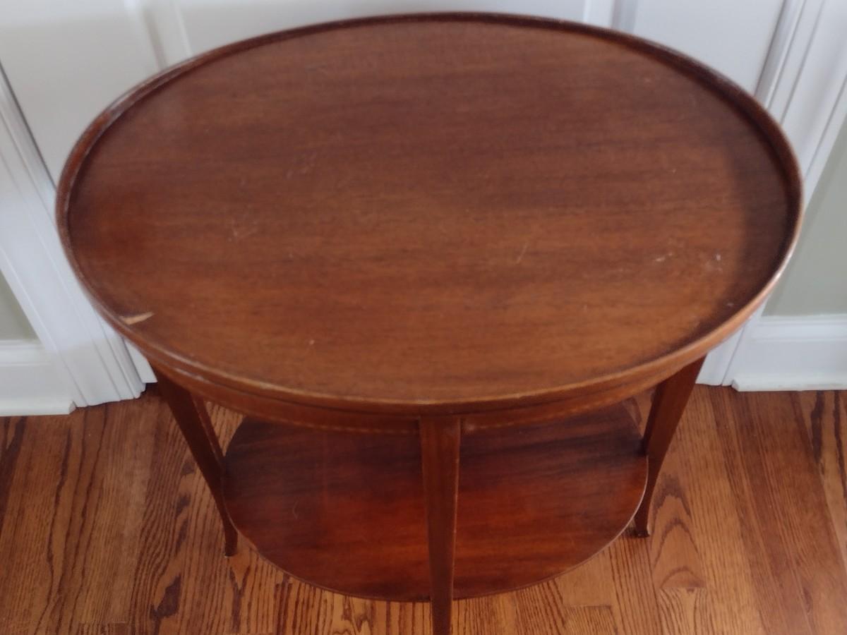 Early Century Sheraton Design Inlaid Banded Oval Accent Table. Has a chip in the wood along top surface as shown.